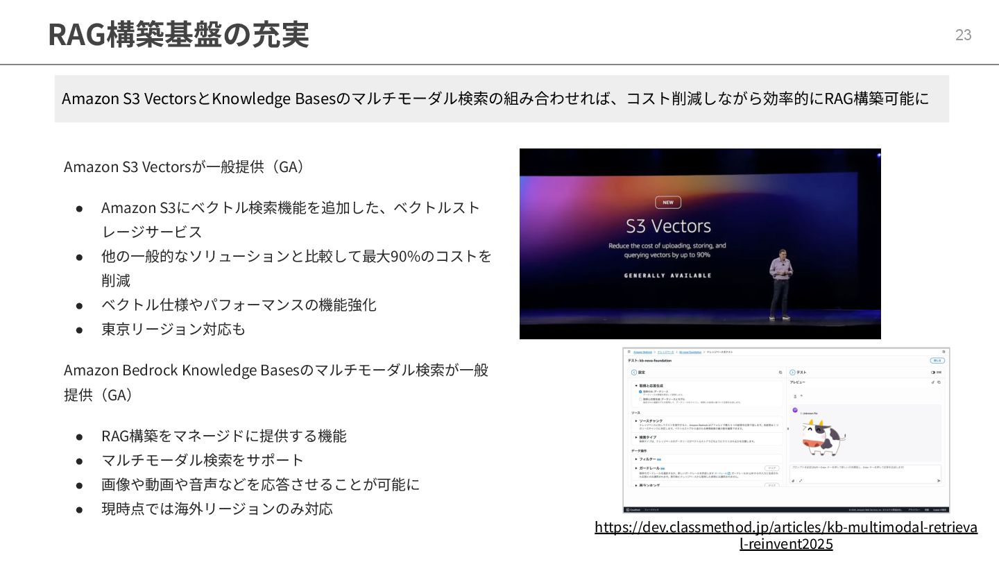 他の⼀般的なソリューションと⽐較して最⼤90%のコストを 削減 • ベクトル仕様やパフォーマンスの機能強化 • 東京リージョン対応も Amazon Bedrock Knowledge Basesのマルチモーダル検索が⼀般 提供(GA) • RAG構築をマネージドに提供する機能 • マルチモーダル検索をサポート • 画像や動画や⾳声などを応答させることが可能に • 現時点では海外リージョンのみ対応 Amazon S3 VectorsとKnowledge Basesのマルチモーダル検索の組み合わせれば、コスト削減しながら効率的にRAG構築可能に https://dev.classmethod.jp/articles/kb-multimodal-retrieva l-reinvent2025