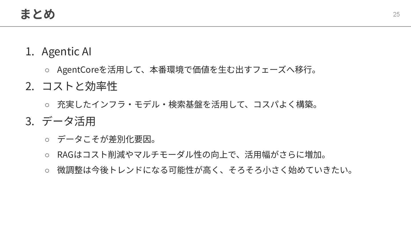11. まとめ 25 1. Agentic AI ◦ AgentCoreを活⽤して、本番環境で価値を⽣む出すフェーズへ移⾏。 2. コストと効率性 ◦