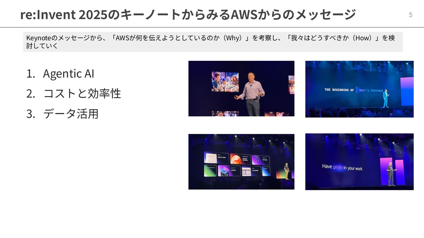 2. re:Invent 2025のキーノートからみるAWSからのメッセージ 5 1. Agentic AI 2. コストと効率性 3. データ活⽤