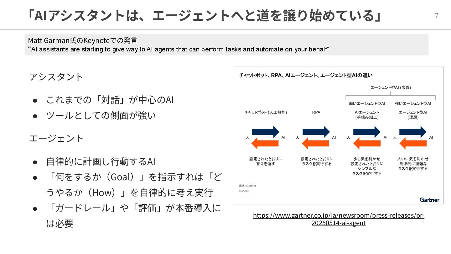• 「何をするか(Goal)」を指⽰すれば「ど うやるか(How)」を⾃律的に考え実⾏ • 「ガードレール」や「評価」が本番導⼊に は必要 Matt Garman⽒のKeynoteでの発⾔ “AI assistants are starting to give way to AI agents that can perform tasks and automate on your behalf” https://www.gartner.co.jp/ja/newsroom/press-releases/pr- 20250514-ai-agent