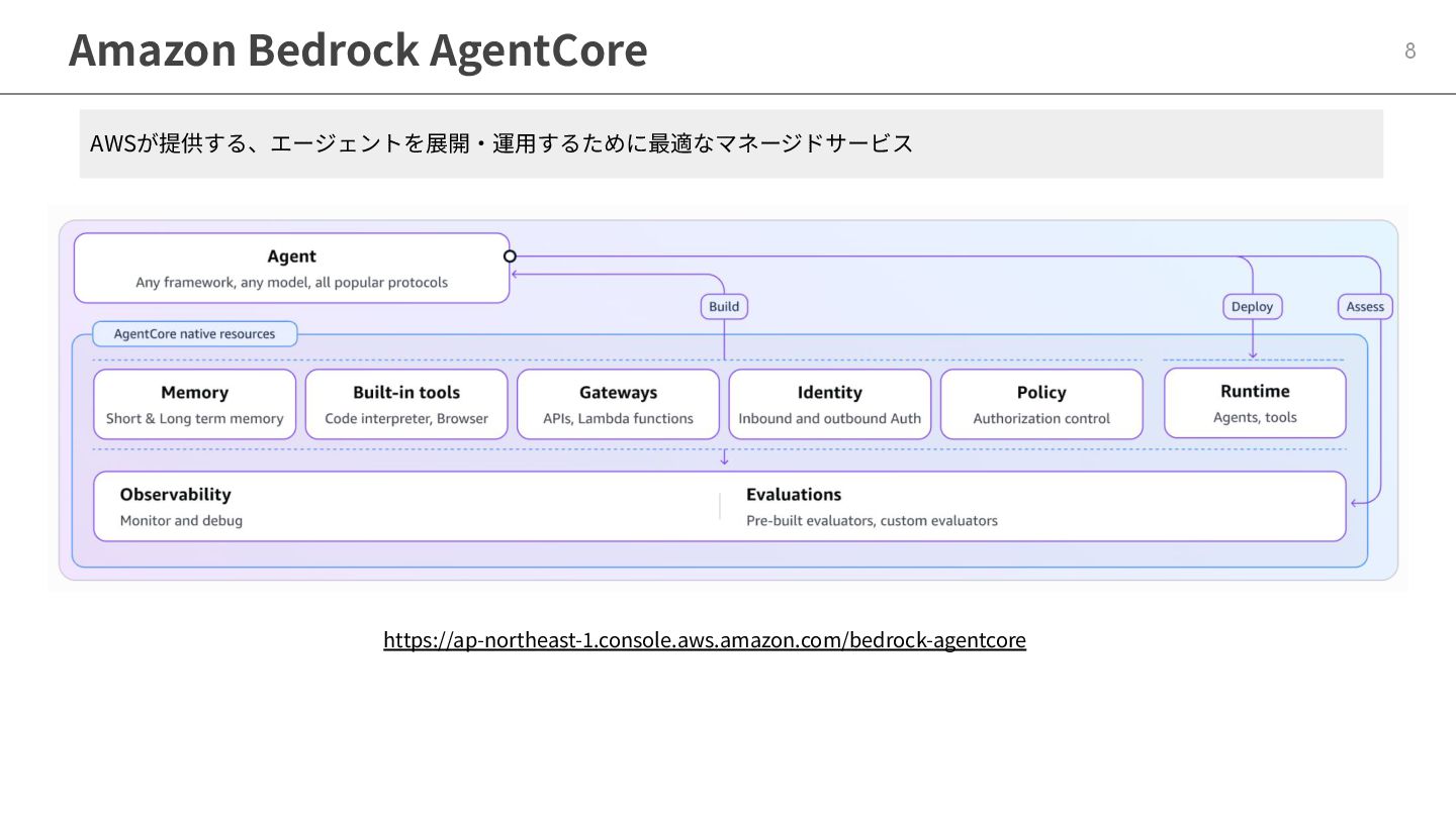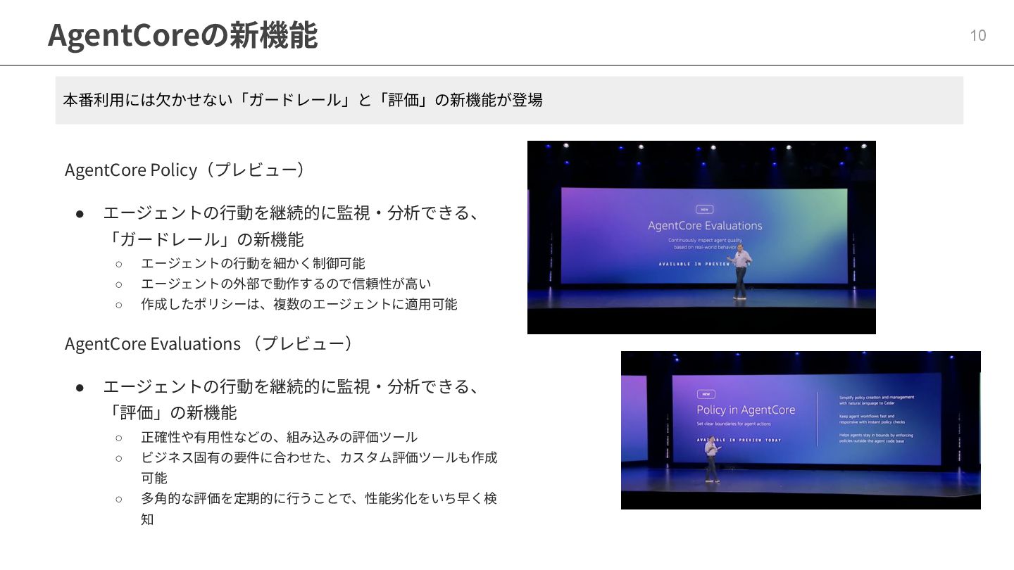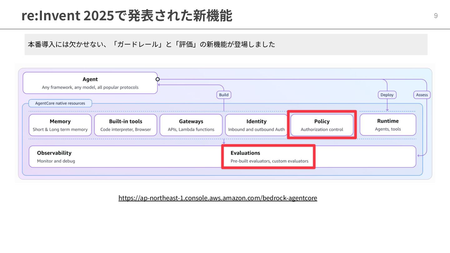 エージェントの外部で動作するので信頼性が⾼い ◦ 作成したポリシーは、複数のエージェントに適⽤可能 AgentCore Evaluations (プレビュー) • エージェントの⾏動を継続的に監視‧分析できる、 「評価」の新機能 ◦ 正確性や有⽤性などの、組み込みの評価ツール ◦ ビジネス固有の要件に合わせた、カスタム評価ツールも作成 可能 ◦ 多⾓的な評価を定期的に⾏うことで、性能劣化をいち早く検 知 本番利⽤には⽋かせない「ガードレール」と「評価」の新機能が登場