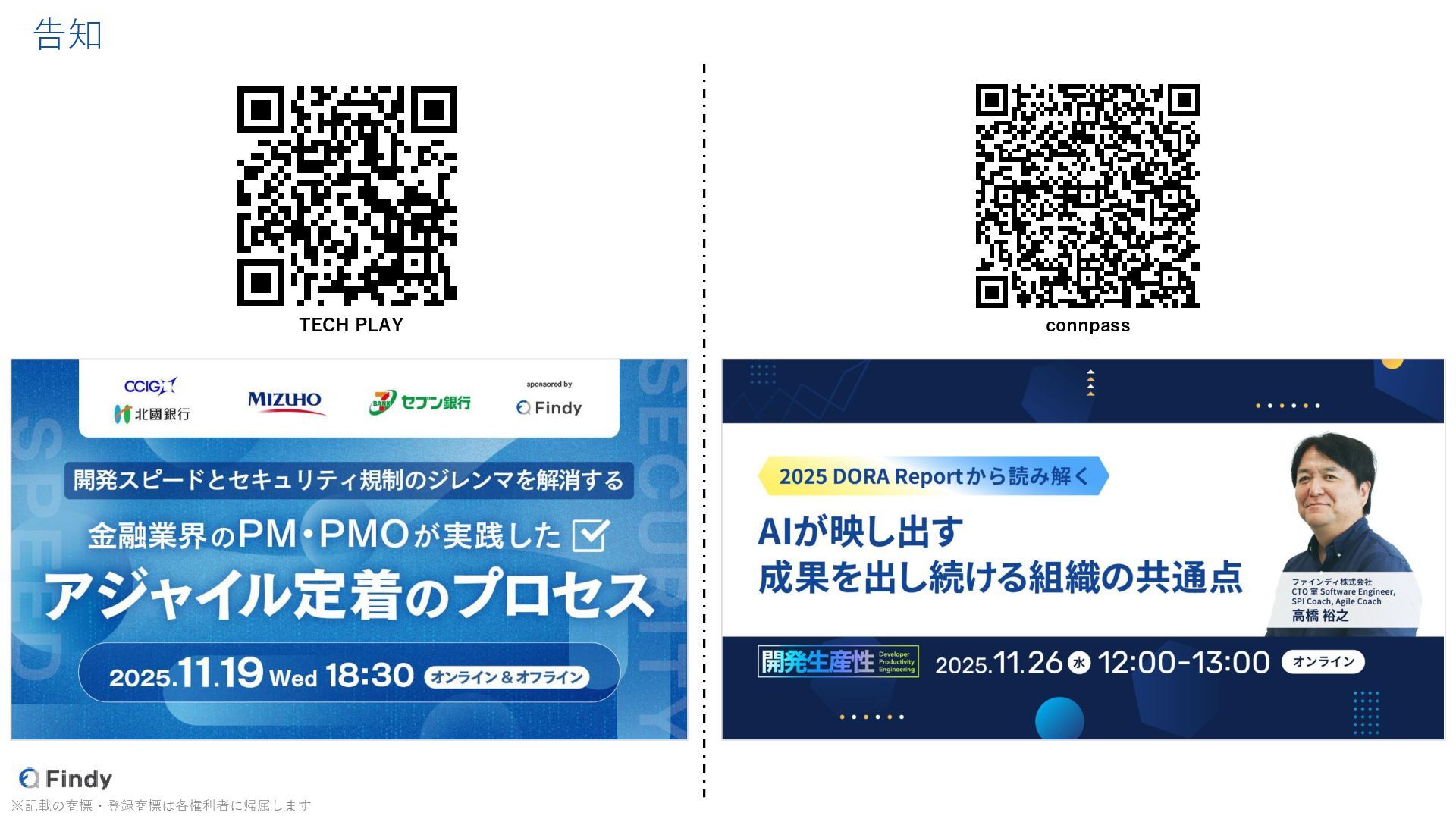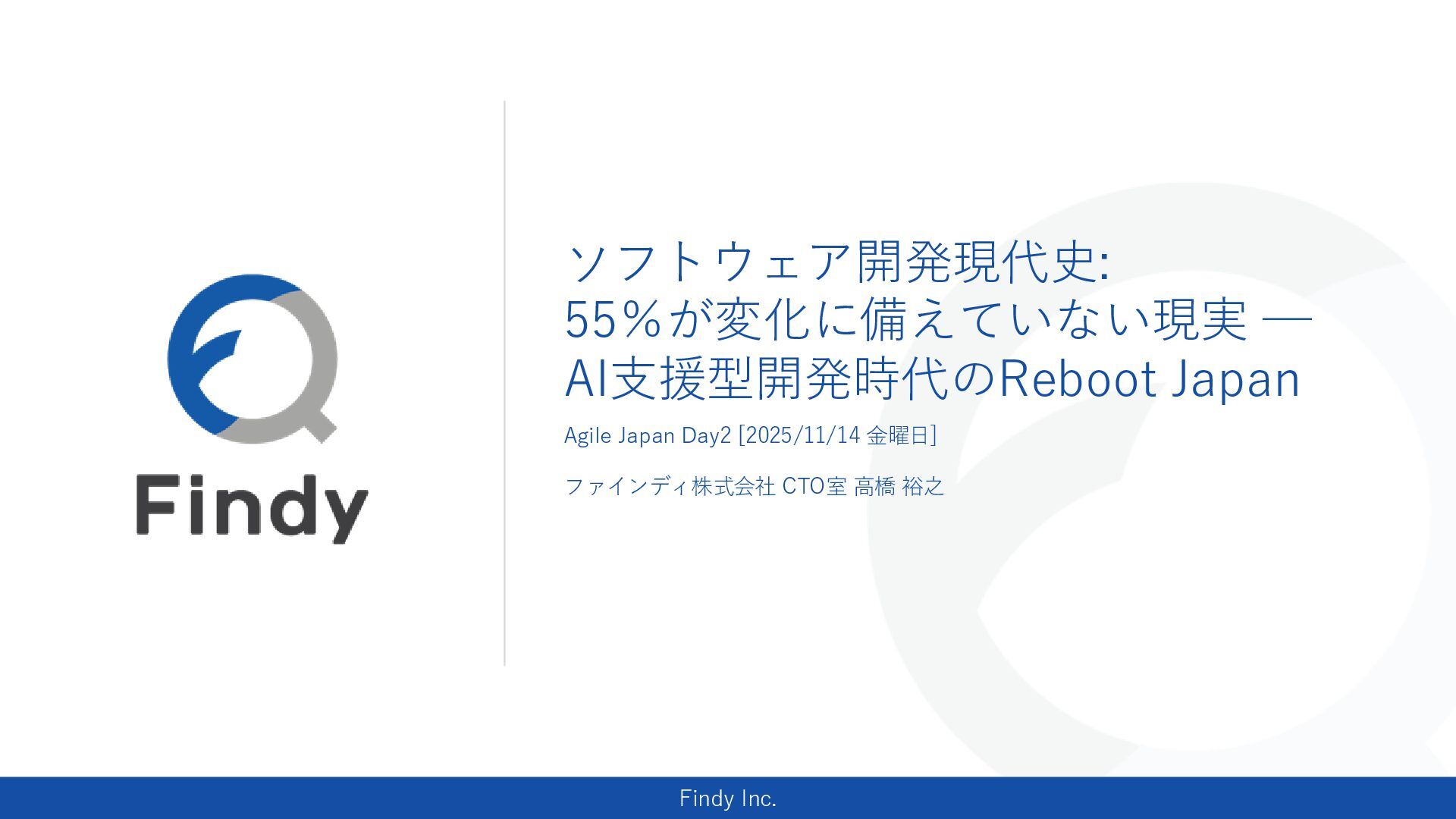 AI支援型開発時代を迎えた今、日本の多くの組織はその土台づくりに出遅れています。現場の実態には大きなギャップがあり、ファインディがIT従事者798名を対象に行った調査では、開発フレームワークについて「よくわからない」18.2%、「ウォーターフォール」36.8%と、あわせて55%が変化に柔軟に対応できない現実が明らかになりました。さらにVSSやSVNなど旧来のバージョン管理を使う組織も約3割にのぼります。これはAI支援型開発の波に乗り遅れ、将来的に大きな生産性格差を生むリスクを意味します。本セッションでは、ソフトウェア開発現代史を手がかりに「なぜ変われないのか」を整理し、今年ファインディのカンファレンスでケント・ベックやジーン・キムが語った内容を踏まえて「何を取り戻すべきか」を再考します。アジャイルとDevOpsの文化を基盤に、AI時代に日本の開発をRebootする道筋を提示します。