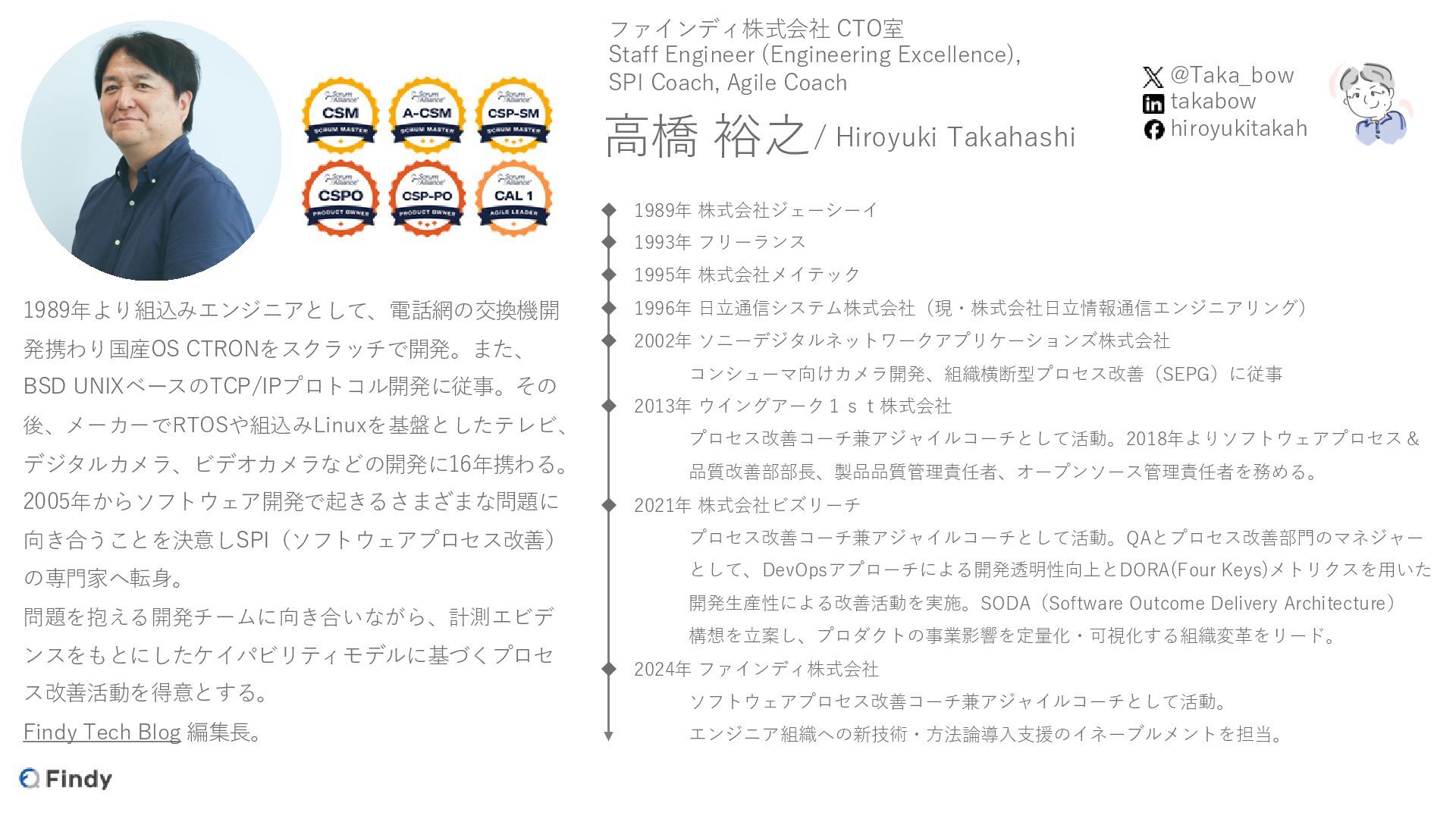 1996年 日立通信システム株式会社(現・株式会社日立情報通信エンジニアリング) ◆ 2002年 ソニーデジタルネットワークアプリケーションズ株式会社 コンシューマ向けカメラ開発、組織横断型プロセス改善(SEPG)に従事 ◆ 2013年 ウイングアーク1st株式会社 プロセス改善コーチ兼アジャイルコーチとして活動。2018年よりソフトウェアプロセス& 品質改善部部長、製品品質管理責任者、オープンソース管理責任者を務める。 ◆ 2021年 株式会社ビズリーチ プロセス改善コーチ兼アジャイルコーチとして活動。QAとプロセス改善部門のマネジャー として、DevOpsアプローチによる開発透明性向上とDORA(Four Keys)メトリクスを用いた 開発生産性による改善活動を実施。SODA(Software Outcome Delivery Architecture) 構想を立案し、プロダクトの事業影響を定量化・可視化する組織変革をリード。 ◆ 2024年 ファインディ株式会社 ソフトウェアプロセス改善コーチ兼アジャイルコーチとして活動。 エンジニア組織への新技術・方法論導入支援のイネーブルメントを担当。 1989年より組込みエンジニアとして、電話網の交換機開 発携わり国産OS CTRONをスクラッチで開発。また、 BSD UNIXベースのTCP/IPプロトコル開発に従事。その 後、メーカーでRTOSや組込みLinuxを基盤としたテレビ、 デジタルカメラ、ビデオカメラなどの開発に16年携わる。 2005年からソフトウェア開発で起きるさまざまな問題に 向き合うことを決意しSPI(ソフトウェアプロセス改善) の専門家へ転身。 問題を抱える開発チームに向き合いながら、計測エビデ ンスをもとにしたケイパビリティモデルに基づくプロセ ス改善活動を得意とする。 Findy Tech Blog 編集長。 高橋 裕之/ Hiroyuki Takahashi ファインディ株式会社 CTO室 Staff Engineer (Engineering Excellence), SPI Coach, Agile Coach @Taka_bow takabow hiroyukitakah