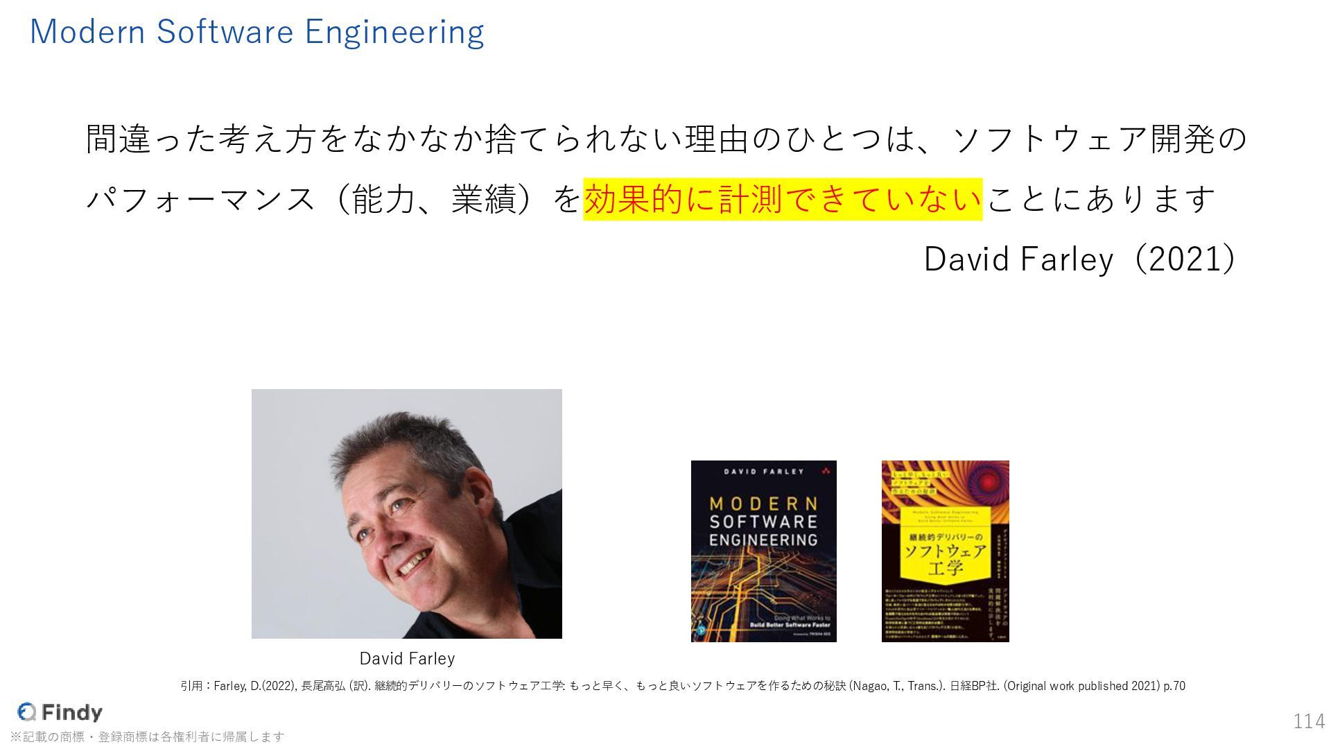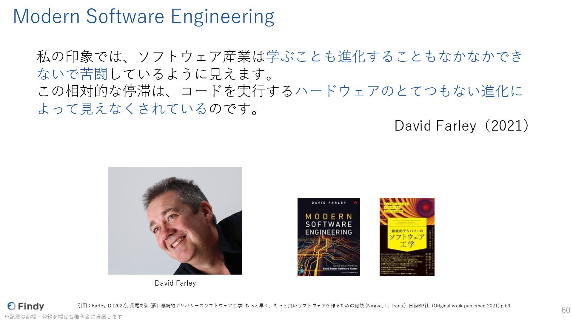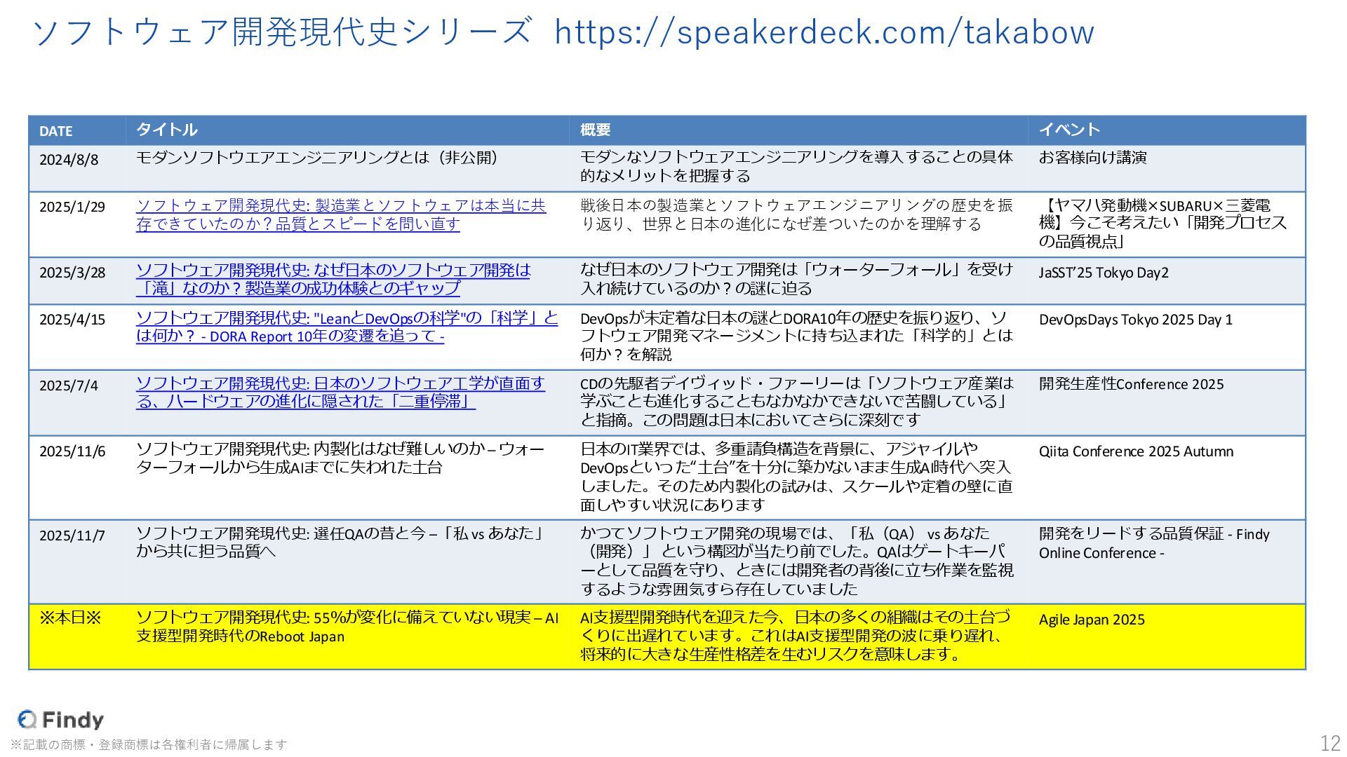 モダンなソフトウェアエンジニアリングを導入することの具体 的なメリットを把握する お客様向け講演 2025/1/29 ソフトウェア開発現代史: 製造業とソフトウェアは本当に共 存できていたのか?品質とスピードを問い直す 戦後日本の製造業とソフトウェアエンジニアリングの歴史を振 り返り、世界と日本の進化になぜ差ついたのかを理解する 【ヤマハ発動機×SUBARU×三菱電 機】今こそ考えたい「開発プロセス の品質視点」 2025/3/28 ソフトウェア開発現代史: なぜ日本のソフトウェア開発は 「滝」なのか?製造業の成功体験とのギャップ なぜ日本のソフトウェア開発は「ウォーターフォール」を受け 入れ続けているのか?の謎に迫る JaSST’25 Tokyo Day2 2025/4/15 ソフトウェア開発現代史: "LeanとDevOpsの科学"の「科学」と は何か? - DORA Report 10年の変遷を追って - DevOpsが未定着な日本の謎とDORA10年の歴史を振り返り、ソ フトウェア開発マネージメントに持ち込まれた「科学的」とは 何か?を解説 DevOpsDays Tokyo 2025 Day 1 2025/7/4 ソフトウェア開発現代史: 日本のソフトウェア工学が直面す る、ハードウェアの進化に隠された「二重停滞」 CDの先駆者デイヴィッド・ファーリーは「ソフトウェア産業は 学ぶことも進化することもなかなかできないで苦闘している」 と指摘。この問題は日本においてさらに深刻です 開発生産性Conference 2025 2025/11/6 ソフトウェア開発現代史: 内製化はなぜ難しいのか ─ ウォー ターフォールから生成AIまでに失われた土台 日本のIT業界では、多重請負構造を背景に、アジャイルや DevOpsといった“土台”を十分に築かないまま生成AI時代へ突入 しました。そのため内製化の試みは、スケールや定着の壁に直 面しやすい状況にあります Qiita Conference 2025 Autumn 2025/11/7 ソフトウェア開発現代史: 選任QAの昔と今 ─「私 vs あなた」 から共に担う品質へ かつてソフトウェア開発の現場では、「私(QA) vs あなた (開発)」 という構図が当たり前でした。QAはゲートキーパ ーとして品質を守り、ときには開発者の背後に立ち作業を監視 するような雰囲気すら存在していました 開発をリードする品質保証 - Findy Online Conference - ※本日※ ソフトウェア開発現代史: 55%が変化に備えていない現実 ─ AI 支援型開発時代のReboot Japan AI支援型開発時代を迎えた今、日本の多くの組織はその土台づ くりに出遅れています。これはAI支援型開発の波に乗り遅れ、 将来的に大きな生産性格差を生むリスクを意味します。 Agile Japan 2025