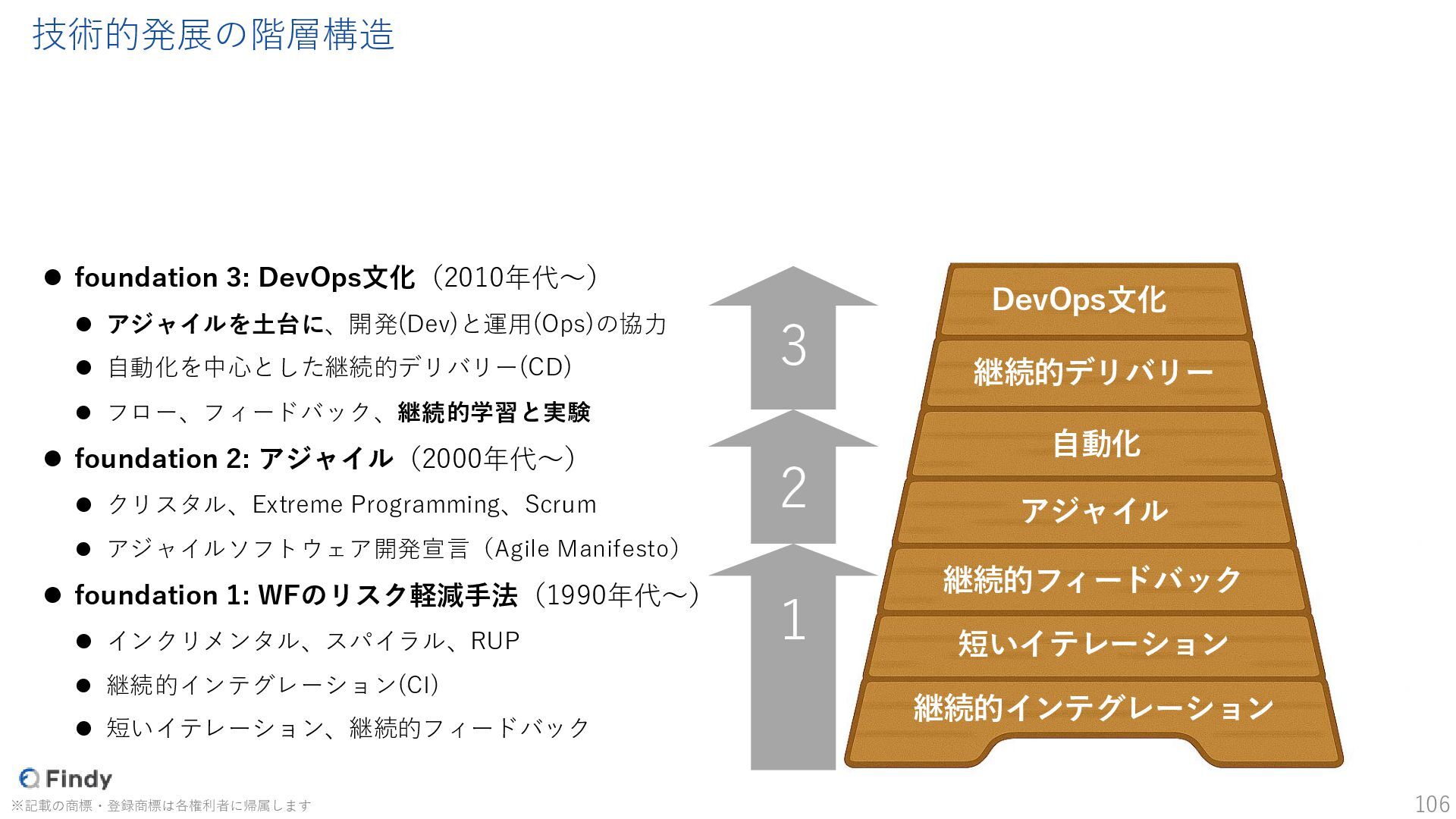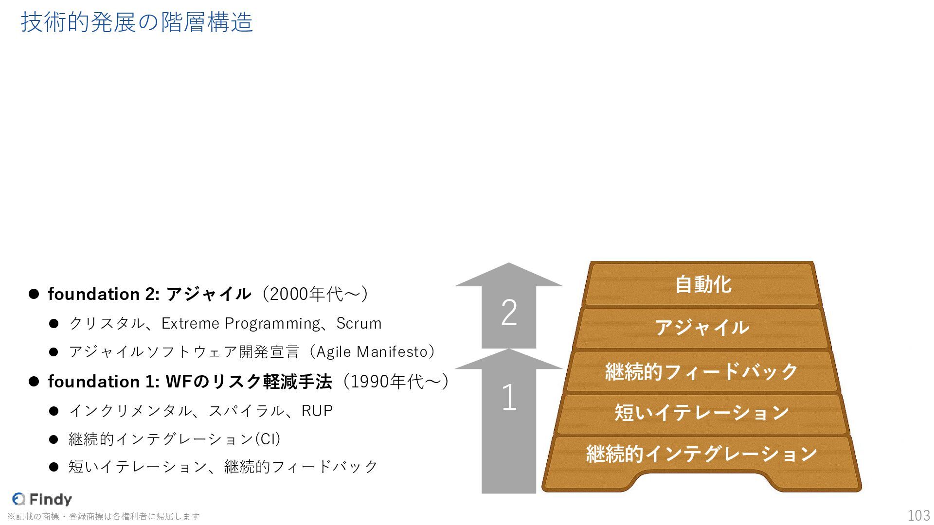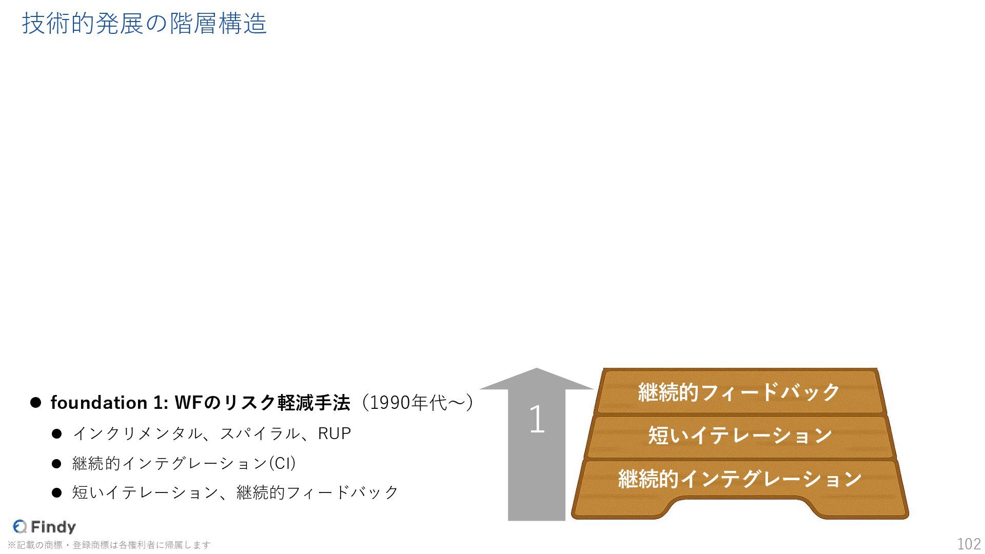 41. ※記載の商標・登録商標は各権利者に帰属します 技術的発展の階層構造 ⚫ foundation 1: WFのリスク軽減手法(1990年代〜) ⚫ インクリメンタル、スパイラル、RUP ⚫ 継続的インテグレーション(CI)