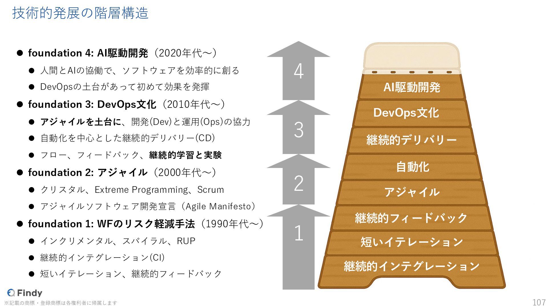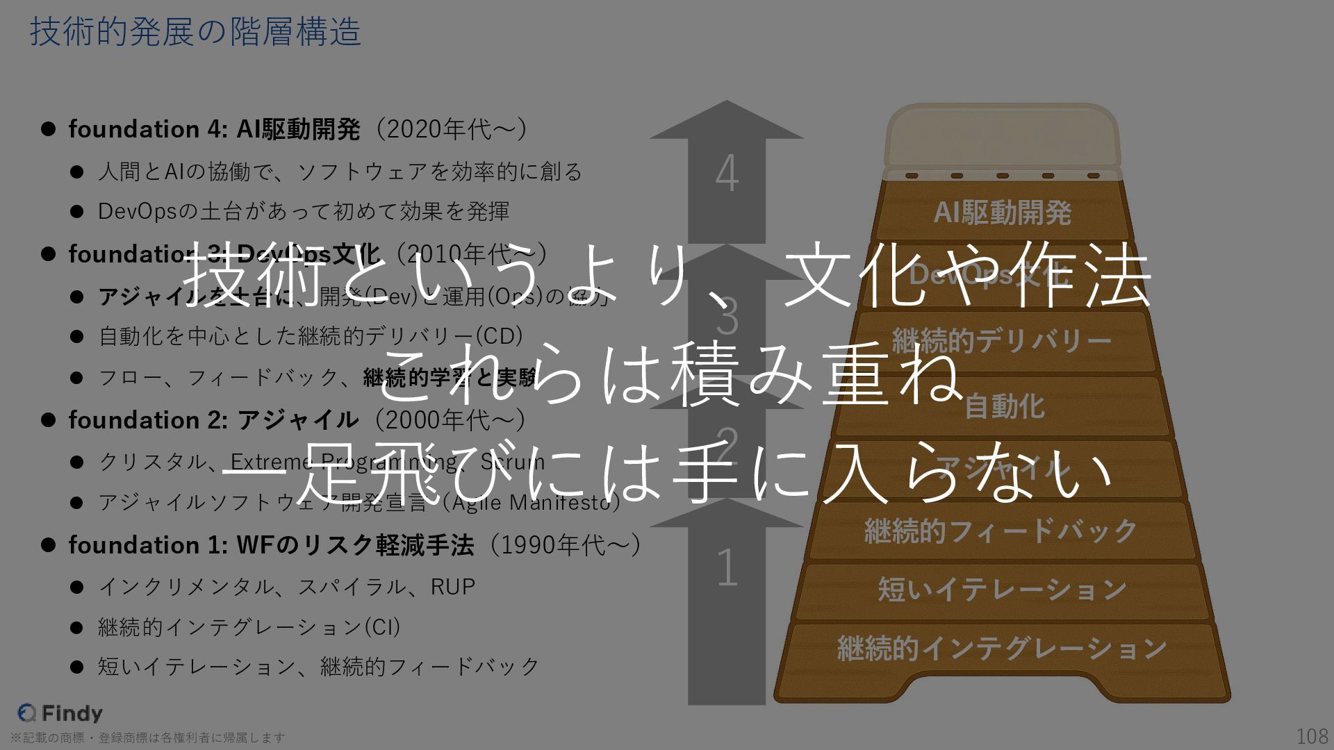 foundation 4: AI駆動開発(2020年代〜) ⚫ 人間とAIの協働で、ソフトウェアを効率的に創る ⚫ DevOpsの土台があって初めて効果を発揮 ⚫ foundation 3: DevOps文化(2010年代〜) ⚫ アジャイルを土台に、開発(Dev)と運用(Ops)の協力 ⚫ 自動化を中心とした継続的デリバリー(CD) ⚫ フロー、フィードバック、継続的学習と実験 ⚫ foundation 2: アジャイル(2000年代〜) ⚫ クリスタル、Extreme Programming、Scrum ⚫ アジャイルソフトウェア開発宣言(Agile Manifesto) ⚫ foundation 1: WFのリスク軽減手法(1990年代〜) ⚫ インクリメンタル、スパイラル、RUP ⚫ 継続的インテグレーション(CI) ⚫ 短いイテレーション、継続的フィードバック 1 2 3 4 107 DevOps文化