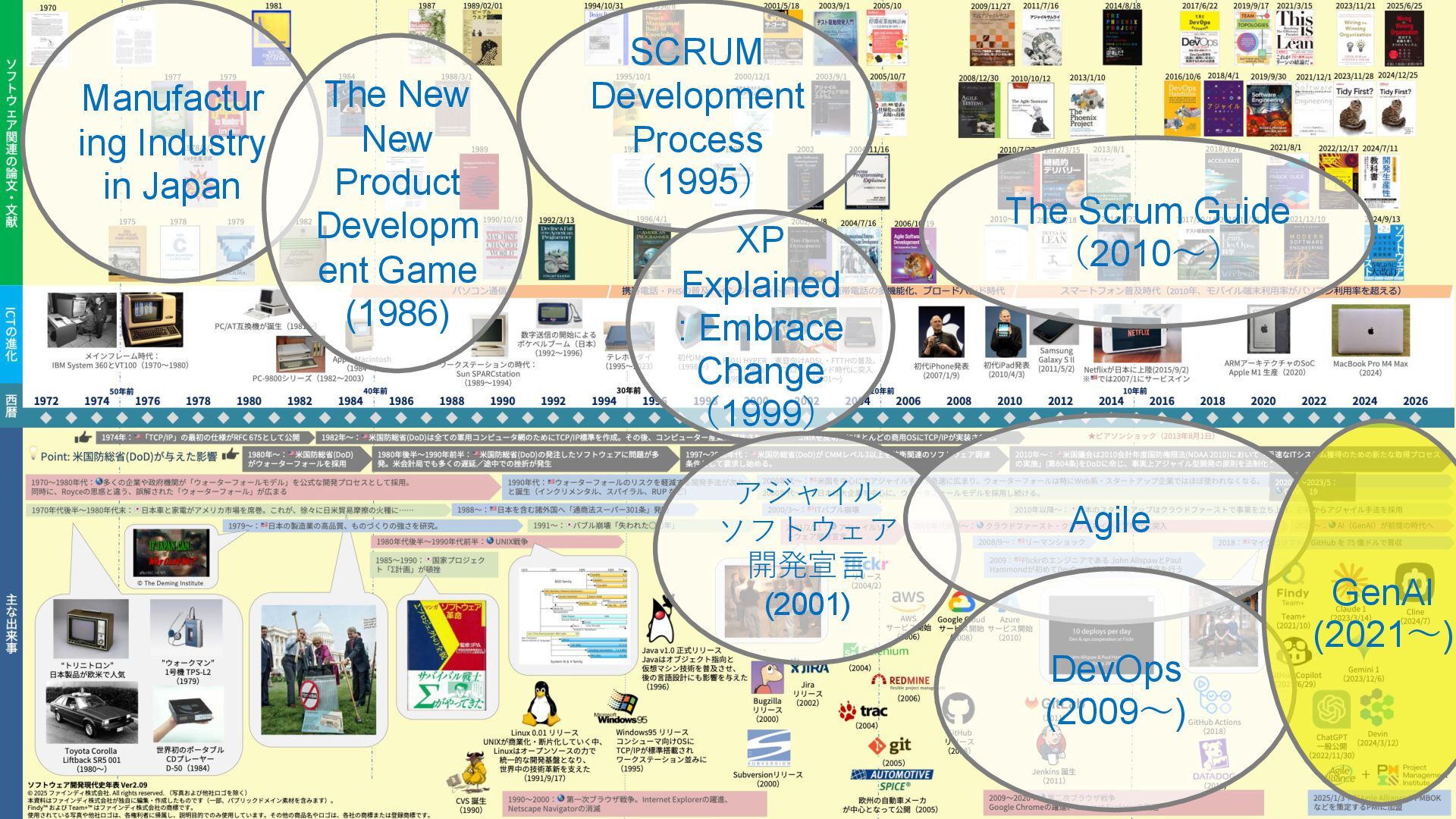 ent Game (1986) SCRUM Development Process (1995) XP Explained : Embrace Change (1999) アジャイル ソフトウェア 開発宣言 (2001) The Scrum Guide (2010〜) Agile DevOps (2009〜) GenAI (2021〜)