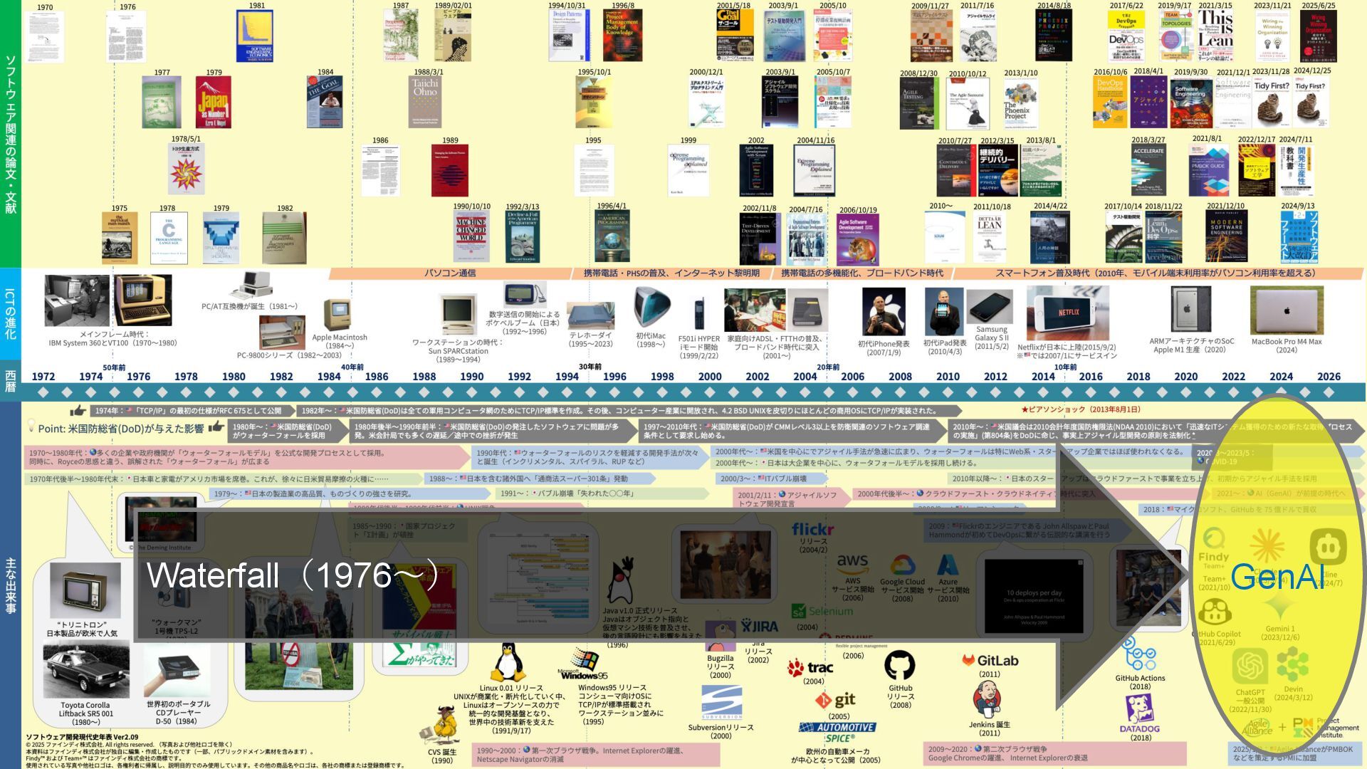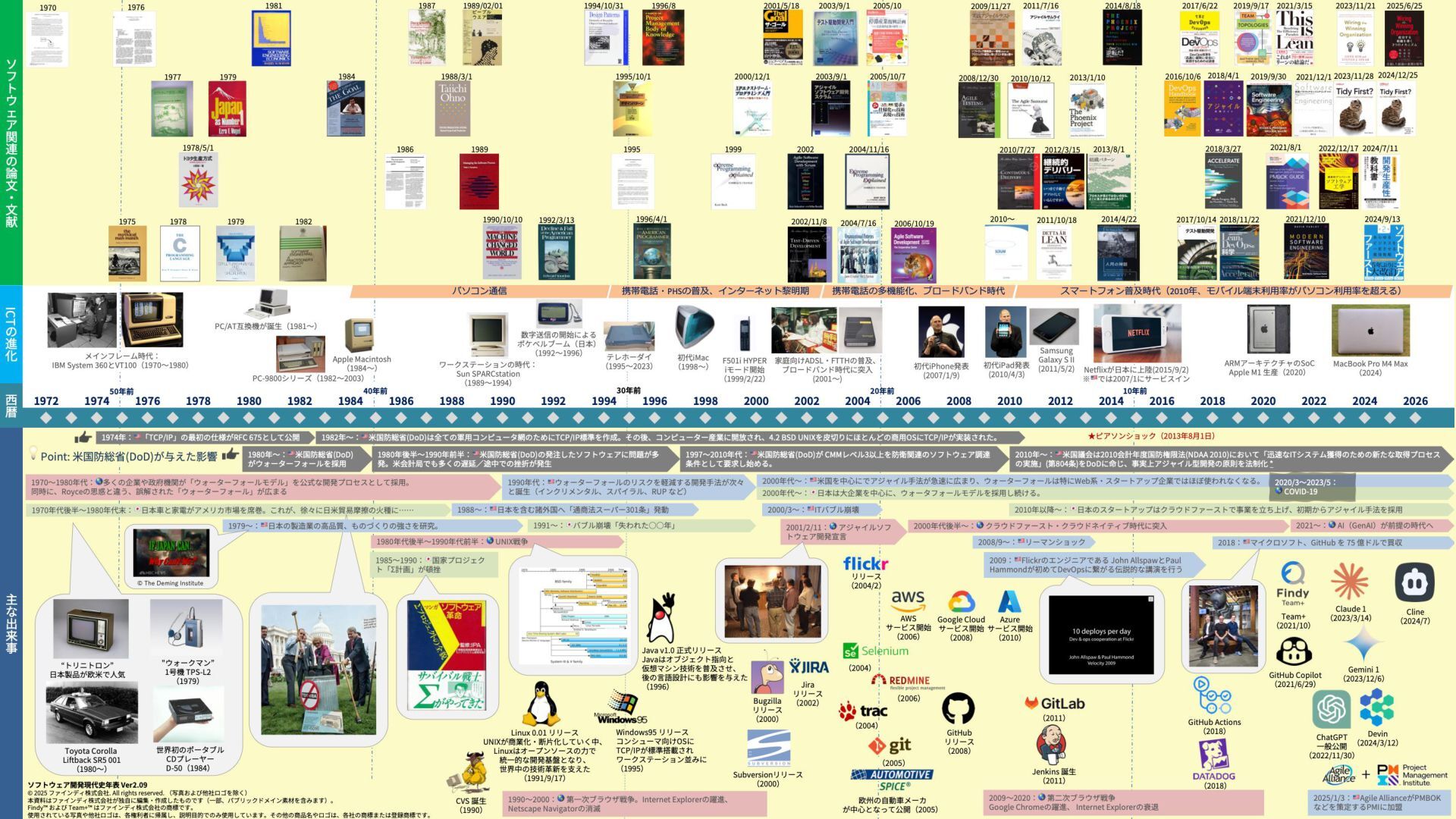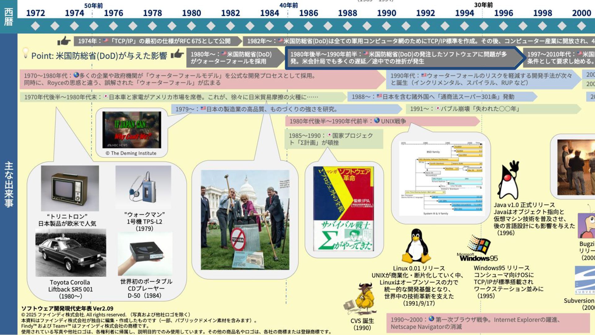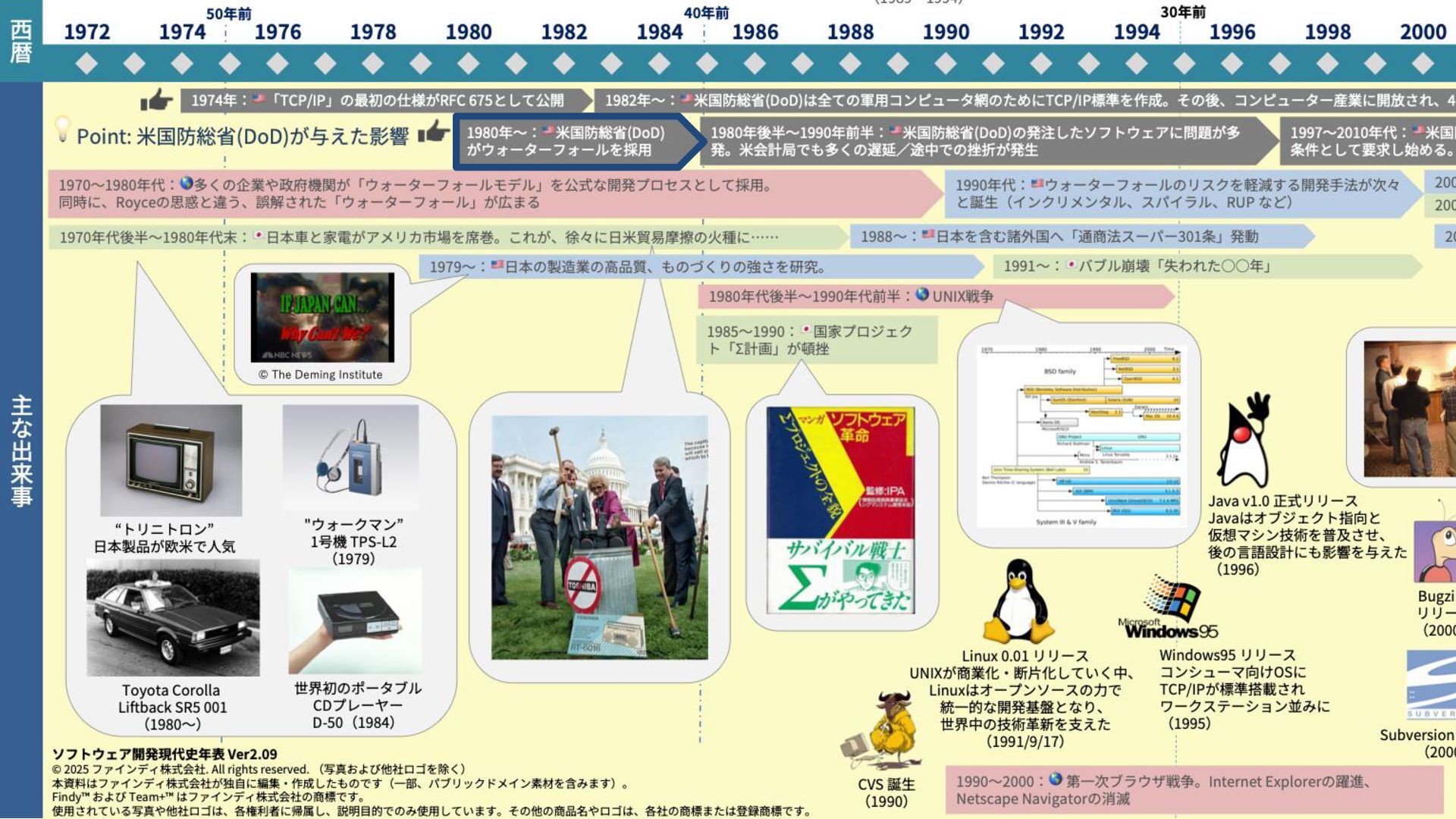 2001/2/11: アジャイルソフ トウェア開発宣言 2005/10 1991〜: バブル崩壊「失われた◦◦年」 1988〜: 日本を含む諸外国へ「通商法スーパー301条」発動 ソフト ウェア開発現 代史年表 Ver2.09 © 2025 ファ インデ ィ株式 会社. All rights reserved. (写真 および 他社ロ ゴを除 く) 本資 料はフ ァイン ディ株 式会社 が独自 に編集 ・作成 したも のです (一部 、パブ リック ドメイ ン素材 を含み ます) 。 Findy およ び Team+ はフ ァイン ディ株 式会社 の商標 です。 使用 されて いる写 真や他 社ロゴ は、各 権利者 に帰属 し、説 明目的 でのみ 使用し ていま す。そ の他の 商品名 やロゴ は、各 社の商 標また は登録 商標で す。 1974 2024 1976 1978 1980 1982 1984 1986 1988 1990 1992 1994 1996 1998 2000 2002 2004 2006 2008 2010 2012 2014 2016 2018 2020 2022 Linux 0.01 リリース UNIXが商業化・断片化していく中、 Linuxはオープンソースの力で 統一的な開発基盤となり、 世界中の技術革新を支えた (1991/9/17) CVS 誕生 (1990) Subversionリリース (2000) (2005) GitHub リリース (2008) Bugzilla リリース (2000) Jira リリース (2002) AWS サービス開始 (2006) Jenkins 誕生 (2011) GitHub Actions (2018) ChatGPT 一般公開 (2022/11/30) GitHub Copilot (2021/6/29) Java v1.0 正式リリース Javaはオブジェクト指向と 仮想マシン技術を普及させ、 後の言語設計にも影響を与えた (1996) 1980年代後半〜1990年代前半: UNIX戦争 1970〜1980年代: 多くの企業や政府機関が「ウォーターフォールモデル」を公式な開発プロセスとして採用。 同時に、Royceの思惑と違う、誤解された「ウォーターフォール」が広まる Azure サービス開始 (2010) 1990〜2000: 第一次ブラウザ戦争。Internet Explorerの躍進、 Netscape Navigatorの消滅 2009〜2020: 第二次ブラウザ戦争 Google Chromeの躍進、 Internet Explorerの衰退 (2018) (2004) Google Cloud サービス開始 (2008) 欧州の自動車メーカ が中心となって公開(2005) (2011) 1985〜1990: 国家プロジェクト 「Σ計画」が頓挫 (2006) (2004) 1975 1999 2018/11/22 2004/11/16 2006/10/19 1977 1986 2002 1995 2010〜 2017/6/22 1994/10/31 1989 2024/7/11 1987 1970 1989/02/01 1982 1979 2019/9/17 1992/3/13 1996/4/1 2010/10/12 2011/7/16 2022/12/17 2011/10/18 2021/3/15 2001/5/18 1996/8 1979 2004/7/16 2013/8/1 2014/4/22 2019/9/30 2021/12/10 1978 2024/9/13 1972 2026 1997〜2010年代: 米国防総省(DoD)が CMMレベル3以上を防衛関連のソフトウェア調達 条件として要求し始める。 2000年代〜: 米国を中心にでアジャイル手法が急速に広まり、ウォーターフォールは特にWeb系・スタートアップ企業ではほぼ使われなくなる。 1990年代: ウォーターフォールのリスクを軽減する開発手法が次々 と誕生(インクリメンタル、スパイラル、RUP など) 1980年後半〜1990年前半: 米国防総省(DoD)の発注したソフトウェアに問題が多発。 米会計局でも多くの遅延/途中での挫折が発生 主 な 出 来 事 ソ フ ト ウ ェ ア 関 連 の 論 文 ・ 文 献 2010年〜: 米国議会は2010会計年度国防権限法(NDAA 2010)において「迅速なITシステム獲得のための新たな取得プロセス の実施」(第804条)をDoDに命じ、事実上アジャイル型開発の原則を法制化 * 1980年〜: 米国防総省(DoD) がウォーターフォールを採用 初代iPhone発表 (2007/1/9) PC/AT互換機が誕生(1981〜) ワークステーションの時代: Sun SPARCstation (1989〜1994) Windows95 リリース コンシューマ向けOSに TCP/IPが標準搭載され ワークステーション並みに (1995) 初代iMac (1998〜) Apple Macintosh (1984〜) 家庭向けADSL・FTTHの普及、 ブロードバンド時代に突入 (2001〜) ICT の 進 化 メインフレーム時代: IBM System 360とVT100(1970〜1980) MacBook Pro M4 Max (2024) 2018/3/27 2000/12/1 2010/7/27 2016/10/6 2005/10/7 1990/10/10 1978/5/1 1988/3/1 1984 2021/8/1 1995/10/1 2003/9/1 1976 リリース (2004/2) Point: 米国防総省(DoD)が与えた影響 1981 2021/12/1 2025/1/3: Agile AllianceがPMBOK などを策定するPMIに加盟 Claude 1 (2023/3/14) Team+ (2021/10) Gemini 1 (2023/12/6) Devin (2024/3/12) Cline (2024/7) 2021〜: AI(GenAI)が前提の時代へ 2000年代〜: 日本は大企業を中心に、ウォータフォールモデルを採用し続ける。 2018/4/1 数字送信の開始による ポケベルブーム(日本) (1992〜1996) F501i HYPER iモード開始 (1999/2/22) テレホーダイ (1995〜2023) PC-9800シリーズ(1982〜2003) 初代iPad発表 (2010/4/3) Samsung Galaxy S II (2011/5/2) 2020/3〜2023/5: COVID-19 ARMアーキテクチャのSoC Apple M1 生産(2020) 1970年代後半〜1980年代末: 日本車と家電がアメリカ市場を席巻。これが、徐々に日米貿易摩擦の火種に…… "ウォークマン” 1号機 TPS-L2 (1979) 世界初のポータブル CDプレーヤー D-50(1984) Toyota Corolla Liftback SR5 001 (1980〜) “トリニトロン” 日本製品が欧米で人気 1979〜: 日本の製造業の高品質、ものづくりの強さを研究。 2024/12/25 2013/1/10 2014/8/18 2023/11/21 2000/3〜: ITバブル崩壊 パソコン通信 携帯電話・PHSの普及、インターネット黎明期 携帯電話の多機能化、ブロードバンド時代 スマートフォン普及時代(2010年、モバイル端末利用率がパソコン利用率を超える) 1974年: 「TCP/IP」の最初の仕様がRFC 675として公開 1982年〜: 米国防総省(DoD)は全ての軍用コンピュータ網のためにTCP/IP標準を作成。その後、コンピューター産業に開放され、4.2 BSD UNIXを皮切りにほとんどの