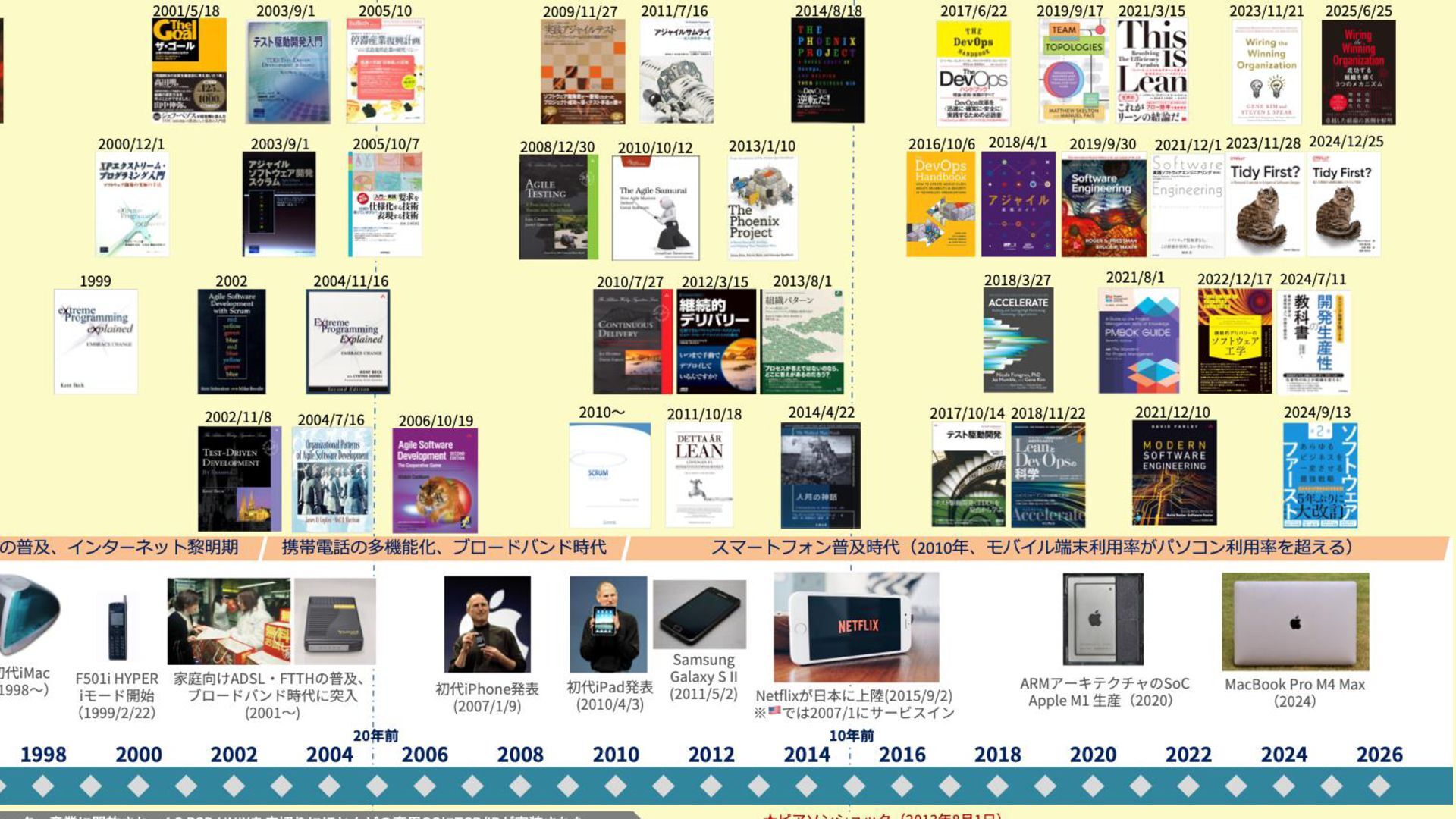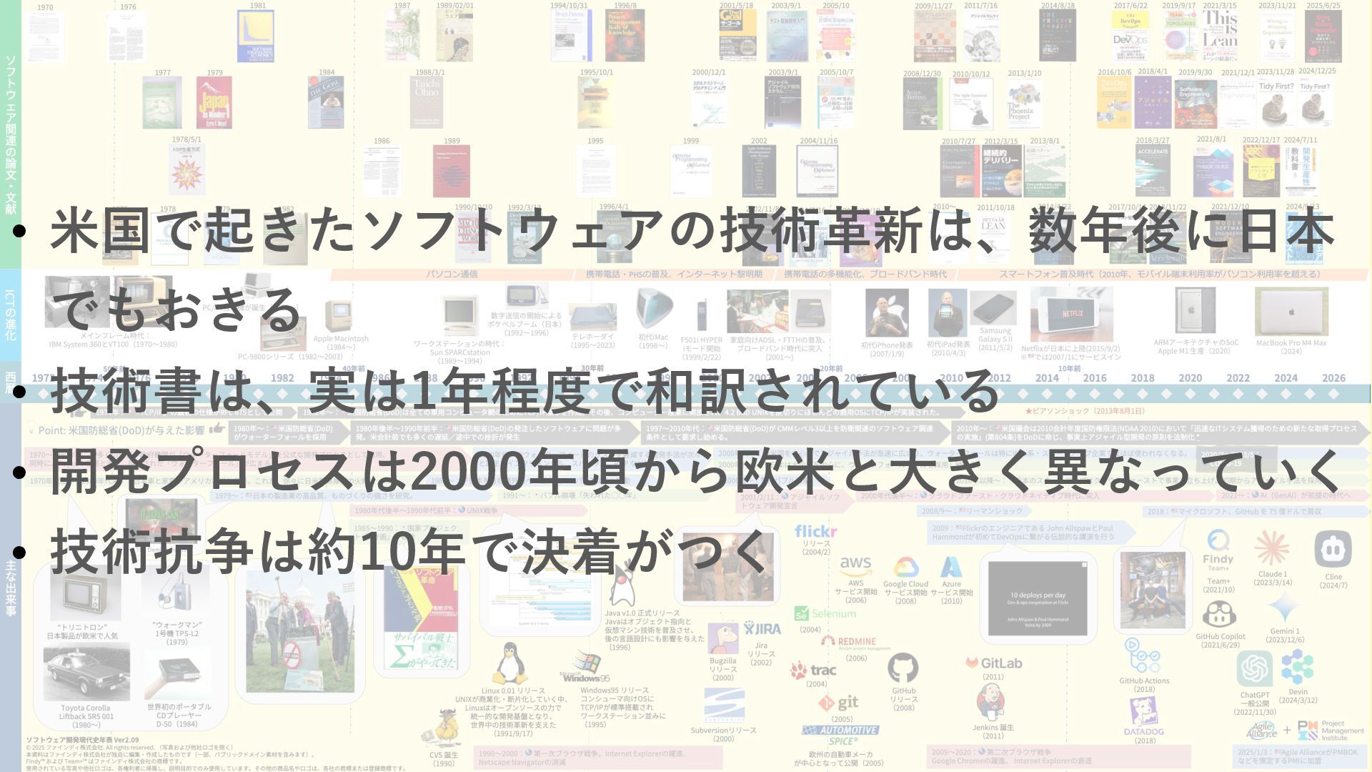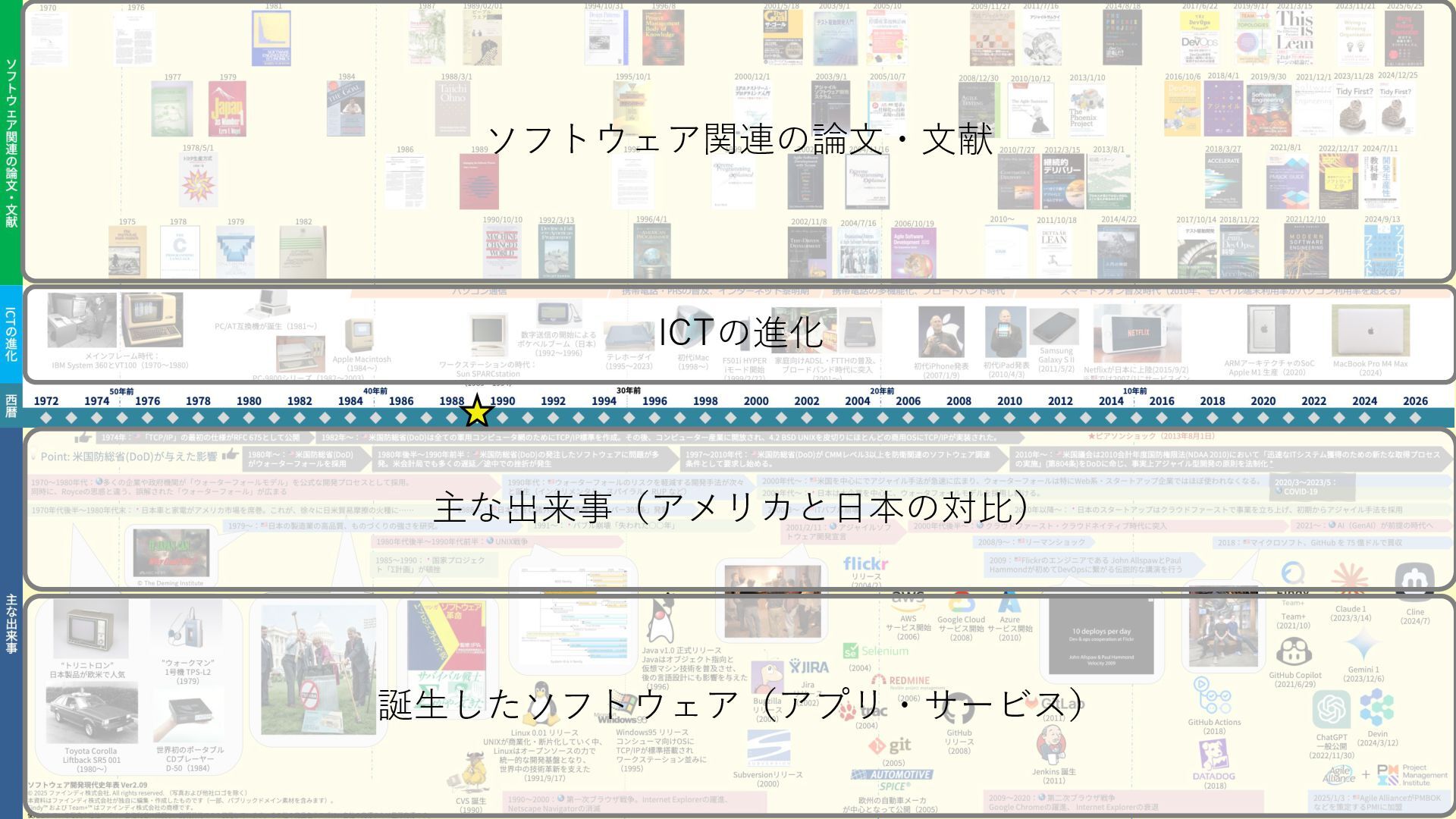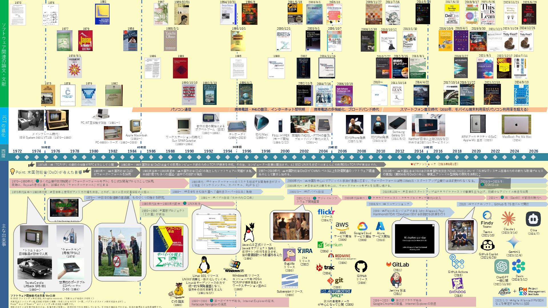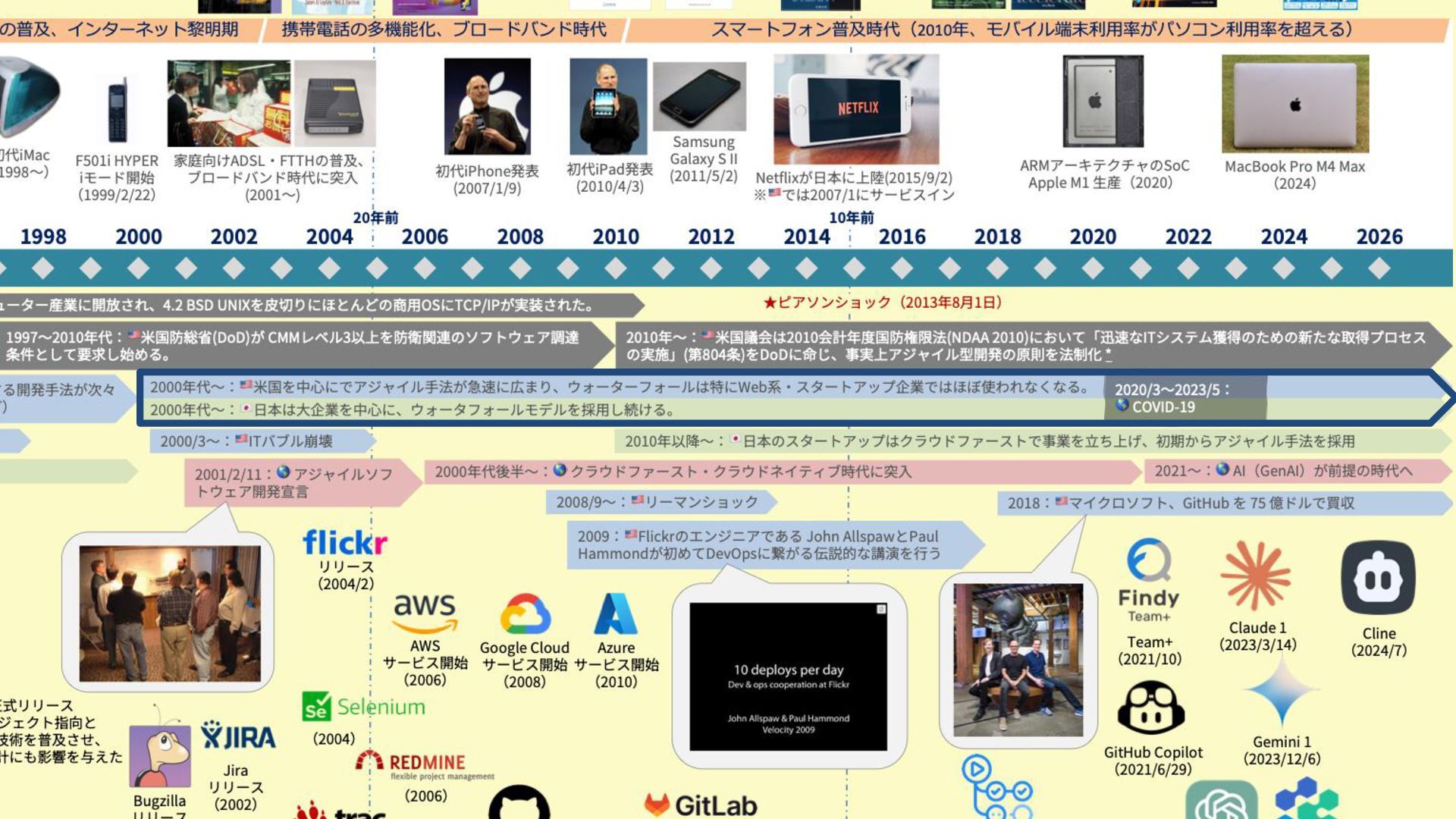 2001/2/11: アジャイルソフ トウェア開発宣言 2005/10 1991〜: バブル崩壊「失われた◦◦年」 1988〜: 日本を含む諸外国へ「通商法スーパー301条」発動 ソフト ウェア開発現 代史年表 Ver2.09 © 2025 ファ インデ ィ株式 会社. All rights reserved. (写真 および 他社ロ ゴを除 く) 本資 料はフ ァイン ディ株 式会社 が独自 に編集 ・作成 したも のです (一部 、パブ リック ドメイ ン素材 を含み ます) 。 Findy およ び Team+ はフ ァイン ディ株 式会社 の商標 です。 使用 されて いる写 真や他 社ロゴ は、各 権利者 に帰属 し、説 明目的 でのみ 使用し ていま す。そ の他の 商品名 やロゴ は、各 社の商 標また は登録 商標で す。 1974 2024 1976 1978 1980 1982 1984 1986 1988 1990 1992 1994 1996 1998 2000 2002 2004 2006 2008 2010 2012 2014 2016 2018 2020 2022 Linux 0.01 リリース UNIXが商業化・断片化していく中、 Linuxはオープンソースの力で 統一的な開発基盤となり、 世界中の技術革新を支えた (1991/9/17) CVS 誕生 (1990) Subversionリリース (2000) (2005) GitHub リリース (2008) Bugzilla リリース (2000) Jira リリース (2002) AWS サービス開始 (2006) Jenkins 誕生 (2011) GitHub Actions (2018) ChatGPT 一般公開 (2022/11/30) GitHub Copilot (2021/6/29) Java v1.0 正式リリース Javaはオブジェクト指向と 仮想マシン技術を普及させ、 後の言語設計にも影響を与えた (1996) 1980年代後半〜1990年代前半: UNIX戦争 1970〜1980年代: 多くの企業や政府機関が「ウォーターフォールモデル」を公式な開発プロセスとして採用。 同時に、Royceの思惑と違う、誤解された「ウォーターフォール」が広まる Azure サービス開始 (2010) 1990〜2000: 第一次ブラウザ戦争。Internet Explorerの躍進、 Netscape Navigatorの消滅 2009〜2020: 第二次ブラウザ戦争 Google Chromeの躍進、 Internet Explorerの衰退 (2018) (2004) Google Cloud サービス開始 (2008) 欧州の自動車メーカ が中心となって公開(2005) (2011) 1985〜1990: 国家プロジェクト 「Σ計画」が頓挫 (2006) (2004) 1975 1999 2018/11/22 2004/11/16 2006/10/19 1977 1986 2002 1995 2010〜 2017/6/22 1994/10/31 1989 2024/7/11 1987 1970 1989/02/01 1982 1979 2019/9/17 1992/3/13 1996/4/1 2010/10/12 2011/7/16 2022/12/17 2011/10/18 2021/3/15 2001/5/18 1996/8 1979 2004/7/16 2013/8/1 2014/4/22 2019/9/30 2021/12/10 1978 2024/9/13 1972 2026 1997〜2010年代: 米国防総省(DoD)が CMMレベル3以上を防衛関連のソフトウェア調達 条件として要求し始める。 2000年代〜: 米国を中心にでアジャイル手法が急速に広まり、ウォーターフォールは特にWeb系・スタートアップ企業ではほぼ使われなくなる。 1990年代: ウォーターフォールのリスクを軽減する開発手法が次々 と誕生(インクリメンタル、スパイラル、RUP など) 1980年後半〜1990年前半: 米国防総省(DoD)の発注したソフトウェアに問題が多発。 米会計局でも多くの遅延/途中での挫折が発生 主 な 出 来 事 ソ フ ト ウ ェ ア 関 連 の 論 文 ・ 文 献 2010年〜: 米国議会は2010会計年度国防権限法(NDAA 2010)において「迅速なITシステム獲得のための新たな取得プロセス の実施」(第804条)をDoDに命じ、事実上アジャイル型開発の原則を法制化 * 1980年〜: 米国防総省(DoD) がウォーターフォールを採用 初代iPhone発表 (2007/1/9) PC/AT互換機が誕生(1981〜) ワークステーションの時代: Sun SPARCstation (1989〜1994) Windows95 リリース コンシューマ向けOSに TCP/IPが標準搭載され ワークステーション並みに (1995) 初代iMac (1998〜) Apple Macintosh (1984〜) 家庭向けADSL・FTTHの普及、 ブロードバンド時代に突入 (2001〜) ICT の 進 化 メインフレーム時代: IBM System 360とVT100(1970〜1980) MacBook Pro M4 Max (2024) 2018/3/27 2000/12/1 2010/7/27 2016/10/6 2005/10/7 1990/10/10 1978/5/1 1988/3/1 1984 2021/8/1 1995/10/1 2003/9/1 1976 リリース (2004/2) Point: 米国防総省(DoD)が与えた影響 1981 2021/12/1 2025/1/3: Agile AllianceがPMBOK などを策定するPMIに加盟 Claude 1 (2023/3/14) Team+ (2021/10) Gemini 1 (2023/12/6) Devin (2024/3/12) Cline (2024/7) 2021〜: AI(GenAI)が前提の時代へ 2000年代〜: 日本は大企業を中心に、ウォータフォールモデルを採用し続ける。 2018/4/1 数字送信の開始による ポケベルブーム(日本) (1992〜1996) F501i HYPER iモード開始 (1999/2/22) テレホーダイ (1995〜2023) PC-9800シリーズ(1982〜2003) 初代iPad発表 (2010/4/3) Samsung Galaxy S II (2011/5/2) 2020/3〜2023/5: COVID-19 ARMアーキテクチャのSoC Apple M1 生産(2020) 1970年代後半〜1980年代末: 日本車と家電がアメリカ市場を席巻。これが、徐々に日米貿易摩擦の火種に…… "ウォークマン” 1号機 TPS-L2 (1979) 世界初のポータブル CDプレーヤー D-50(1984) Toyota Corolla Liftback SR5 001 (1980〜) “トリニトロン” 日本製品が欧米で人気 1979〜: 日本の製造業の高品質、ものづくりの強さを研究。 2024/12/25 2013/1/10 2014/8/18 2023/11/21 2000/3〜: ITバブル崩壊 パソコン通信 携帯電話・PHSの普及、インターネット黎明期 携帯電話の多機能化、ブロードバンド時代 スマートフォン普及時代(2010年、モバイル端末利用率がパソコン利用率を超える) 1974年: 「TCP/IP」の最初の仕様がRFC 675として公開 1982年〜: 米国防総省(DoD)は全ての軍用コンピュータ網のためにTCP/IP標準を作成。その後、コンピューター産業に開放され、4.2 BSD UNIXを皮切りにほとんどの