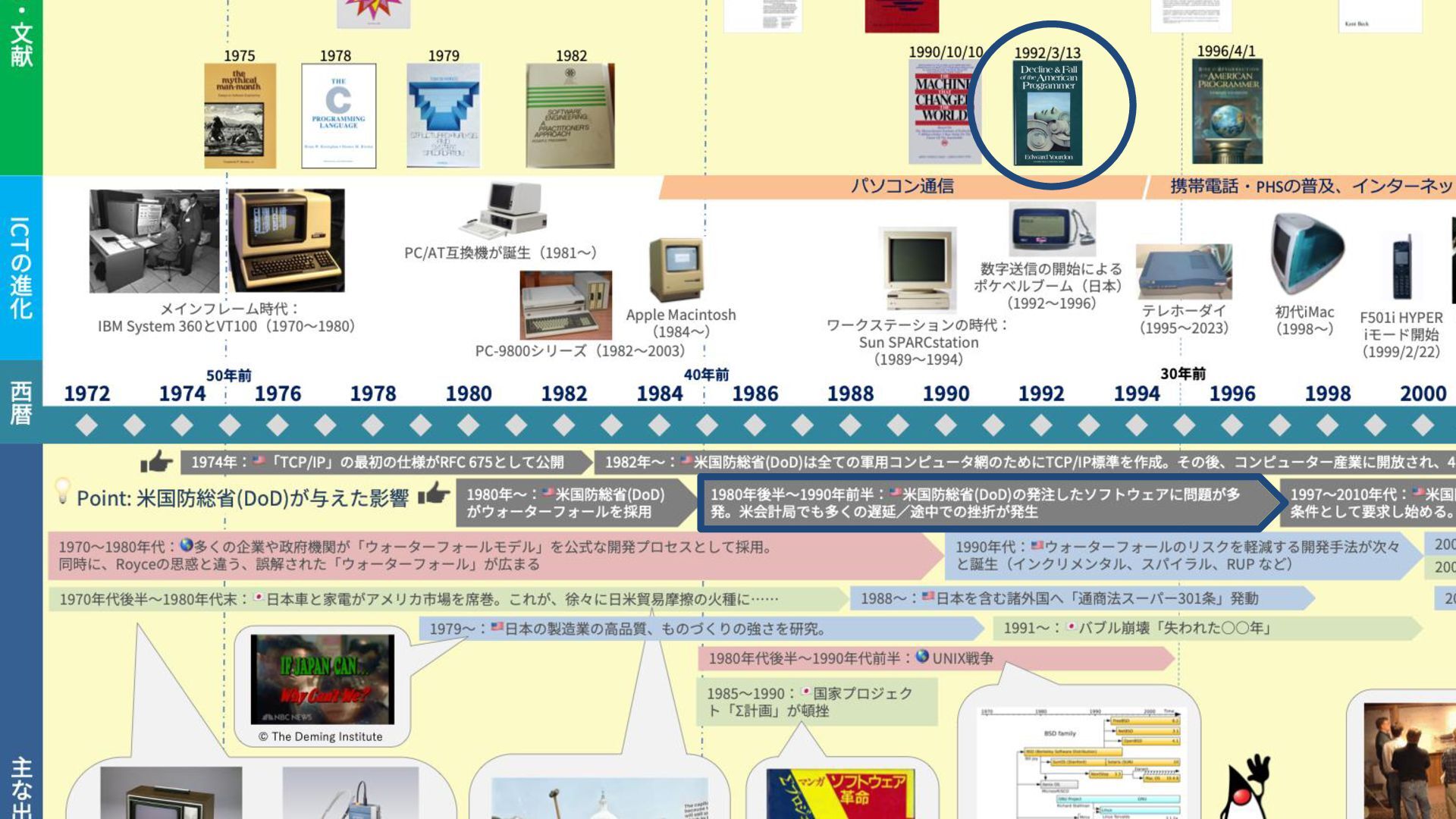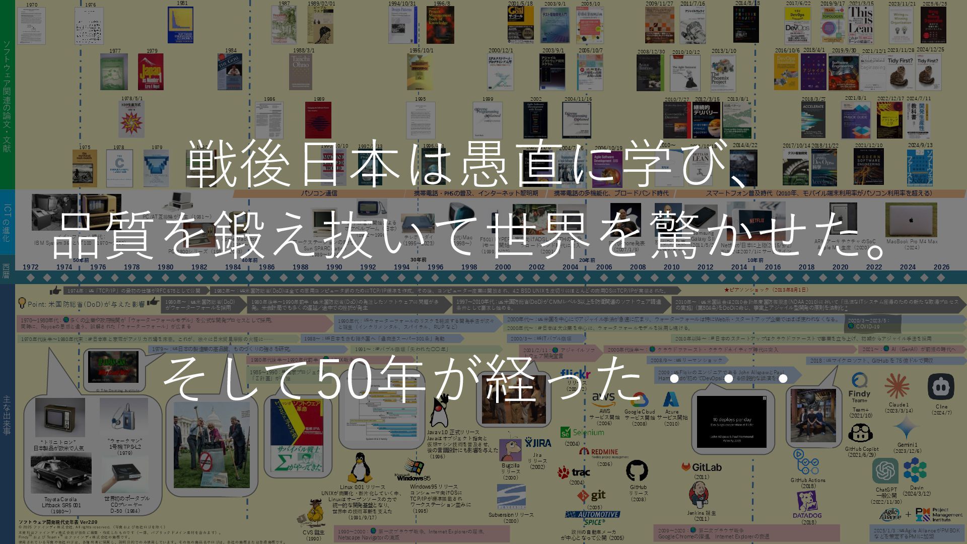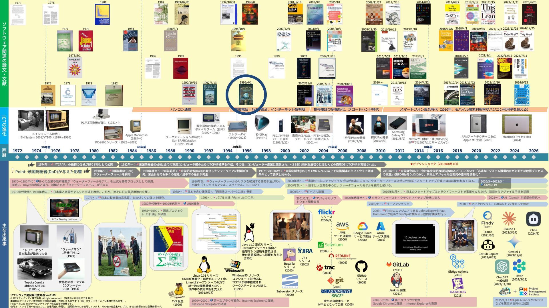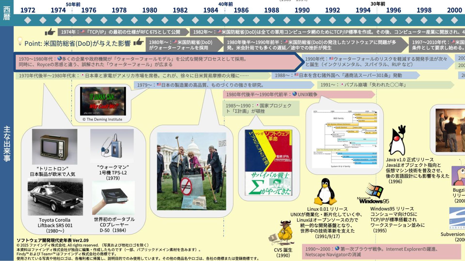 2001/2/11: アジャイルソフ トウェア開発宣言 2005/10 1991〜: バブル崩壊「失われた◦◦年」 1988〜: 日本を含む諸外国へ「通商法スーパー301条」発動 ソフト ウェア開発現 代史年表 Ver2.09 © 2025 ファ インディ株式 会社. All rights reserved. (写真およ び他社ロゴ を除く) 本資 料はフ ァイン ディ株式 会社が独自に編集・作成した もので す(一部、パブ リック ドメイン素材を含みま す)。 Findy およ び Team+ はフ ァイン ディ株式 会社の商標です。 使用されて いる写真や他社ロゴ は、各権 利者に帰属し、説明 目的での み使用していま す。その他の商品 名やロ ゴは、各社の商標また は登録 商標です。 1974 2024 1976 1978 1980 1982 1984 1986 1988 1990 1992 1994 1996 1998 2000 2002 2004 2006 2008 2010 2012 2014 2016 2018 2020 2022 Linux 0.01 リリース UNIXが商業化・断片化していく中、 Linuxはオープンソースの力で 統一的な開発基盤となり、 世界中の技術革新を支えた (1991/9/17) CVS 誕生 (1990) Subversionリリース (2000) (2005) GitHub リリース (2008) Bugzilla リリース (2000) Jira リリース (2002) AWS サービス開始 (2006) Jenkins 誕生 (2011) GitHub Actions (2018) ChatGPT 一般公開 (2022/11/30) GitHub Copilot (2021/6/29) Java v1.0 正式リリース Javaはオブジェクト指向と 仮想マシン技術を普及させ、 後の言語設計にも影響を与えた (1996) 1980年代後半〜1990年代前半: UNIX戦争 1970〜1980年代: 多くの企業や政府機関が「ウォーターフォールモデル」を公式な開発プロセスとして採用。 同時に、Royceの思惑と違う、誤解された「ウォーターフォール」が広まる Azure サービス開始 (2010) 1990〜2000: 第一次ブラウザ戦争。Internet Explorerの躍進、 Netscape Navigatorの消滅 2009〜2020: 第二次ブラウザ戦争 Google Chromeの躍進、 Internet Explorerの衰退 (2018) (2004) Google Cloud サービス開始 (2008) 欧州の自動車メーカ が中心となって公開(2005) (2011) 1985〜1990: 国家プロジェクト 「Σ計画」が頓挫 (2006) (2004) 1975 1999 2018/11/22 2004/11/16 2006/10/19 1977 1986 2002 1995 2010〜 2017/6/22 1994/10/31 1989 2024/7/11 1987 1970 1989/02/01 1982 1979 2019/9/17 1992/3/13 1996/4/1 2010/10/12 2011/7/16 2022/12/17 2011/10/18 2021/3/15 2001/5/18 1996/8 1979 2004/7/16 2013/8/1 2014/4/22 2019/9/30 2021/12/10 1978 2024/9/13 1972 2026 1997〜2010年代: 米国防総省(DoD)が CMMレベル3以上を防衛関連のソフトウェア調達 条件として要求し始める。 2000年代〜: 米国を中心にでアジャイル手法が急速に広まり、ウォーターフォールは特にWeb系・スタートアップ企業ではほぼ使われなくなる。 1990年代: ウォーターフォールのリスクを軽減する開発手法が次々 と誕生(インクリメンタル、スパイラル、RUP など) 1980年後半〜1990年前半: 米国防総省(DoD)の発注したソフトウェアに問題が多 発。米会計局でも多くの遅延/途中での挫折が発生 主 な 出 来 事 ソ フ ト ウ ェ ア 関 連 の 論 文 ・ 文 献 2010年〜: 米国議会は2010会計年度国防権限法(NDAA 2010)において「迅速なITシステム獲得のための新たな取得プロセス の実施」(第804条)をDoDに命じ、事実上アジャイル型開発の原則を法制化 * 1980年〜: 米国防総省(DoD) がウォーターフォールを採用 初代iPhone発表 (2007/1/9) PC/AT互換機が誕生(1981〜) ワークステーションの時代: Sun SPARCstation (1989〜1994) Windows95 リリース コンシューマ向けOSに TCP/IPが標準搭載され ワークステーション並みに (1995) 初代iMac (1998〜) Apple Macintosh (1984〜) 家庭向けADSL・FTTHの普及、 ブロードバンド時代に突入 (2001〜) ICT の 進 化 メインフレーム時代: IBM System 360とVT100(1970〜1980) MacBook Pro M4 Max (2024) 2018/3/27 2000/12/1 2010/7/27 2016/10/6 2005/10/7 1990/10/10 1978/5/1 1988/3/1 1984 2021/8/1 1995/10/1 2003/9/1 1976 リリース (2004/2) Point: 米国防総省(DoD)が与えた影響 1981 2021/12/1 2025/1/3: Agile AllianceがPMBOK などを策定するPMIに加盟 Claude 1 (2023/3/14) Team+ (2021/10) Gemini 1 (2023/12/6) Devin (2024/3/12) Cline (2024/7) 2021〜: AI(GenAI)が前提の時代へ 2000年代〜: 日本は大企業を中心に、ウォータフォールモデルを採用し続ける。 2018/4/1 数字送信の開始による ポケベルブーム(日本) (1992〜1996) F501i HYPER iモード開始 (1999/2/22) テレホーダイ (1995〜2023) PC-9800シリーズ(1982〜2003) 初代iPad発表 (2010/4/3) Samsung Galaxy S II (2011/5/2) 2020/3〜2023/5: COVID-19 ARMアーキテクチャのSoC Apple M1 生産(2020) 1970年代後半〜1980年代末: 日本車と家電がアメリカ市場を席巻。これが、徐々に日米貿易摩擦の火種に…… "ウォークマン” 1号機 TPS-L2 (1979) 世界初のポータブル CDプレーヤー D-50(1984) Toyota Corolla Liftback SR5 001 (1980〜) “トリニトロン” 日本製品が欧米で人気 1979〜: 日本の製造業の高品質、ものづくりの強さを研究。 2024/12/25 2013/1/10 2014/8/18 2023/11/21 2000/3〜: ITバブル崩壊 パソコン通信 携帯電話・PHSの普及、インターネット黎明期 携帯電話の多機能化、ブロードバンド時代 スマートフォン普及時代(2010年、モバイル端末利用率がパソコン利用率を超える) 1974年: 「TCP/IP」の最初の仕様がRFC 675として公開 1982年〜: 米国防総省(DoD)は全ての軍用コンピュータ網のためにTCP/IP標準を作成。その後、コンピューター産業に開放され、4.2 BSD UNIXを皮切りにほとんどの商用OSにTCP/IPが実装