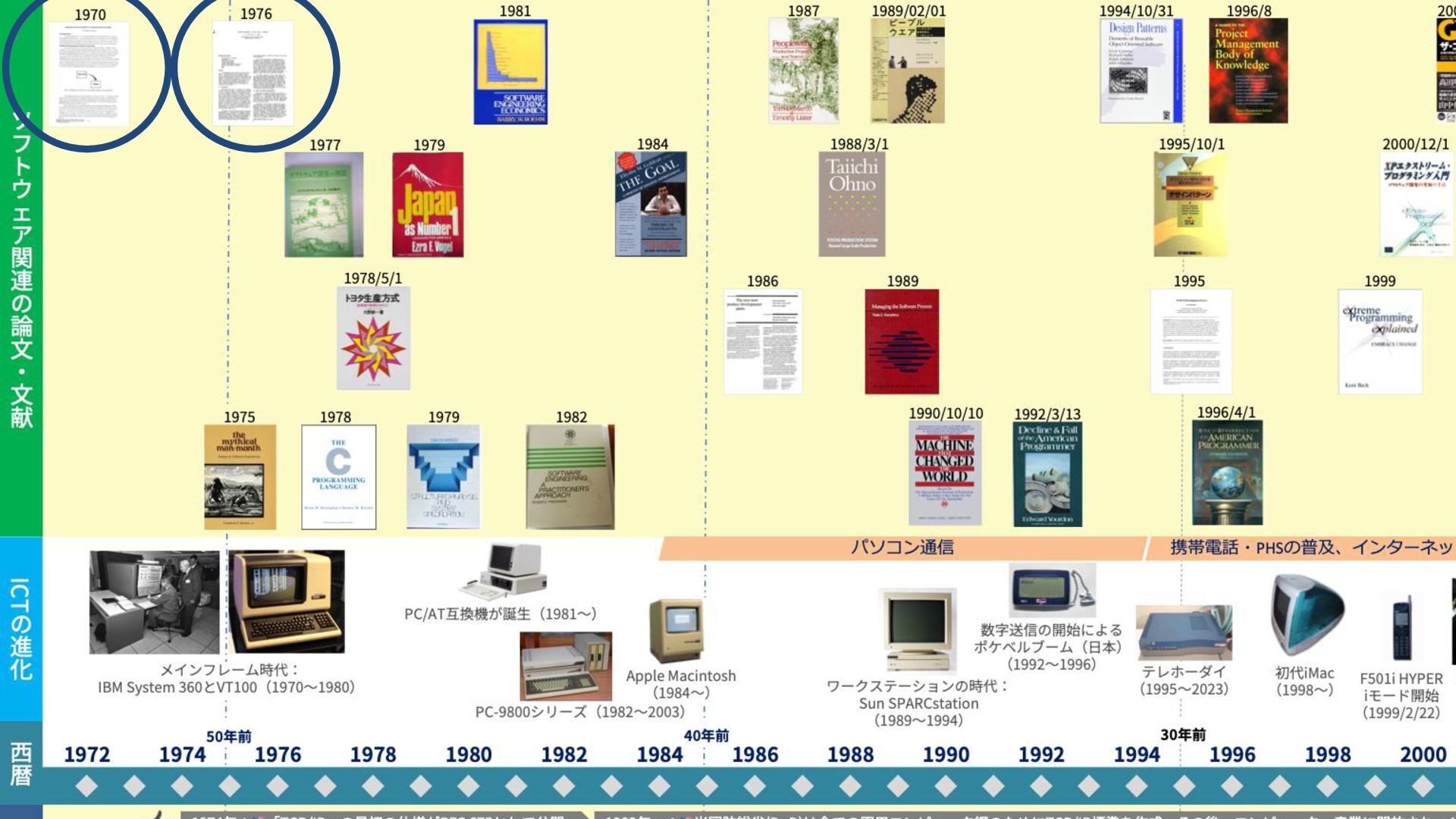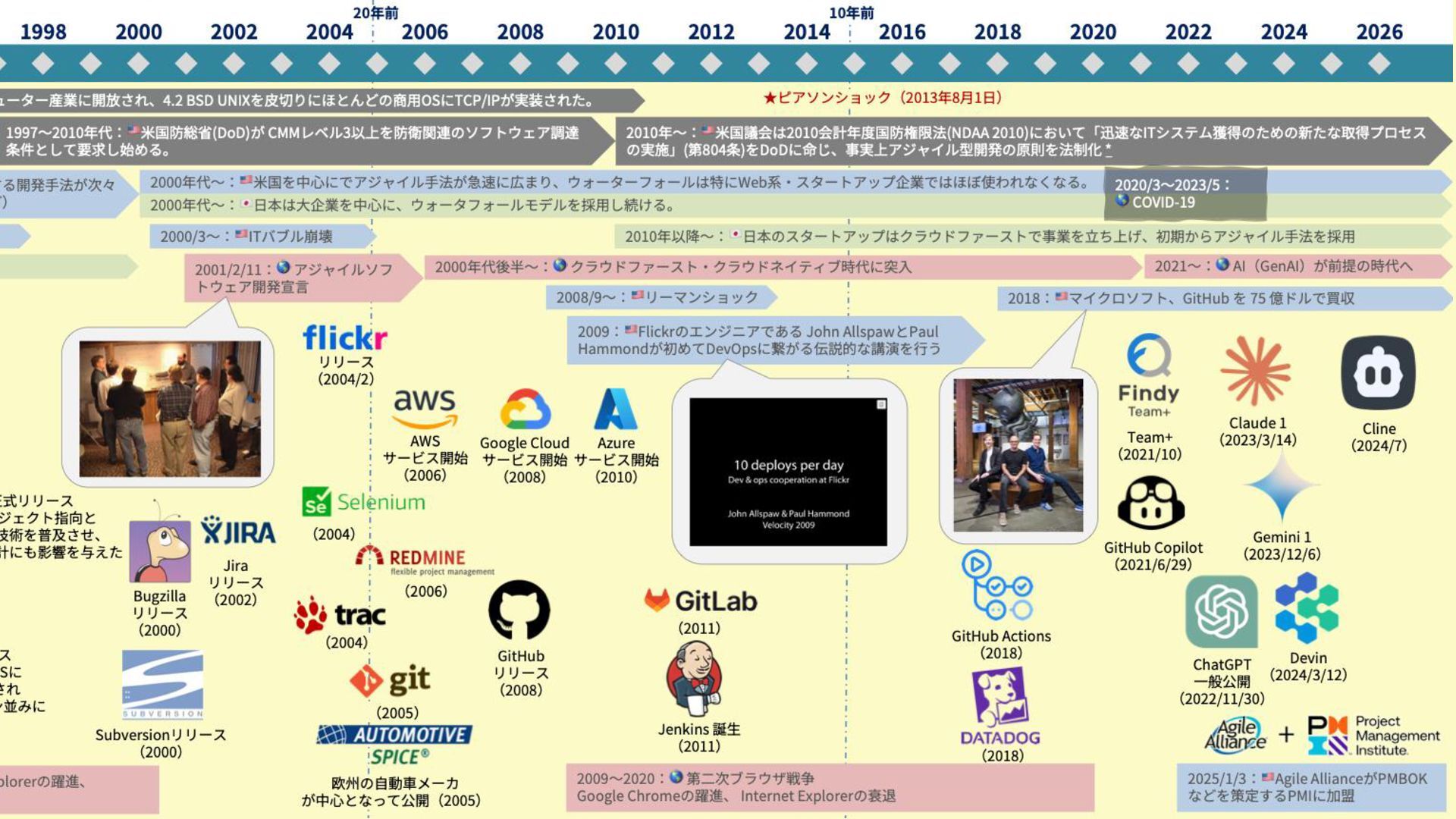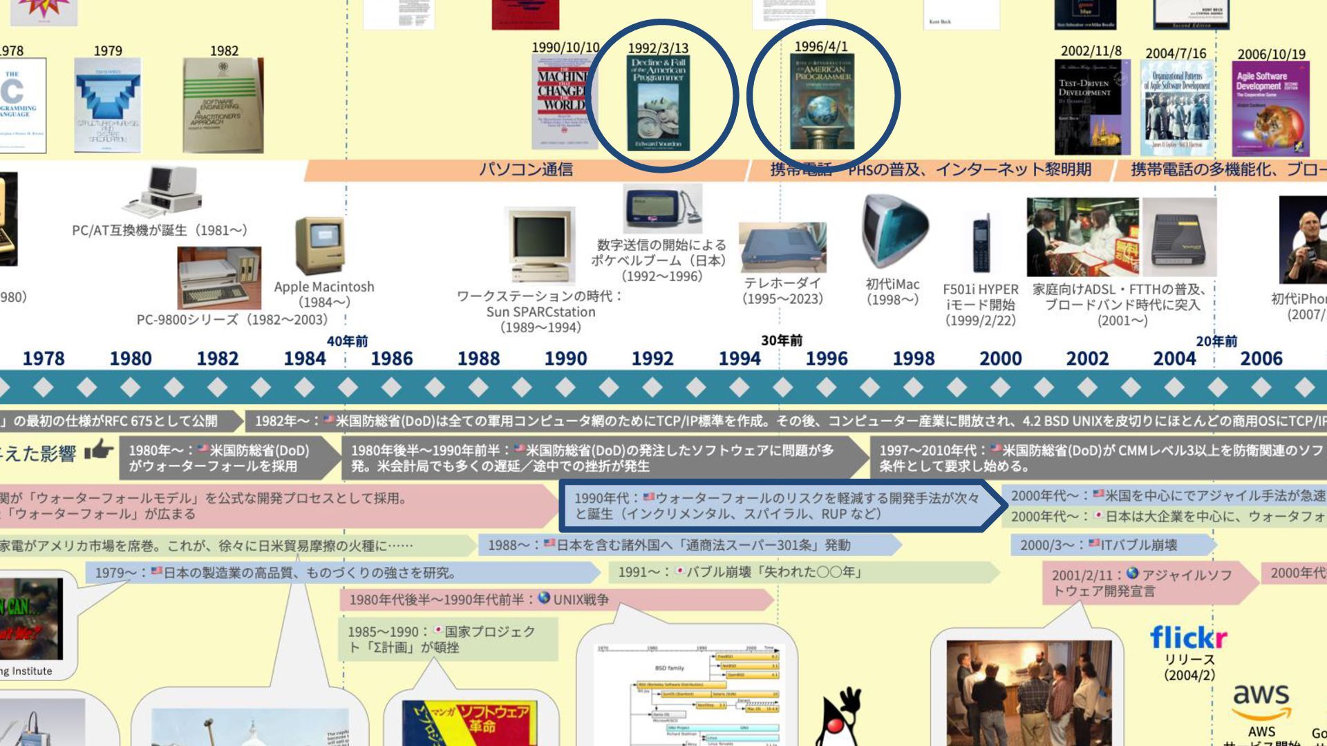 2001/2/11: アジャイルソフ トウェア開発宣言 2005/10 1991〜: バブル崩壊「失われた◦◦年」 1988〜: 日本を含む諸外国へ「通商法スーパー301条」発動 ソフト ウェア開発現 代史年表 Ver2.09 © 2025 ファ インディ株式 会社. All rights reserved. (写真およ び他社ロゴ を除く) 本資 料はフ ァイン ディ株式 会社が独自に編集・作成した もので す(一部、パブ リック ドメイン素材を含みま す)。 Findy およ び Team+ はフ ァイン ディ株式 会社の商標です。 使用されて いる写真や他社ロゴ は、各権 利者に帰属し、説明 目的での み使用していま す。その他の商品 名やロ ゴは、各社の商標また は登録 商標です。 1974 2024 1976 1978 1980 1982 1984 1986 1988 1990 1992 1994 1996 1998 2000 2002 2004 2006 2008 2010 2012 2014 2016 2018 2020 2022 Linux 0.01 リリース UNIXが商業化・断片化していく中、 Linuxはオープンソースの力で 統一的な開発基盤となり、 世界中の技術革新を支えた (1991/9/17) CVS 誕生 (1990) Subversionリリース (2000) (2005) GitHub リリース (2008) Bugzilla リリース (2000) Jira リリース (2002) AWS サービス開始 (2006) Jenkins 誕生 (2011) GitHub Actions (2018) ChatGPT 一般公開 (2022/11/30) GitHub Copilot (2021/6/29) Java v1.0 正式リリース Javaはオブジェクト指向と 仮想マシン技術を普及させ、 後の言語設計にも影響を与えた (1996) 1980年代後半〜1990年代前半: UNIX戦争 1970〜1980年代: 多くの企業や政府機関が「ウォーターフォールモデル」を公式な開発プロセスとして採用。 同時に、Royceの思惑と違う、誤解された「ウォーターフォール」が広まる Azure サービス開始 (2010) 1990〜2000: 第一次ブラウザ戦争。Internet Explorerの躍進、 Netscape Navigatorの消滅 2009〜2020: 第二次ブラウザ戦争 Google Chromeの躍進、 Internet Explorerの衰退 (2018) (2004) Google Cloud サービス開始 (2008) 欧州の自動車メーカ が中心となって公開(2005) (2011) 1985〜1990: 国家プロジェクト 「Σ計画」が頓挫 (2006) (2004) 1975 1999 2018/11/22 2004/11/16 2006/10/19 1977 1986 2002 1995 2010〜 2017/6/22 1994/10/31 1989 2024/7/11 1987 1970 1989/02/01 1982 1979 2019/9/17 1992/3/13 1996/4/1 2010/10/12 2011/7/16 2022/12/17 2011/10/18 2021/3/15 2001/5/18 1996/8 1979 2004/7/16 2013/8/1 2014/4/22 2019/9/30 2021/12/10 1978 2024/9/13 1972 2026 1997〜2010年代: 米国防総省(DoD)が CMMレベル3以上を防衛関連のソフトウェア調達 条件として要求し始める。 2000年代〜: 米国を中心にでアジャイル手法が急速に広まり、ウォーターフォールは特にWeb系・スタートアップ企業ではほぼ使われなくなる。 1990年代: ウォーターフォールのリスクを軽減する開発手法が次々 と誕生(インクリメンタル、スパイラル、RUP など) 1980年後半〜1990年前半: 米国防総省(DoD)の発注したソフトウェアに問題が多 発。米会計局でも多くの遅延/途中での挫折が発生 主 な 出 来 事 ソ フ ト ウ ェ ア 関 連 の 論 文 ・ 文 献 2010年〜: 米国議会は2010会計年度国防権限法(NDAA 2010)において「迅速なITシステム獲得のための新たな取得プロセス の実施」(第804条)をDoDに命じ、事実上アジャイル型開発の原則を法制化 * 1980年〜: 米国防総省(DoD) がウォーターフォールを採用 初代iPhone発表 (2007/1/9) PC/AT互換機が誕生(1981〜) ワークステーションの時代: Sun SPARCstation (1989〜1994) Windows95 リリース コンシューマ向けOSに TCP/IPが標準搭載され ワークステーション並みに (1995) 初代iMac (1998〜) Apple Macintosh (1984〜) 家庭向けADSL・FTTHの普及、 ブロードバンド時代に突入 (2001〜) ICT の 進 化 メインフレーム時代: IBM System 360とVT100(1970〜1980) MacBook Pro M4 Max (2024) 2018/3/27 2000/12/1 2010/7/27 2016/10/6 2005/10/7 1990/10/10 1978/5/1 1988/3/1 1984 2021/8/1 1995/10/1 2003/9/1 1976 リリース (2004/2) Point: 米国防総省(DoD)が与えた影響 1981 2021/12/1 2025/1/3: Agile AllianceがPMBOK などを策定するPMIに加盟 Claude 1 (2023/3/14) Team+ (2021/10) Gemini 1 (2023/12/6) Devin (2024/3/12) Cline (2024/7) 2021〜: AI(GenAI)が前提の時代へ 2000年代〜: 日本は大企業を中心に、ウォータフォールモデルを採用し続ける。 2018/4/1 数字送信の開始による ポケベルブーム(日本) (1992〜1996) F501i HYPER iモード開始 (1999/2/22) テレホーダイ (1995〜2023) PC-9800シリーズ(1982〜2003) 初代iPad発表 (2010/4/3) Samsung Galaxy S II (2011/5/2) 2020/3〜2023/5: COVID-19 ARMアーキテクチャのSoC Apple M1 生産(2020) 1970年代後半〜1980年代末: 日本車と家電がアメリカ市場を席巻。これが、徐々に日米貿易摩擦の火種に…… "ウォークマン” 1号機 TPS-L2 (1979) 世界初のポータブル CDプレーヤー D-50(1984) Toyota Corolla Liftback SR5 001 (1980〜) “トリニトロン” 日本製品が欧米で人気 1979〜: 日本の製造業の高品質、ものづくりの強さを研究。 2024/12/25 2013/1/10 2014/8/18 2023/11/21 2000/3〜: ITバブル崩壊 パソコン通信 携帯電話・PHSの普及、インターネット黎明期 携帯電話の多機能化、ブロードバンド時代 スマートフォン普及時代(2010年、モバイル端末利用率がパソコン利用率を超える) 1974年: 「TCP/IP」の最初の仕様がRFC 675として公開 1982年〜: 米国防総省(DoD)は全ての軍用コンピュータ網のためにTCP/IP標準を作成。その後、コンピューター産業に開放され、4.2 BSD UNIXを皮切りにほとんどの商用OSにTCP/IPが実装