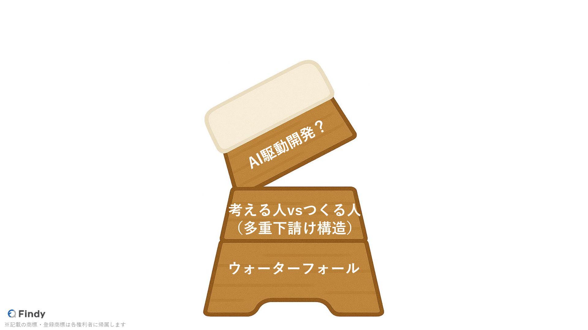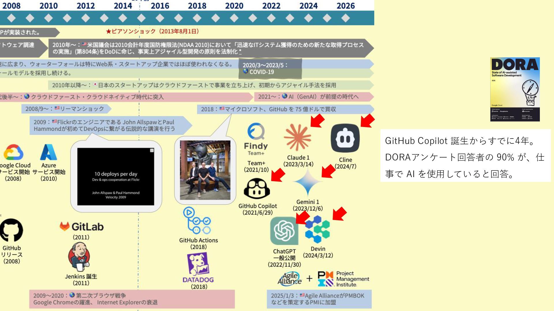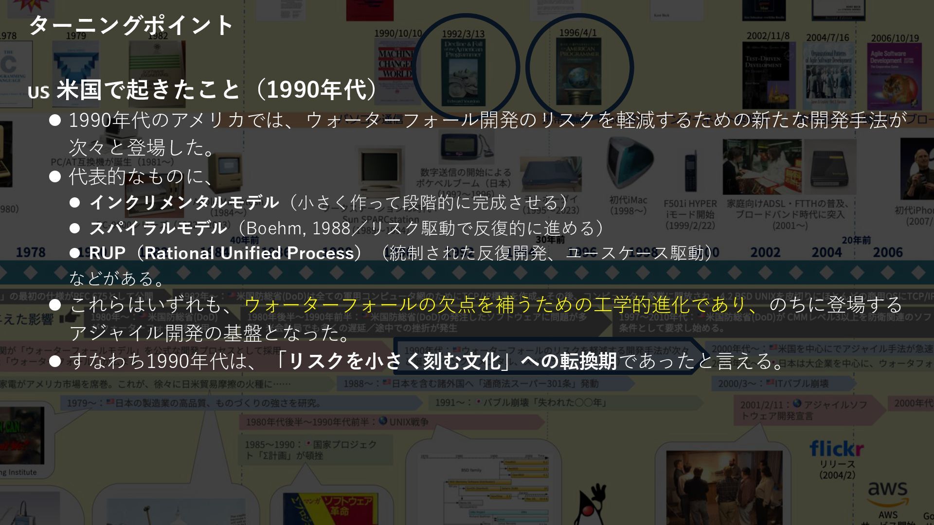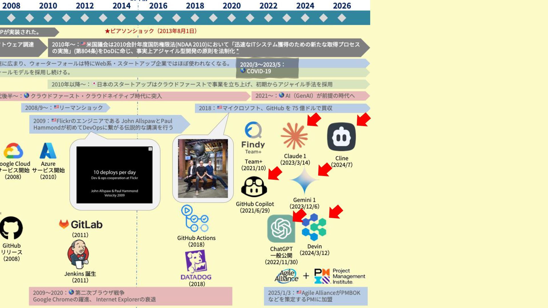 2001/2/11: アジャイルソフ トウェア開発宣言 2005/10 1991〜: バブル崩壊「失われた◦◦年」 1988〜: 日本を含む諸外国へ「通商法スーパー301条」発動 ソフト ウェア開発現 代史年表 Ver2.09 © 2025 ファ インディ株式 会社. All rights reserved. (写真およ び他社ロゴ を除く) 本資 料はフ ァイン ディ株式 会社が独自に編集・作成した もので す(一部、パブ リック ドメイン素材を含みま す)。 Findy およ び Team+ はフ ァイン ディ株式 会社の商標です。 使用されて いる写真や他社ロゴ は、各権 利者に帰属し、説明 目的での み使用していま す。その他の商品 名やロ ゴは、各社の商標また は登録 商標です。 1974 2024 1976 1978 1980 1982 1984 1986 1988 1990 1992 1994 1996 1998 2000 2002 2004 2006 2008 2010 2012 2014 2016 2018 2020 2022 Linux 0.01 リリース UNIXが商業化・断片化していく中、 Linuxはオープンソースの力で 統一的な開発基盤となり、 世界中の技術革新を支えた (1991/9/17) CVS 誕生 (1990) Subversionリリース (2000) (2005) GitHub リリース (2008) Bugzilla リリース (2000) Jira リリース (2002) AWS サービス開始 (2006) Jenkins 誕生 (2011) GitHub Actions (2018) ChatGPT 一般公開 (2022/11/30) GitHub Copilot (2021/6/29) Java v1.0 正式リリース Javaはオブジェクト指向と 仮想マシン技術を普及させ、 後の言語設計にも影響を与えた (1996) 1980年代後半〜1990年代前半: UNIX戦争 1970〜1980年代: 多くの企業や政府機関が「ウォーターフォールモデル」を公式な開発プロセスとして採用。 同時に、Royceの思惑と違う、誤解された「ウォーターフォール」が広まる Azure サービス開始 (2010) 1990〜2000: 第一次ブラウザ戦争。Internet Explorerの躍進、 Netscape Navigatorの消滅 2009〜2020: 第二次ブラウザ戦争 Google Chromeの躍進、 Internet Explorerの衰退 (2018) (2004) Google Cloud サービス開始 (2008) 欧州の自動車メーカ が中心となって公開(2005) (2011) 1985〜1990: 国家プロジェクト 「Σ計画」が頓挫 (2006) (2004) 1975 1999 2018/11/22 2004/11/16 2006/10/19 1977 1986 2002 1995 2010〜 2017/6/22 1994/10/31 1989 2024/7/11 1987 1970 1989/02/01 1982 1979 2019/9/17 1992/3/13 1996/4/1 2010/10/12 2011/7/16 2022/12/17 2011/10/18 2021/3/15 2001/5/18 1996/8 1979 2004/7/16 2013/8/1 2014/4/22 2019/9/30 2021/12/10 1978 2024/9/13 1972 2026 1997〜2010年代: 米国防総省(DoD)が CMMレベル3以上を防衛関連のソフトウェア調達 条件として要求し始める。 2000年代〜: 米国を中心にでアジャイル手法が急速に広まり、ウォーターフォールは特にWeb系・スタートアップ企業ではほぼ使われなくなる。 1990年代: ウォーターフォールのリスクを軽減する開発手法が次々 と誕生(インクリメンタル、スパイラル、RUP など) 1980年後半〜1990年前半: 米国防総省(DoD)の発注したソフトウェアに問題が多 発。米会計局でも多くの遅延/途中での挫折が発生 主 な 出 来 事 ソ フ ト ウ ェ ア 関 連 の 論 文 ・ 文 献 2010年〜: 米国議会は2010会計年度国防権限法(NDAA 2010)において「迅速なITシステム獲得のための新たな取得プロセス の実施」(第804条)をDoDに命じ、事実上アジャイル型開発の原則を法制化 * 1980年〜: 米国防総省(DoD) がウォーターフォールを採用 初代iPhone発表 (2007/1/9) PC/AT互換機が誕生(1981〜) ワークステーションの時代: Sun SPARCstation (1989〜1994) Windows95 リリース コンシューマ向けOSに TCP/IPが標準搭載され ワークステーション並みに (1995) 初代iMac (1998〜) Apple Macintosh (1984〜) 家庭向けADSL・FTTHの普及、 ブロードバンド時代に突入 (2001〜) ICT の 進 化 メインフレーム時代: IBM System 360とVT100(1970〜1980) MacBook Pro M4 Max (2024) 2018/3/27 2000/12/1 2010/7/27 2016/10/6 2005/10/7 1990/10/10 1978/5/1 1988/3/1 1984 2021/8/1 1995/10/1 2003/9/1 1976 リリース (2004/2) Point: 米国防総省(DoD)が与えた影響 1981 2021/12/1 2025/1/3: Agile AllianceがPMBOK などを策定するPMIに加盟 Claude 1 (2023/3/14) Team+ (2021/10) Gemini 1 (2023/12/6) Devin (2024/3/12) Cline (2024/7) 2021〜: AI(GenAI)が前提の時代へ 2000年代〜: 日本は大企業を中心に、ウォータフォールモデルを採用し続ける。 2018/4/1 数字送信の開始による ポケベルブーム(日本) (1992〜1996) F501i HYPER iモード開始 (1999/2/22) テレホーダイ (1995〜2023) PC-9800シリーズ(1982〜2003) 初代iPad発表 (2010/4/3) Samsung Galaxy S II (2011/5/2) 2020/3〜2023/5: COVID-19 ARMアーキテクチャのSoC Apple M1 生産(2020) 1970年代後半〜1980年代末: 日本車と家電がアメリカ市場を席巻。これが、徐々に日米貿易摩擦の火種に…… "ウォークマン” 1号機 TPS-L2 (1979) 世界初のポータブル CDプレーヤー D-50(1984) Toyota Corolla Liftback SR5 001 (1980〜) “トリニトロン” 日本製品が欧米で人気 1979〜: 日本の製造業の高品質、ものづくりの強さを研究。 2024/12/25 2013/1/10 2014/8/18 2023/11/21 2000/3〜: ITバブル崩壊 パソコン通信 携帯電話・PHSの普及、インターネット黎明期 携帯電話の多機能化、ブロードバンド時代 スマートフォン普及時代(2010年、モバイル端末利用率がパソコン利用率を超える) 1974年: 「TCP/IP」の最初の仕様がRFC 675として公開 1982年〜: 米国防総省(DoD)は全ての軍用コンピュータ網のためにTCP/IP標準を作成。その後、コンピューター産業に開放され、4.2 BSD UNIXを皮切りにほとんどの商用OSにTCP/IPが実装