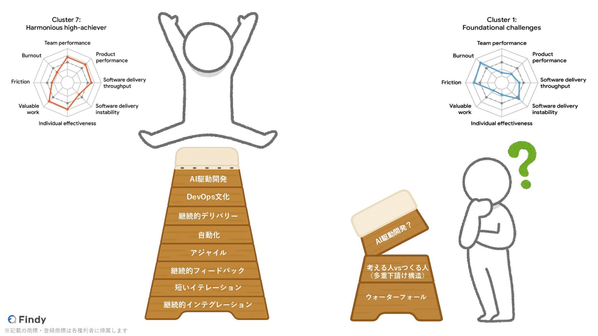 クラスター分析によって、7つのチームのアーキタイプが判明 ⚫ クラスター1「基本的な課題」グループは、サバイバル モードに陥っており、プロセスと環境に 大きなギャップがあるため、パフォーマンスが低く、システムの安定性(変化しにくさ)が高 く、燃え尽き症候群や摩擦のレベルが高い状態。 ⚫ クラスター7「調和のとれた高パフォーマンス」は、チームのウェルビーイング、プロダクトの 成果、ソフトウェア デリバリーなど、複数の分野で優れた成果を上げている。