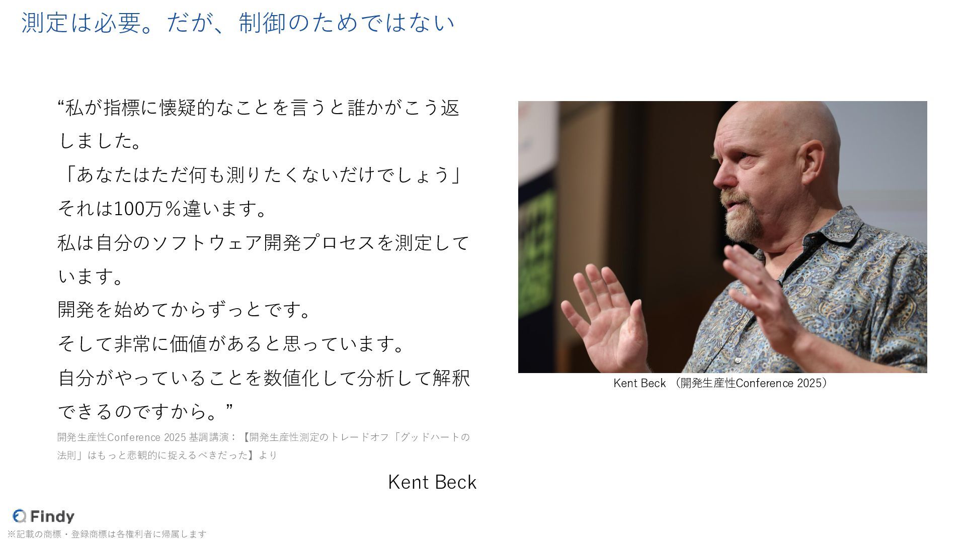 自分がやっていることを数値化して分析して解釈 できるのですから。” 開発生産性Conference 2025 基調講演:【開発生産性測定のトレードオフ「グッドハートの 法則」はもっと悲観的に捉えるべきだった】より Kent Beck Kent Beck (開発生産性Conference 2025)