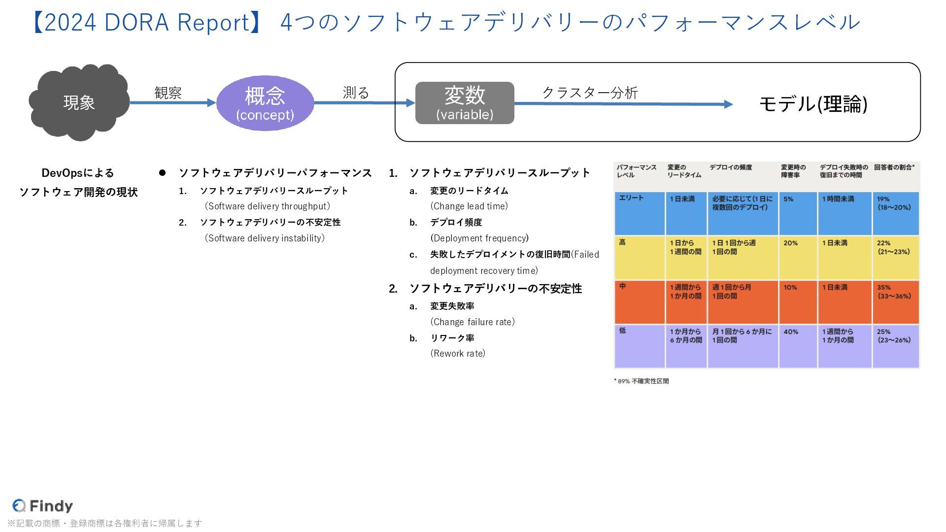 delivery throughput) 2. ソフトウェアデリバリーの不安定性 (Software delivery instability) 1. ソフトウェアデリバリースループット a. 変更のリードタイム (Change lead time) b. デプロイ頻度 (Deployment frequency) c. 失敗したデプロイメントの復旧時間(Failed deployment recovery time) 2. ソフトウェアデリバリーの不安定性 a. 変更失敗率 (Change failure rate) b. リワーク率 (Rework rate) DevOpsによる ソフトウェア開発の現状 観察 測る クラスター分析