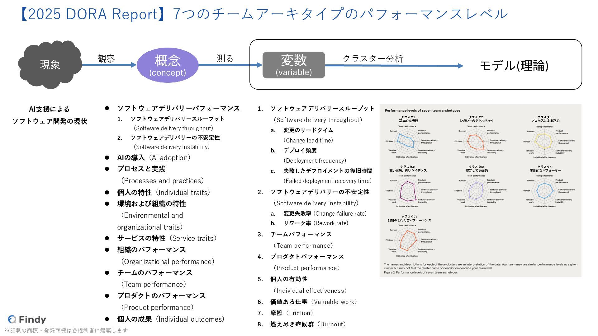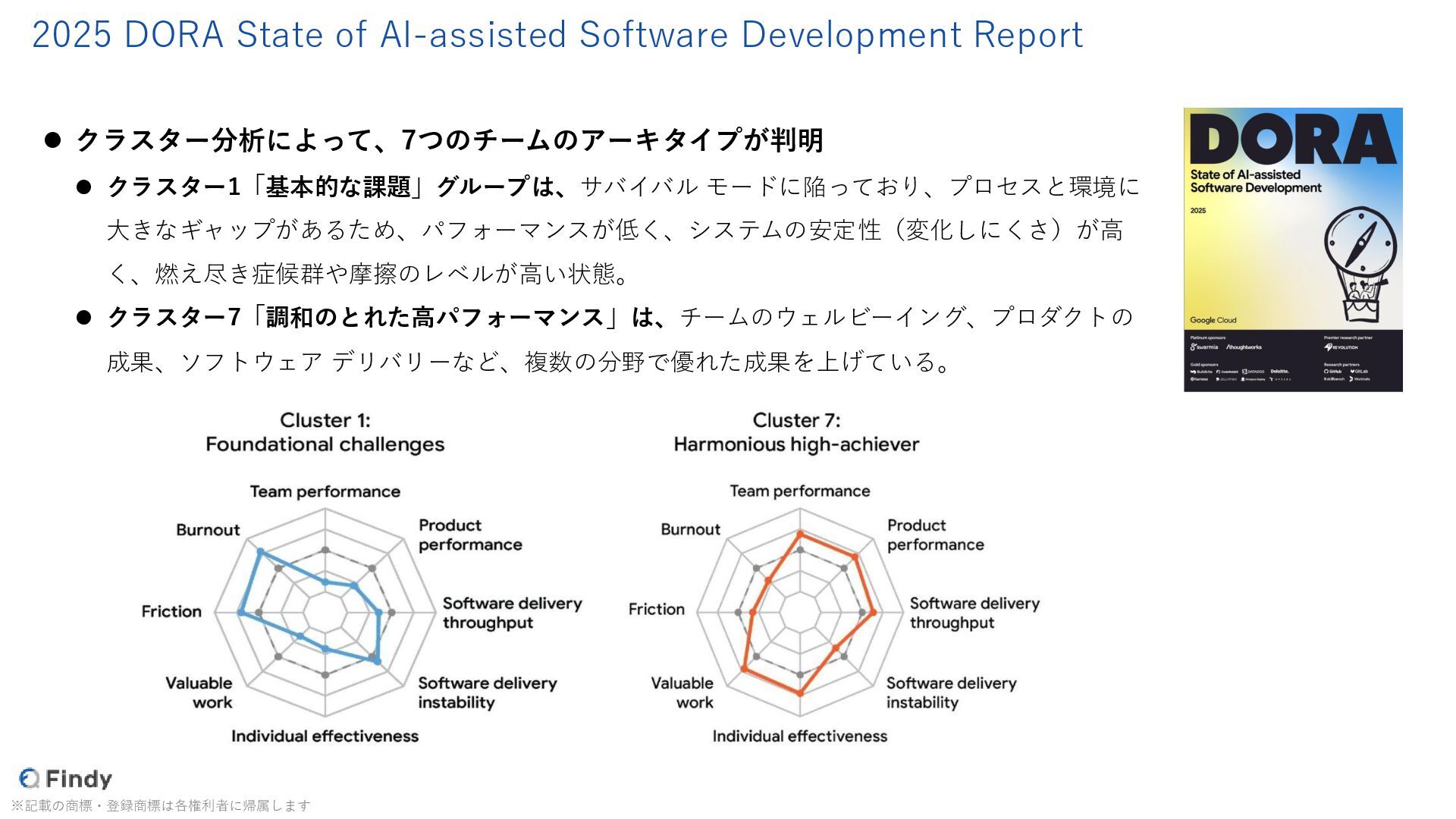 変更のリードタイム (Change lead time) b. デプロイ頻度 (Deployment frequency) c. 失敗したデプロイメントの復旧時間 (Failed deployment recovery time) 2. ソフトウェアデリバリーの不安定性 (Software delivery instability) a. 変更失敗率 (Change failure rate) b. リワーク率 (Rework rate) 3. チームパフォーマンス (Team performance) 4. プロダクトパフォーマンス (Product performance) 5. 個人の有効性 (Individual effectiveness) 6. 価値ある仕事(Valuable work) 7. 摩擦(Friction) 8. 燃え尽き症候群(Burnout) クラスタ1: 基本的な課題 クラスタ2: レガシーのボトルネック クラスタ3: プロセスによる制約 クラスタ4: 高い影響、低いケイデンス クラスタ5: 安定して計画的 クラスタ6: 実用的なパフォーマー クラスタ7: 調和のとれた高パフォーマンス 観察 測る AI支援による ソフトウェア開発の現状 ⚫ ソフトウェアデリバリーパフォーマンス 1. ソフトウェアデリバリースループット (Software delivery throughput) 2. ソフトウェアデリバリーの不安定性 (Software delivery instability) ⚫ AIの導入(AI adoption) ⚫ プロセスと実践 (Processes and practices) ⚫ 個人の特性(Individual traits) ⚫ 環境および組織の特性 (Environmental and organizational traits) ⚫ サービスの特性(Service traits) ⚫ 組織のパフォーマンス (Organizational performance) ⚫ チームのパフォーマンス (Team performance) ⚫ プロダクトのパフォーマンス (Product performance) ⚫ 個人の成果(Individual outcomes) クラスター分析