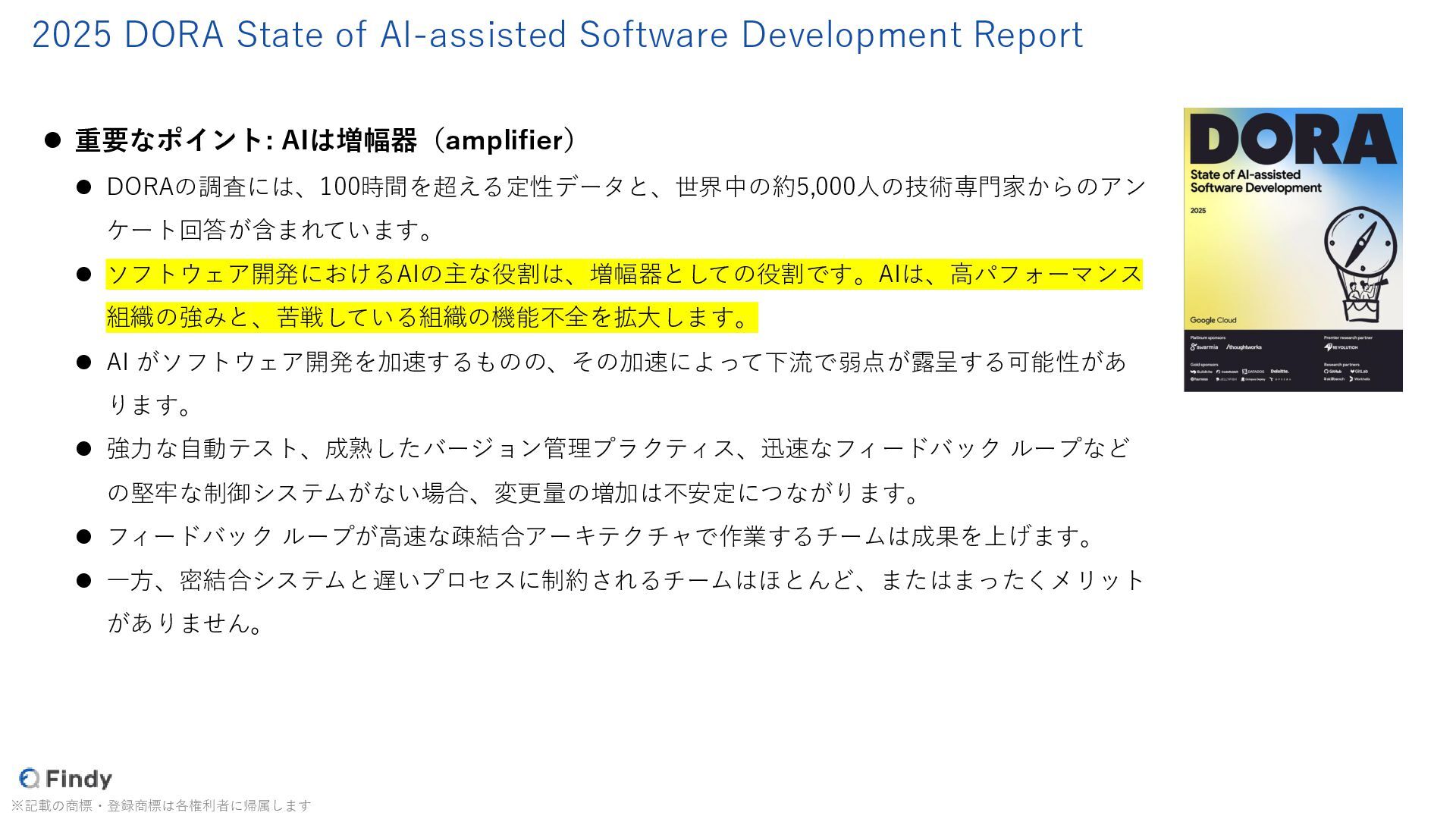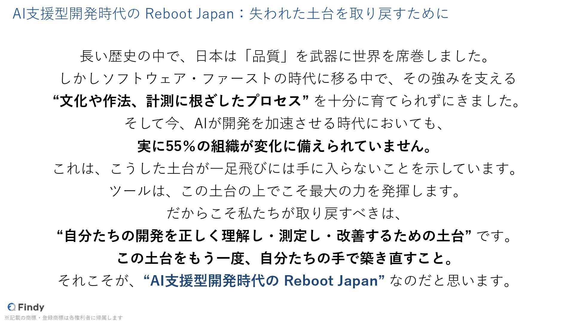 これは、こうした土台が一足飛びには手に入らないことを示しています。 ツールは、この土台の上でこそ最大の力を発揮します。 だからこそ私たちが取り戻すべきは、 “自分たちの開発を正しく理解し・測定し・改善するための土台” です。 この土台をもう一度、自分たちの手で築き直すこと。 それこそが、“AI支援型開発時代の Reboot Japan” なのだと思います。
