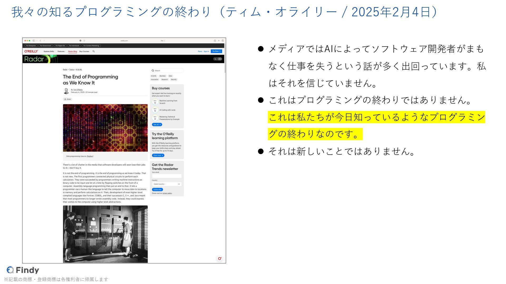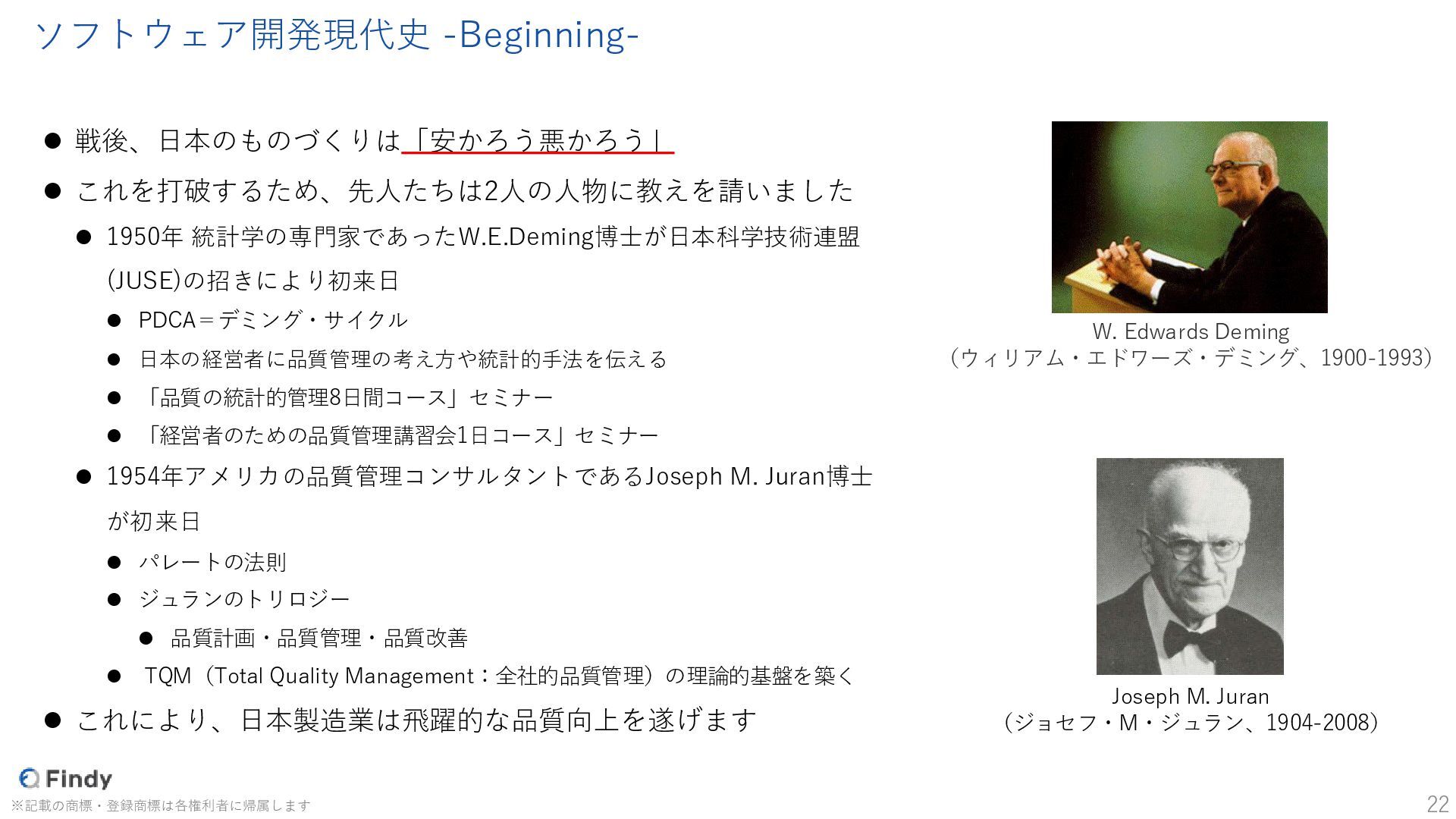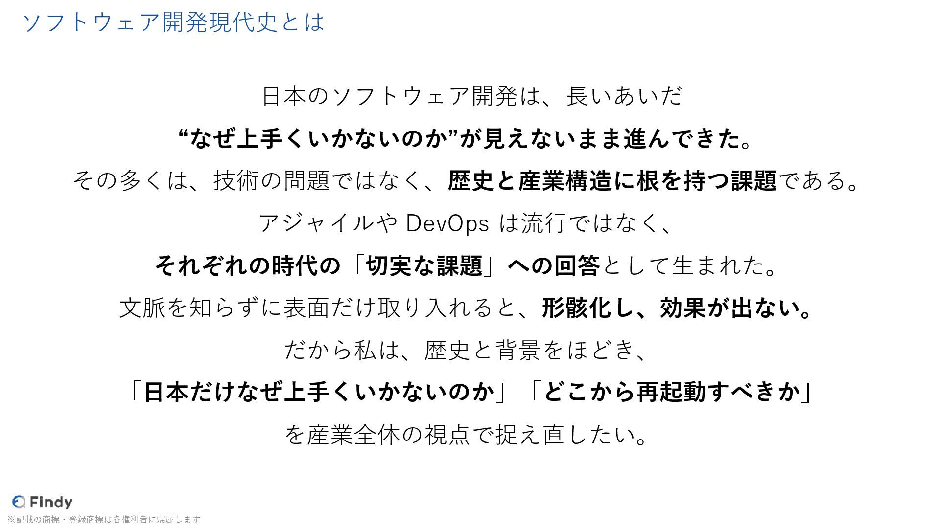 2001/2/11: アジャイルソフ トウェア開発宣言 2005/10 1991〜: バブル崩壊「失われた◦◦年」 1988〜: 日本を含む諸外国へ「通商法スーパー301条」発動 ソフト ウェア開発現 代史年表 Ver2.09 © 2025 ファ インデ ィ株式 会社. All rights reserved. (写真 および 他社ロ ゴを除 く) 本資 料はフ ァイン ディ株 式会社 が独自 に編集 ・作成 したも のです (一部 、パブ リック ドメイ ン素材 を含み ます) 。 Findy およ び Team+ はフ ァイン ディ株 式会社 の商標 です。 使用 されて いる写 真や他 社ロゴ は、各 権利者 に帰属 し、説 明目的 でのみ 使用し ていま す。そ の他の 商品名 やロゴ は、各 社の商 標また は登録 商標で す。 1974 2024 1976 1978 1980 1982 1984 1986 1988 1990 1992 1994 1996 1998 2000 2002 2004 2006 2008 2010 2012 2014 2016 2018 2020 2022 Linux 0.01 リリース UNIXが商業化・断片化していく中、 Linuxはオープンソースの力で 統一的な開発基盤となり、 世界中の技術革新を支えた (1991/9/17) CVS 誕生 (1990) Subversionリリース (2000) (2005) GitHub リリース (2008) Bugzilla リリース (2000) Jira リリース (2002) AWS サービス開始 (2006) Jenkins 誕生 (2011) GitHub Actions (2018) ChatGPT 一般公開 (2022/11/30) GitHub Copilot (2021/6/29) Java v1.0 正式リリース Javaはオブジェクト指向と 仮想マシン技術を普及させ、 後の言語設計にも影響を与えた (1996) 1980年代後半〜1990年代前半: UNIX戦争 1970〜1980年代: 多くの企業や政府機関が「ウォーターフォールモデル」を公式な開発プロセスとして採用。 同時に、Royceの思惑と違う、誤解された「ウォーターフォール」が広まる Azure サービス開始 (2010) 1990〜2000: 第一次ブラウザ戦争。Internet Explorerの躍進、 Netscape Navigatorの消滅 2009〜2020: 第二次ブラウザ戦争 Google Chromeの躍進、 Internet Explorerの衰退 (2018) (2004) Google Cloud サービス開始 (2008) 欧州の自動車メーカ が中心となって公開(2005) (2011) 1985〜1990: 国家プロジェクト 「Σ計画」が頓挫 (2006) (2004) 1975 1999 2018/11/22 2004/11/16 2006/10/19 1977 1986 2002 1995 2010〜 2017/6/22 1994/10/31 1989 2024/7/11 1987 1970 1989/02/01 1982 1979 2019/9/17 1992/3/13 1996/4/1 2010/10/12 2011/7/16 2022/12/17 2011/10/18 2021/3/15 2001/5/18 1996/8 1979 2004/7/16 2013/8/1 2014/4/22 2019/9/30 2021/12/10 1978 2024/9/13 1972 2026 1997〜2010年代: 米国防総省(DoD)が CMMレベル3以上を防衛関連のソフトウェア調達 条件として要求し始める。 2000年代〜: 米国を中心にでアジャイル手法が急速に広まり、ウォーターフォールは特にWeb系・スタートアップ企業ではほぼ使われなくなる。 1990年代: ウォーターフォールのリスクを軽減する開発手法が次々 と誕生(インクリメンタル、スパイラル、RUP など) 1980年後半〜1990年前半: 米国防総省(DoD)の発注したソフトウェアに問題が多発。 米会計局でも多くの遅延/途中での挫折が発生 主 な 出 来 事 ソ フ ト ウ ェ ア 関 連 の 論 文 ・ 文 献 2010年〜: 米国議会は2010会計年度国防権限法(NDAA 2010)において「迅速なITシステム獲得のための新たな取得プロセス の実施」(第804条)をDoDに命じ、事実上アジャイル型開発の原則を法制化* 1980年〜: 米国防総省(DoD) がウォーターフォールを採用 初代iPhone発表 (2007/1/9) PC/AT互換機が誕生(1981〜) ワークステーションの時代: Sun SPARCstation (1989〜1994) Windows95 リリース コンシューマ向けOSに TCP/IPが標準搭載され ワークステーション並みに (1995) 初代iMac (1998〜) Apple Macintosh (1984〜) 家庭向けADSL・FTTHの普及、 ブロードバンド時代に突入 (2001〜) ICT の 進 化 メインフレーム時代: IBM System 360とVT100(1970〜1980) MacBook Pro M4 Max (2024) 2018/3/27 2000/12/1 2010/7/27 2016/10/6 2005/10/7 1990/10/10 1978/5/1 1988/3/1 1984 2021/8/1 1995/10/1 2003/9/1 1976 リリース (2004/2) Point: 米国防総省(DoD)が与えた影響 1981 2021/12/1 2025/1/3: Agile AllianceがPMBOK などを策定するPMIに加盟 Claude 1 (2023/3/14) Team+ (2021/10) Gemini 1 (2023/12/6) Devin (2024/3/12) Cline (2024/7) 2021〜: AI(GenAI)が前提の時代へ 2000年代〜: 日本は大企業を中心に、ウォータフォールモデルを採用し続ける。 2018/4/1 数字送信の開始による ポケベルブーム(日本) (1992〜1996) F501i HYPER iモード開始 (1999/2/22) テレホーダイ (1995〜2023) PC-9800シリーズ(1982〜2003) 初代iPad発表 (2010/4/3) Samsung Galaxy S II (2011/5/2) 2020/3〜2023/5: COVID-19 ARMアーキテクチャのSoC Apple M1 生産(2020) 1970年代後半〜1980年代末: 日本車と家電がアメリカ市場を席巻。これが、徐々に日米貿易摩擦の火種に…… "ウォークマン” 1号機 TPS-L2 (1979) 世界初のポータブル CDプレーヤー D-50(1984) Toyota Corolla Liftback SR5 001 (1980〜) “トリニトロン” 日本製品が欧米で人気 1979〜: 日本の製造業の高品質、ものづくりの強さを研究。 2024/12/25 2013/1/10 2014/8/18 2023/11/21 2000/3〜: ITバブル崩壊 パソコン通信 携帯電話・PHSの普及、インターネット黎明期 携帯電話の多機能化、ブロードバンド時代 スマートフォン普及時代(2010年、モバイル端末利用率がパソコン利用率を超える) 1974年: 「TCP/IP」の最初の仕様がRFC 675として公開 1982年〜: 米国防総省(DoD)は全ての軍用コンピュータ網のためにTCP/IP標準を作成。その後、コンピューター産業に開放され、4.2 BSD UNIXを皮切りにほとんどの商