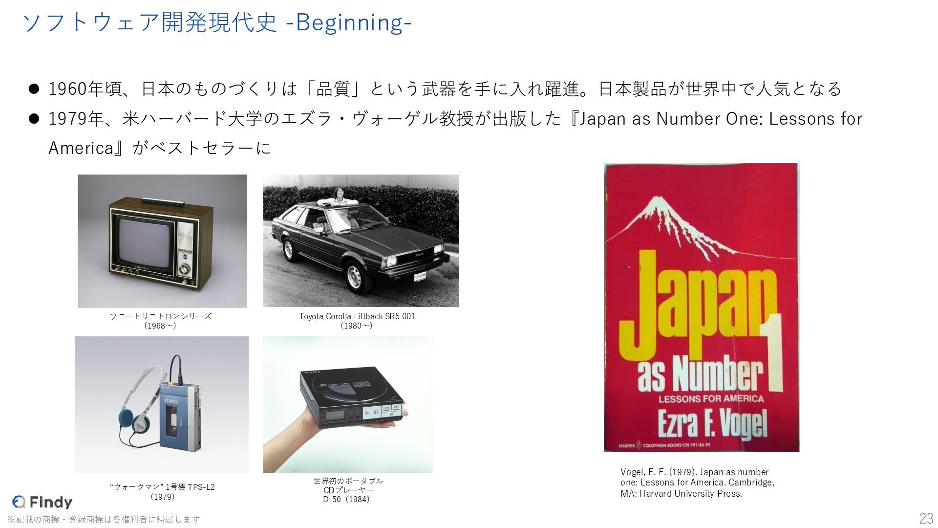 One: Lessons for America』がベストセラーに “ウォークマン” 1号機 TPS-L2 (1979) Toyota Corolla Liftback SR5 001 (1980〜) ソニートリニトロンシリーズ (1968〜) Vogel, E. F. (1979). Japan as number one: Lessons for America. Cambridge, MA: Harvard University Press. 世界初のポータブル CDプレーヤー D-50(1984)