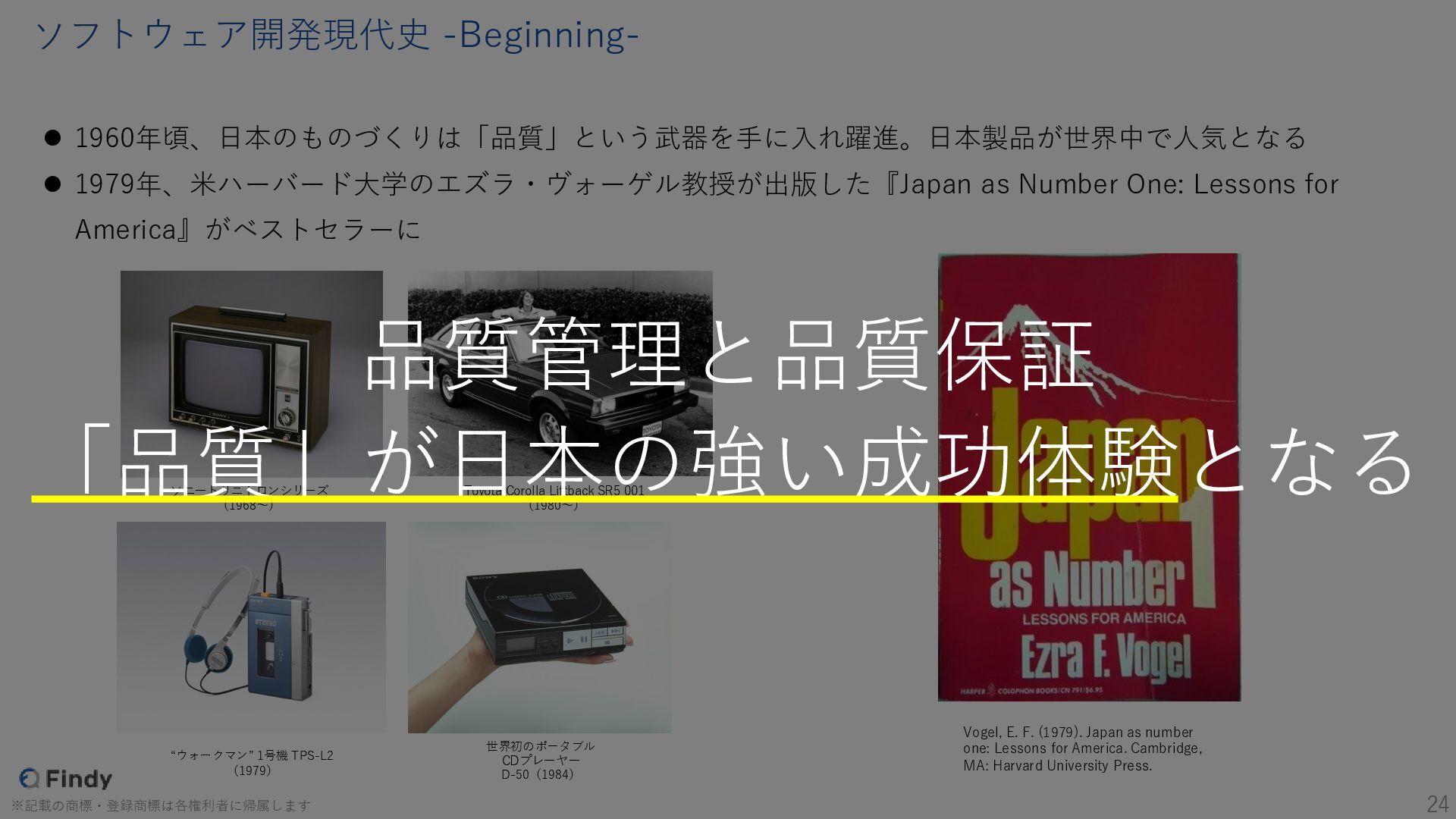 7. ※記載の商標・登録商標は各権利者に帰属します 23 ソフトウェア開発現代史 -Beginning- ⚫ 1960年頃、日本のものづくりは「品質」という武器を手に入れ躍進。日本製品が世界中で人気となる ⚫ 1979年、米ハーバード大学のエズラ・ヴォーゲル教授が出版した『Japan as Number