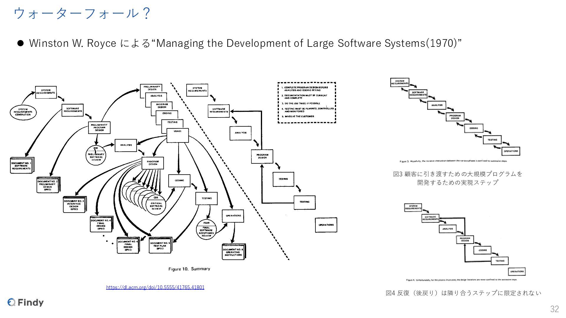 Large Software Systems(1970)” Winston W. Royce (ウィンストン・W・ロイス) https://dl.acm.org/doi/10.5555/41765.41801