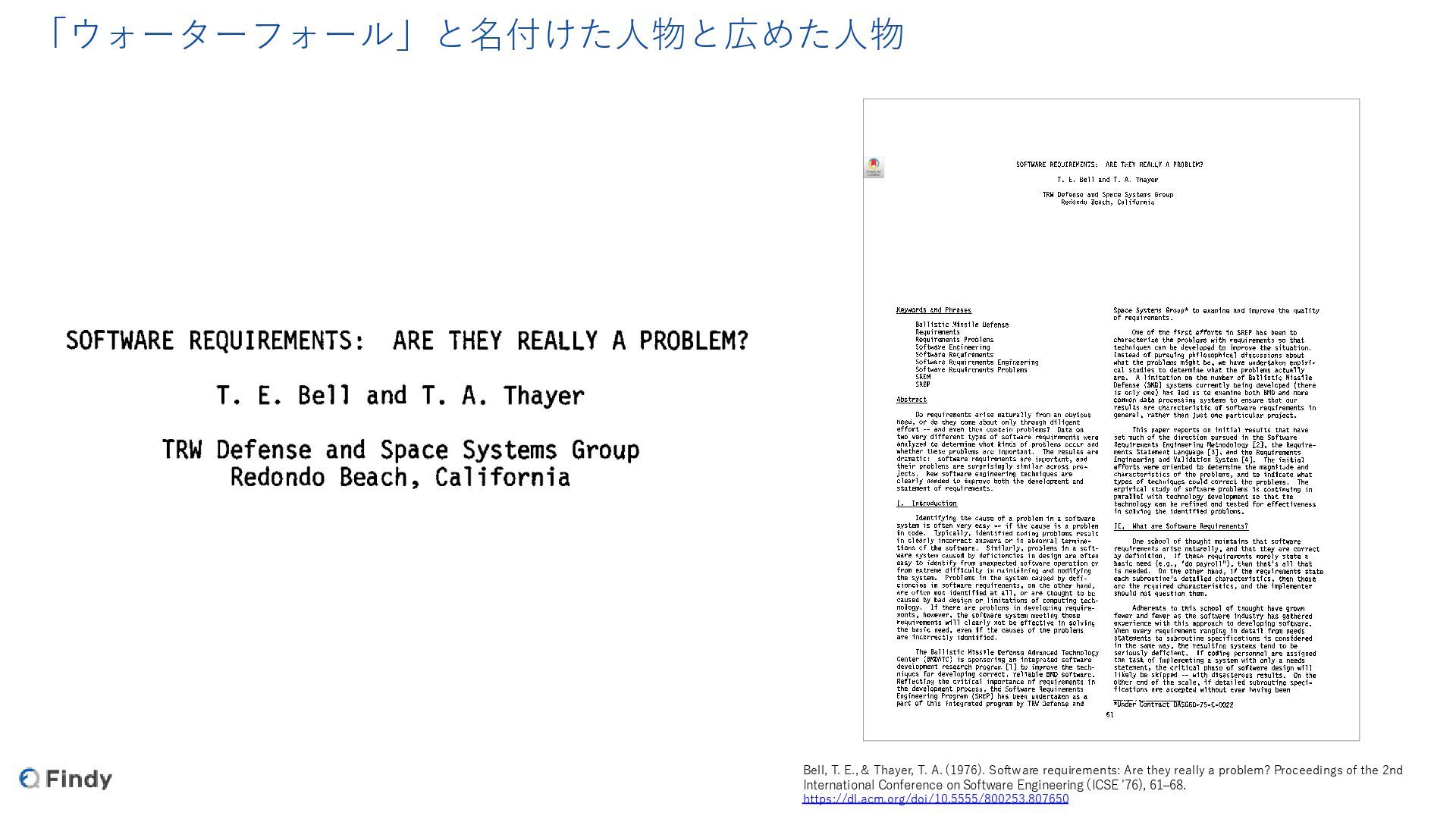 Problem?」では、Winston W. Royceの1970年論文を参照し、 「開発活動のウォーターフォール(滝)」という表現を使用してソフトウ ェア開発プロセスを説明しました。 ⚫ BellとThayerは、Royceの1970年の論文を正確には理解していなかったよ うです(読んだの?というレベル)。Royceの論文にはBellとThayerの Figure 1に似た図が含まれていましたが、彼はそのモデルについて「上記 の実装は失敗を招く」と記述しています。 ⚫ しかし、BellとThayerは要件の不備が設計や実装段階での失敗につながる と述べ、「トップダウン型で進む厳密なプロセス」の必要性を主張しまし た。この主張が間接的にウォーターフォールの誤解を促進したのです。 ⚫ さらに、Barry Boehm氏が1981年の著書「Software Engineering Economics」でRoyce氏のモデルをウォーターフォール型として紹介した ことで、この誤解が業界全体に定着しました。 ⚫ そして、彼らの図(Figure 1)は、USA DoD(米国国防総省)に受け入れ られ、DOD-STD-2167A (1988) に組み込まれ、ミッションクリティカルな ソフトウェア開発にデフォルトとして要求されるようになります。 Bell, T. E., & Thayer, T. A. (1976). Software requirements: Are they really a problem? Proceedings of the 2nd International Conference on Software Engineering (ICSE '76), 61–68. https://dl.acm.org/doi/10.5555/800253.807650 “一連の要求仕様書に対する同じトップダウンアプローチが、 専門的な軍事用語を使わずに、Royce [5] の優れた論文で説明 されている。彼は開発活動の「ウォーターフォール」という概 念を導入した。このアプローチでは、ソフトウェアは図1に示 される規律正しい活動の順序で開発される。”