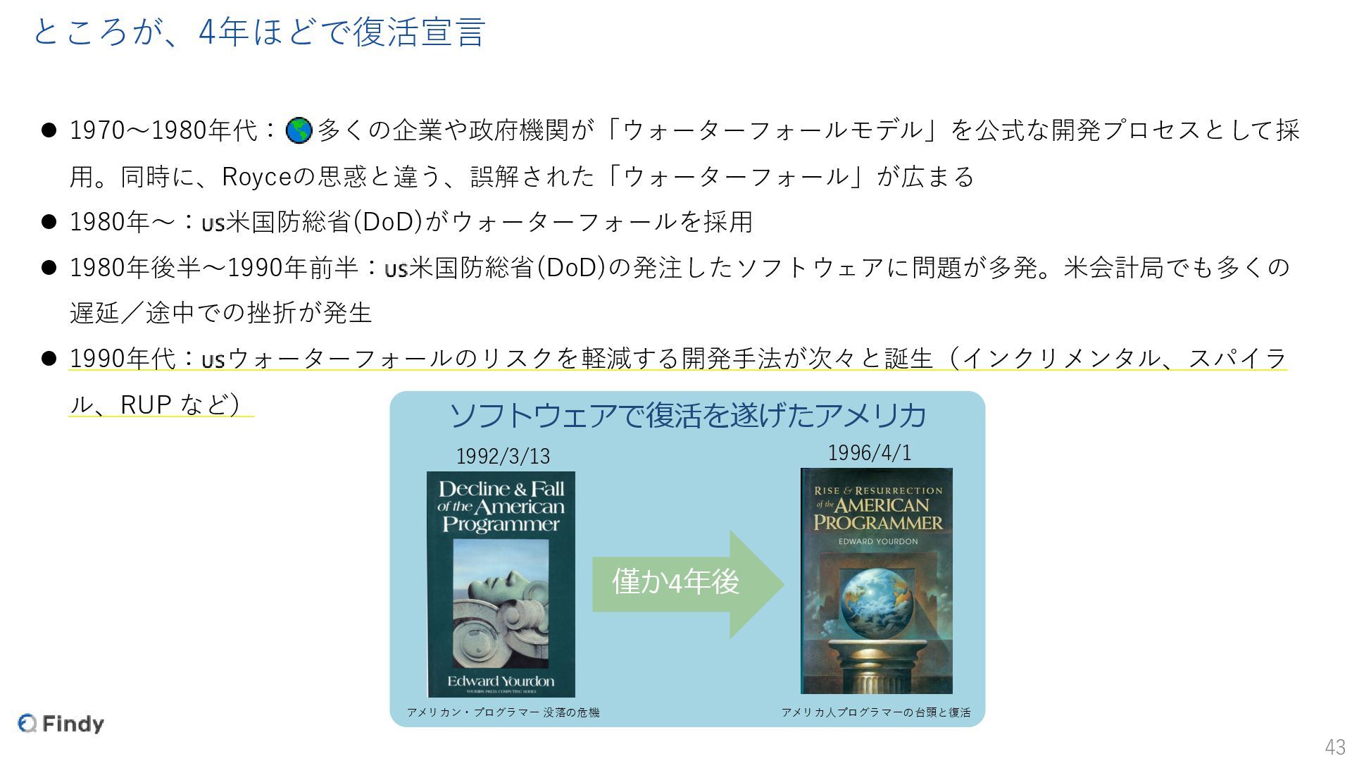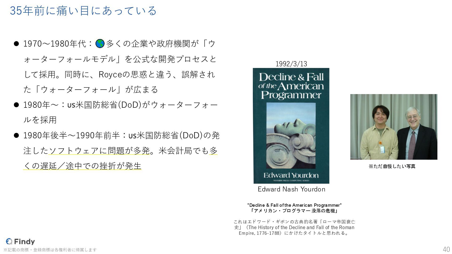 1980年〜: 米国防総省(DoD)がウォーターフォー ルを採用 ⚫ 1980年後半〜1990年前半: 米国防総省(DoD)の発 注したソフトウェアに問題が多発。米会計局でも多 くの遅延/途中での挫折が発生 1992/3/13 ※ただ自慢したい写真 Edward Nash Yourdon "Decline & Fall of the American Programmer" 「アメリカン・プログラマー 没落の危機」 これはエドワード・ギボンの古典的名著「ローマ帝国衰亡 史」(The History of the Decline and Fall of the Roman Empire, 1776-1788)にかけたタイトルと思われる。