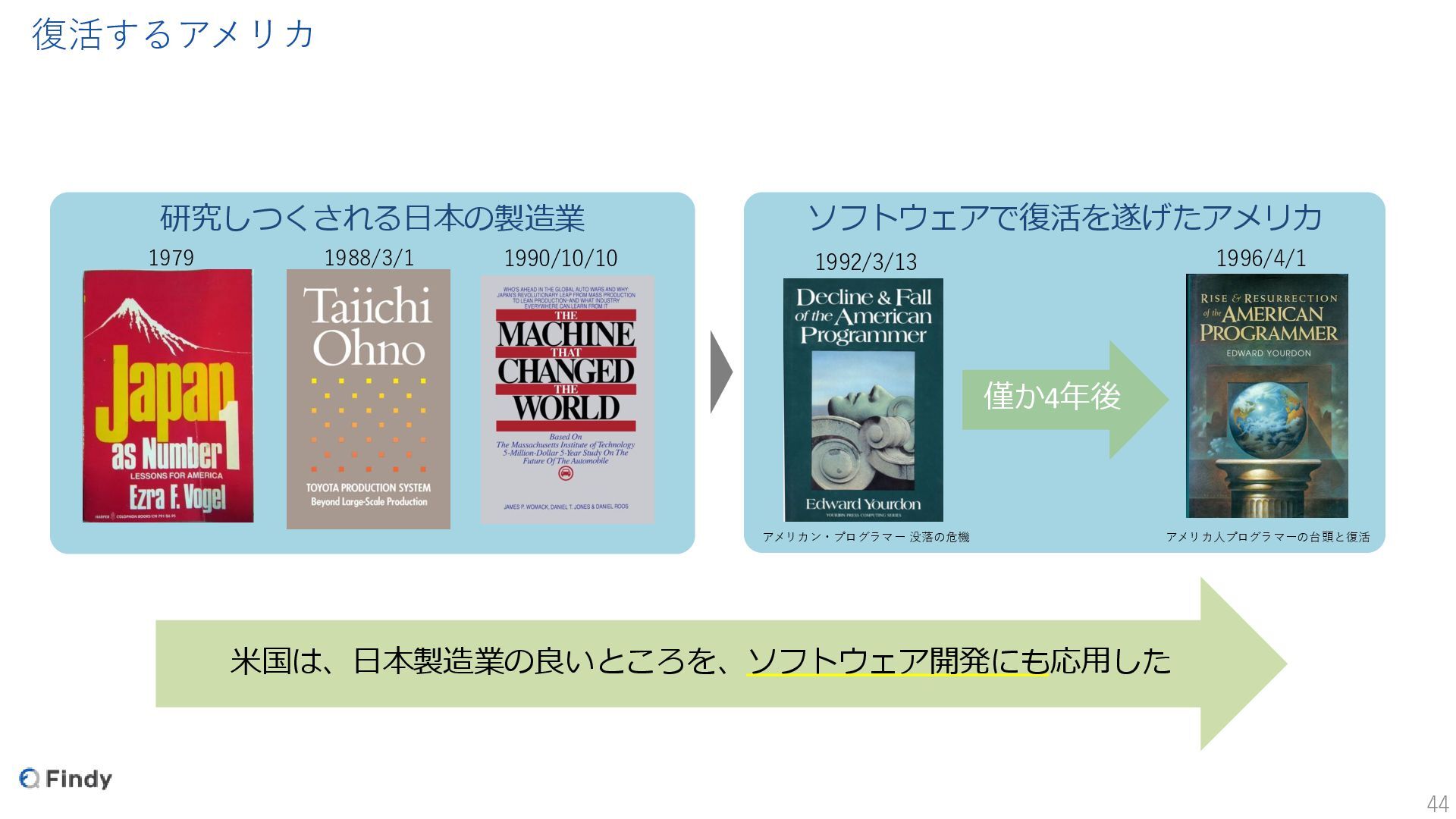 19. 復活するアメリカ 44 ソフトウェアで復活を遂げたアメリカ 1992/3/13 1996/4/1 僅か4年後 アメリカ人プログラマーの台頭と復活 研究しつくされる日本の製造業 1990/10/10 1988/3/1
