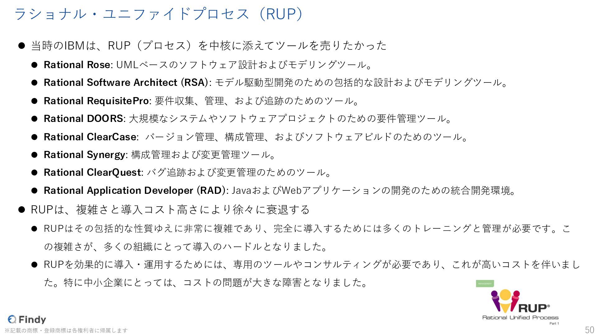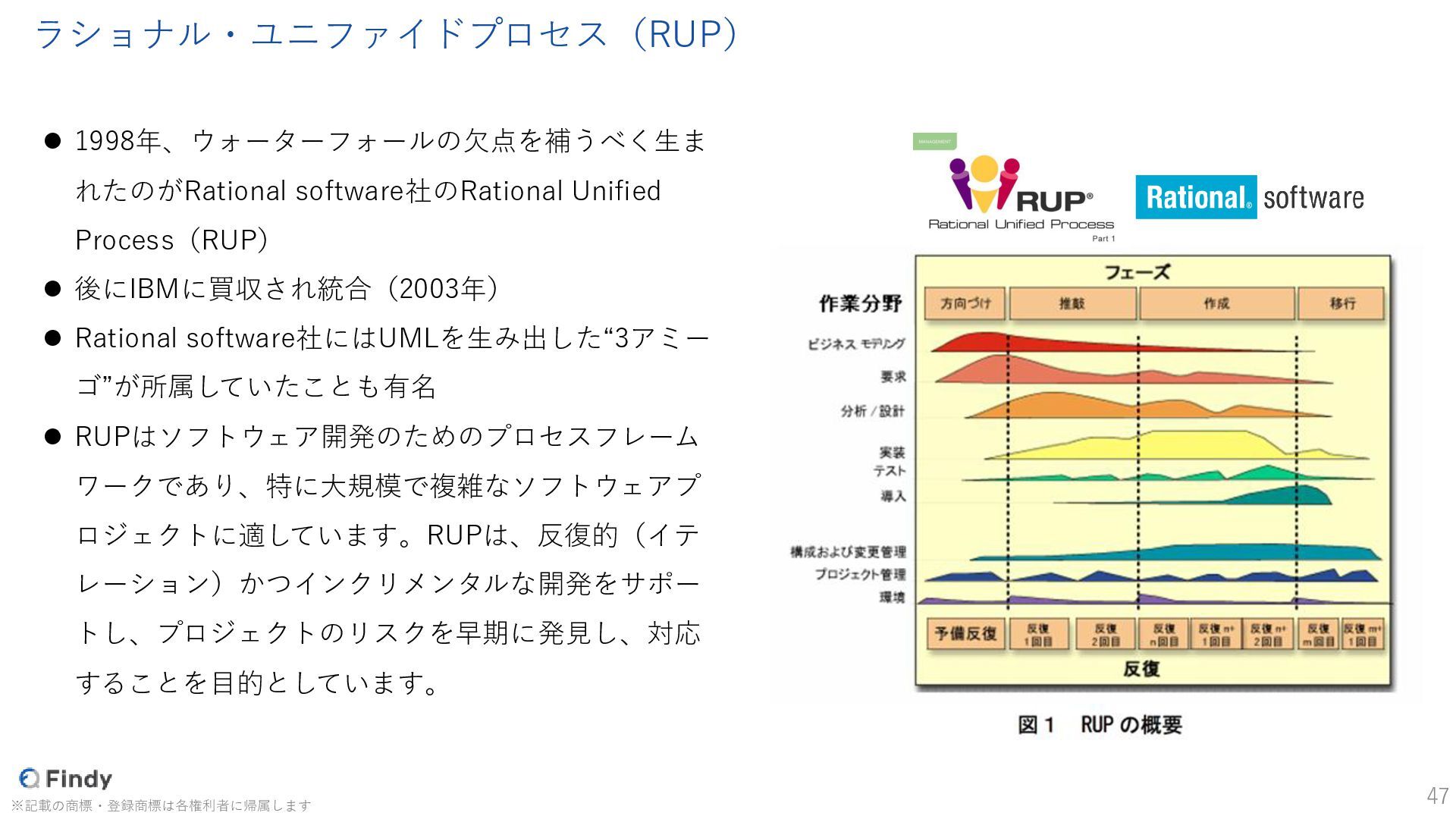 後にIBMに買収され統合(2003年) ⚫ Rational software社にはUMLを生み出した“3アミー ゴ”が所属していたことも有名 ⚫ RUPはソフトウェア開発のためのプロセスフレーム ワークであり、特に大規模で複雑なソフトウェアプ ロジェクトに適しています。RUPは、反復的(イテ レーション)かつインクリメンタルな開発をサポー トし、プロジェクトのリスクを早期に発見し、対応 することを目的としています。