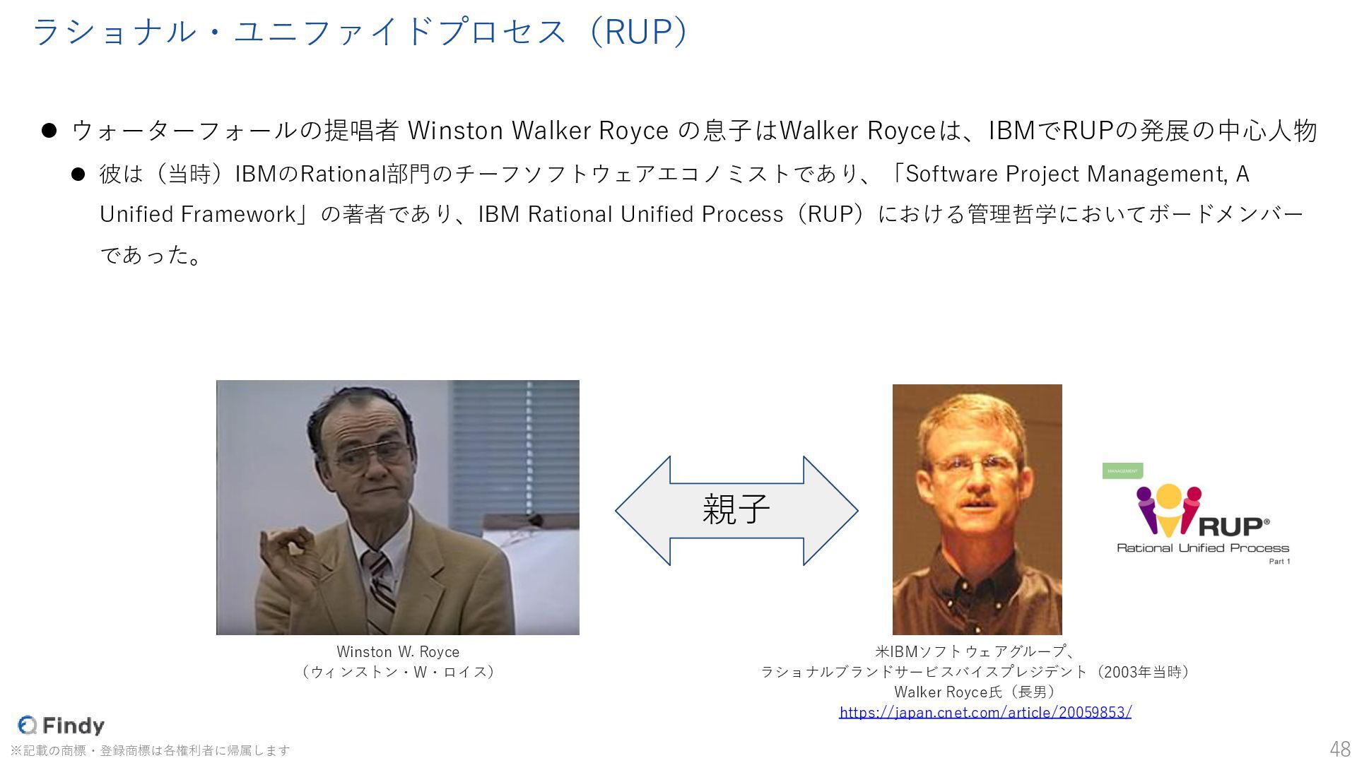 21. ※記載の商標・登録商標は各権利者に帰属します 48 ⚫ ウォーターフォールの提唱者 Winston Walker Royce の息子はWalker Royceは、IBMでRUPの発展の中心人物 ⚫