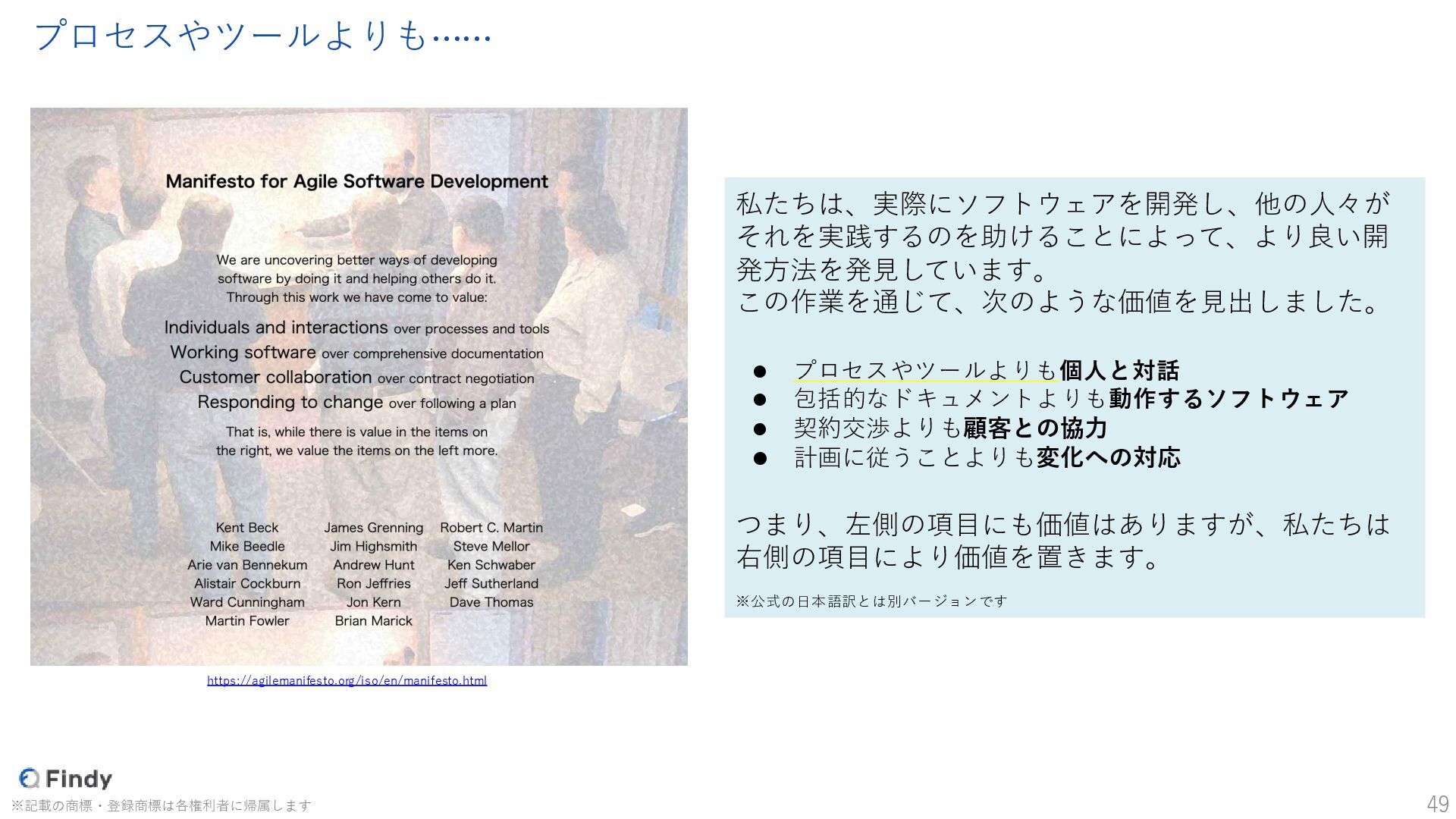 22. ※記載の商標・登録商標は各権利者に帰属します プロセスやツールよりも⋯⋯ 49 私たちは、実際にソフトウェアを開発し、他の人々が それを実践するのを助けることによって、より良い開 発方法を発見しています。 この作業を通じて、次のような価値を見出しました。 ⚫ プロセスやツールよりも個人と対話 ⚫