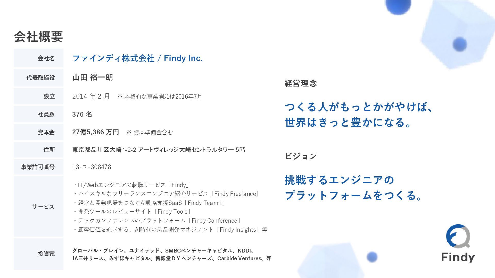 経営理念 会社名 ファインディ株式会社 / Findy Inc. 代表取締役 山田 裕一朗 設立 2014 年 2 月 ※ 本格的な事業開始は2016年7月 社員数 376 名 資本金 27億5,386 万円 ※ 資本準備金含む 住所 東京都品川区大崎1-2-2 アートヴィレッジ大崎セントラルタワー 5階 事業許可番号 13-ユ-308478 サービス ・IT/Webエンジニアの転職サービス「Findy」 ・ハイスキルなフリーランスエンジニア紹介サービス「Findy Freelance」 ・経営と開発現場をつなぐAI戦略支援SaaS「Findy Team+」 ・開発ツールのレビューサイト「Findy Tools」 ・テックカンファレンスのプラットフォーム「Findy Conference」 ・顧客価値を追求する、AI時代の製品開発マネジメント「Findy Insights」等 投資家 グローバル・ブレイン、ユナイテッド、SMBCベンチャーキャピタル、KDDI、 JA三井リース、みずほキャピタル、博報堂DYベンチャーズ、Carbide Ventures、等