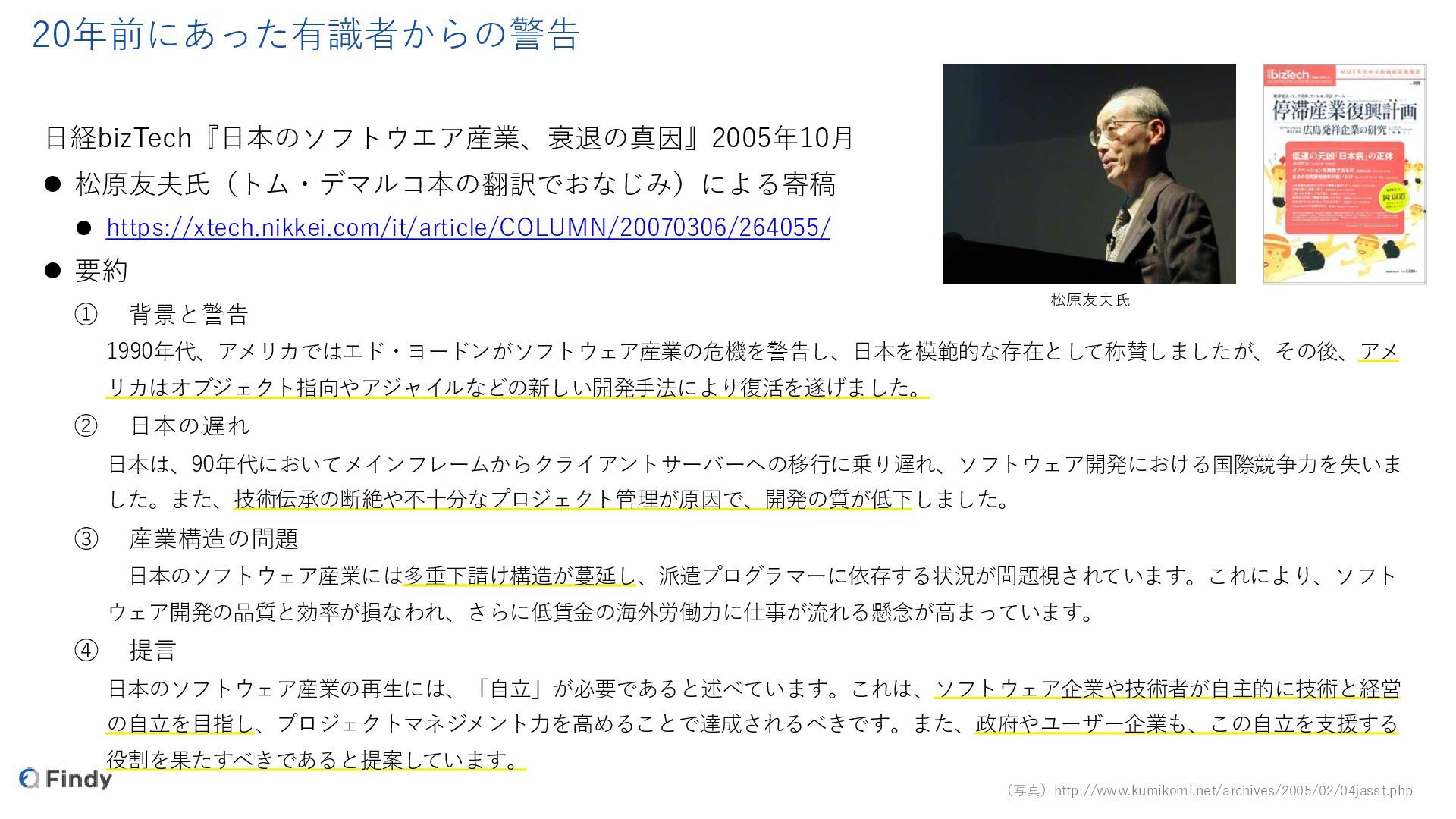 25. 20年前にあった有識者からの警告 日経bizTech『日本のソフトウエア産業、衰退の真因』2005年10月 ⚫ 松原友夫氏(トム・デマルコ本の翻訳でおなじみ)による寄稿 ⚫ https://xtech.nikkei.com/it/article/COLUMN/20070306/264055/ ⚫ 要約 ① 背景と警告