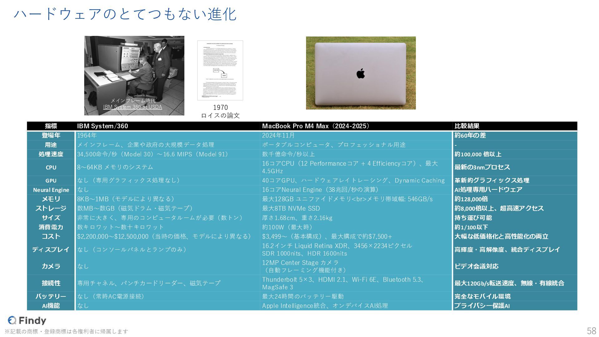26. ※記載の商標・登録商標は各権利者に帰属します ハードウェアのとてつもない進化 58 指標 IBM System/360 MacBook Pro M4 Max(2024-2025)