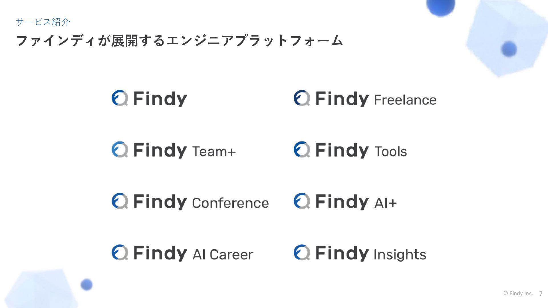 3. 会社概要 © 2024 Findy Inc. 挑戦するエンジニアの プラットフォームをつくる。 ビジョン つくる人がもっとかがやけば、 世界はきっと豊かになる。
