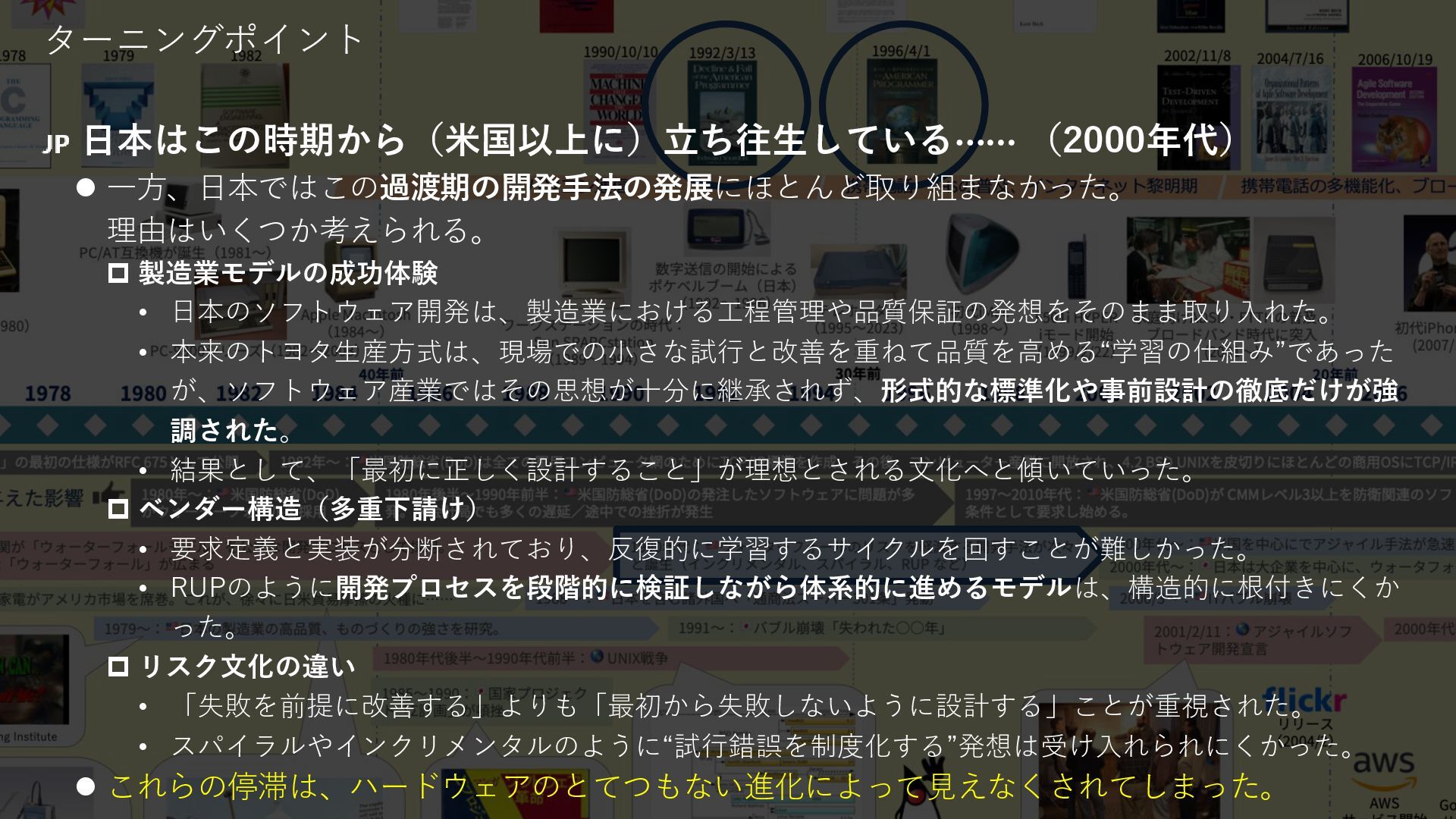 • 本来のトヨタ生産方式は、現場での小さな試行と改善を重ねて品質を高める“学習の仕組み”であった が、ソフトウェア産業ではその思想が十分に継承されず、形式的な標準化や事前設計の徹底だけが強 調された。 • 結果として、「最初に正しく設計すること」が理想とされる文化へと傾いていった。  ベンダー構造(多重下請け) • 要求定義と実装が分断されており、反復的に学習するサイクルを回すことが難しかった。 • RUPのように開発プロセスを段階的に検証しながら体系的に進めるモデルは、構造的に根付きにくか った。  リスク文化の違い • 「失敗を前提に改善する」よりも「最初から失敗しないように設計する」ことが重視された。 • スパイラルやインクリメンタルのように“試行錯誤を制度化する”発想は受け入れられにくかった。 ⚫ これらの停滞は、ハードウェアのとてつもない進化によって見えなくされてしまった。