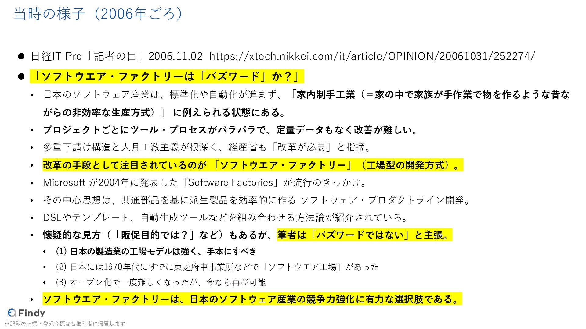 29. ※記載の商標・登録商標は各権利者に帰属します 当時の様子(2006年ごろ) ⚫ 日経IT Pro「記者の目」2006.11.02 https://xtech.nikkei.com/it/article/OPINION/20061031/252274/ ⚫ 「ソフトウエア・ファクトリーは「バズワード」か?」 • 日本のソフトウェア産業は、標準化や自動化が進まず、「家内制手工業(=家の中で家族が手作業で物を作るような昔な