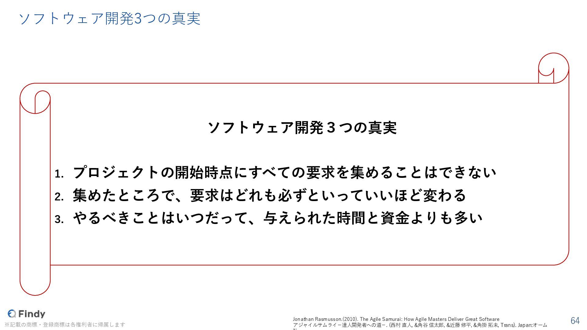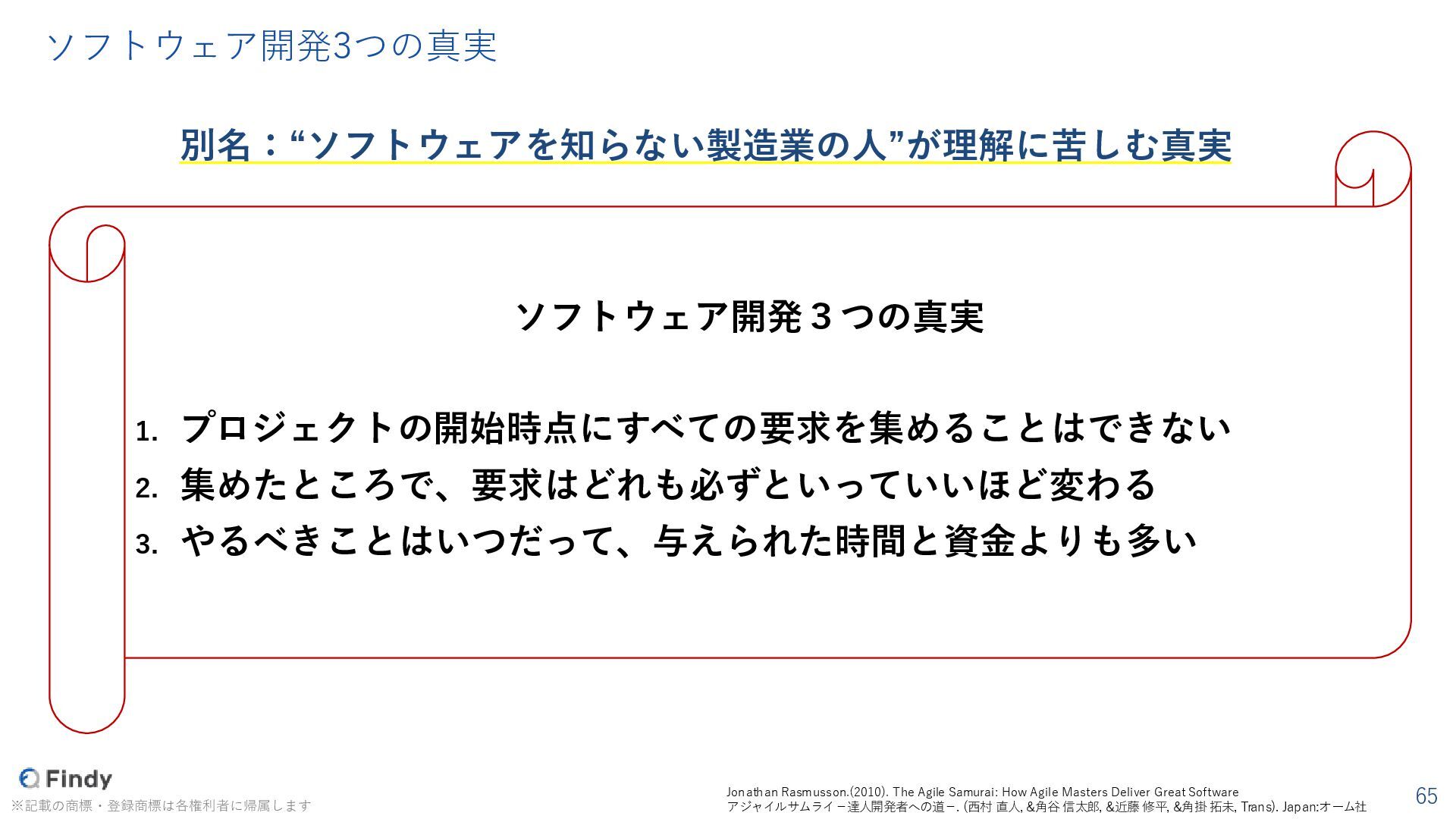 30. ※記載の商標・登録商標は各権利者に帰属します ソフトウェア開発3つの真実 65 ソフトウェア開発3つの真実 1. プロジェクトの開始時点にすべての要求を集めることはできない 2. 集めたところで、要求はどれも必ずといっていいほど変わる 3. やるべきことはいつだって、与えられた時間と資金よりも多い