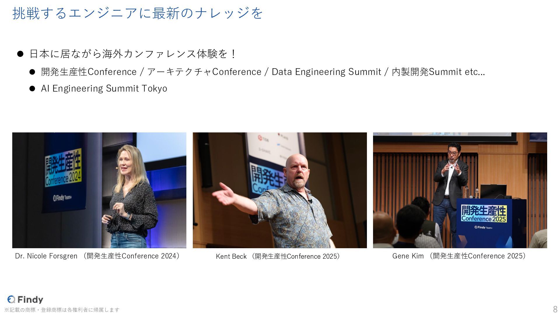 Data Engineering Summit / 内製開発Summit etc... ⚫ AI Engineering Summit Tokyo Dr. Nicole Forsgren (開発生産性Conference 2024) Gene Kim (開発生産性Conference 2025) Kent Beck (開発生産性Conference 2025)