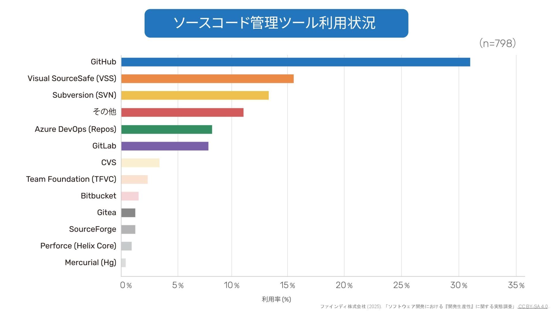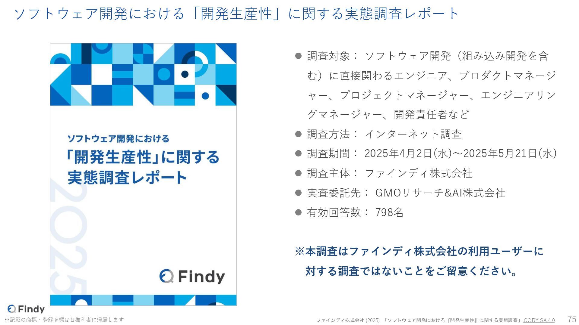 インターネット調査 ⚫ 調査期間: 2025年4月2日(水)〜2025年5月21日(水) ⚫ 調査主体: ファインディ株式会社 ⚫ 実査委託先: GMOリサーチ&AI株式会社 ⚫ 有効回答数: 798名 ※本調査はファインディ株式会社の利用ユーザーに 対する調査ではないことをご留意ください。 ファインディ株式会社 (2025). 「ソフトウェア開発における『開発生産性』に関する実態調査」.CC BY-SA 4.0. 75