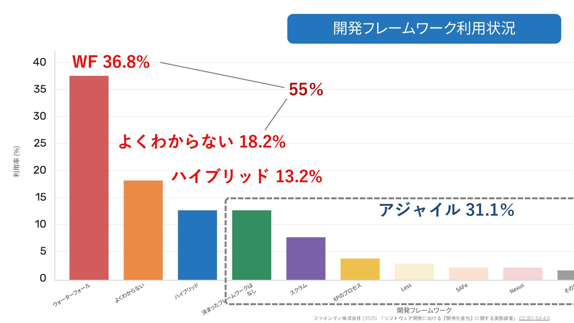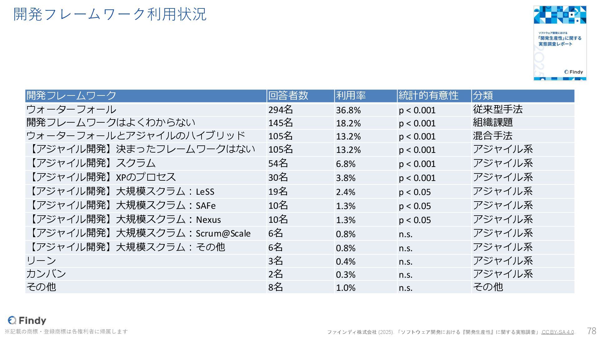 p < 0.001 従来型手法 開発フレームワークはよくわからない 145名 18.2% p < 0.001 組織課題 ウォーターフォールとアジャイルのハイブリッド 105名 13.2% p < 0.001 混合手法 【アジャイル開発】決まったフレームワークはない 105名 13.2% p < 0.001 アジャイル系 【アジャイル開発】スクラム 54名 6.8% p < 0.001 アジャイル系 【アジャイル開発】XPのプロセス 30名 3.8% p < 0.001 アジャイル系 【アジャイル開発】大規模スクラム:LeSS 19名 2.4% p < 0.05 アジャイル系 【アジャイル開発】大規模スクラム:SAFe 10名 1.3% p < 0.05 アジャイル系 【アジャイル開発】大規模スクラム:Nexus 10名 1.3% p < 0.05 アジャイル系 【アジャイル開発】大規模スクラム:Scrum@Scale 6名 0.8% n.s. アジャイル系 【アジャイル開発】大規模スクラム:その他 6名 0.8% n.s. アジャイル系 リーン 3名 0.4% n.s. アジャイル系 カンバン 2名 0.3% n.s. アジャイル系 その他 8名 1.0% n.s. その他 78 ファインディ株式会社 (2025). 「ソフトウェア開発における『開発生産性』に関する実態調査」.CC BY-SA 4.0.