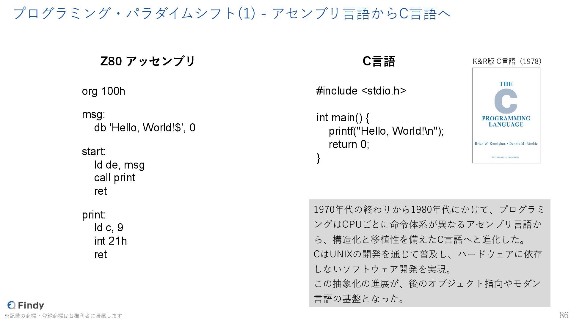 World!$', 0 start: ld de, msg call print ret print: ld c, 9 int 21h ret #include <stdio.h> int main() { printf("Hello, World!\n"); return 0; } Z80 アッセンブリ C言語 K&R版 C言語(1978) 1970年代の終わりから1980年代にかけて、プログラミ ングはCPUごとに命令体系が異なるアセンブリ言語か ら、構造化と移植性を備えたC言語へと進化した。 CはUNIXの開発を通じて普及し、ハードウェアに依存 しないソフトウェア開発を実現。 この抽象化の進展が、後のオブジェクト指向やモダン 言語の基盤となった。