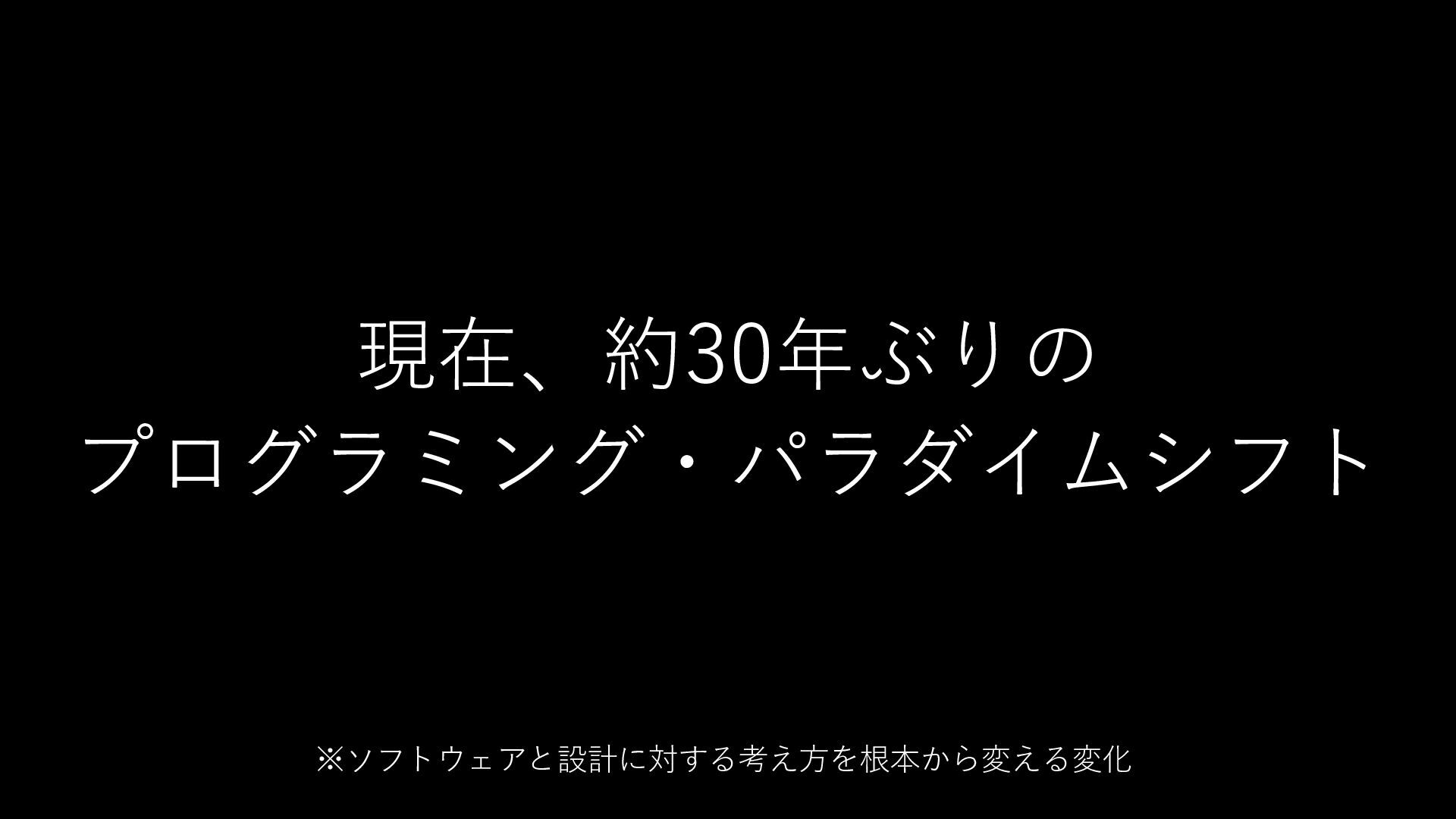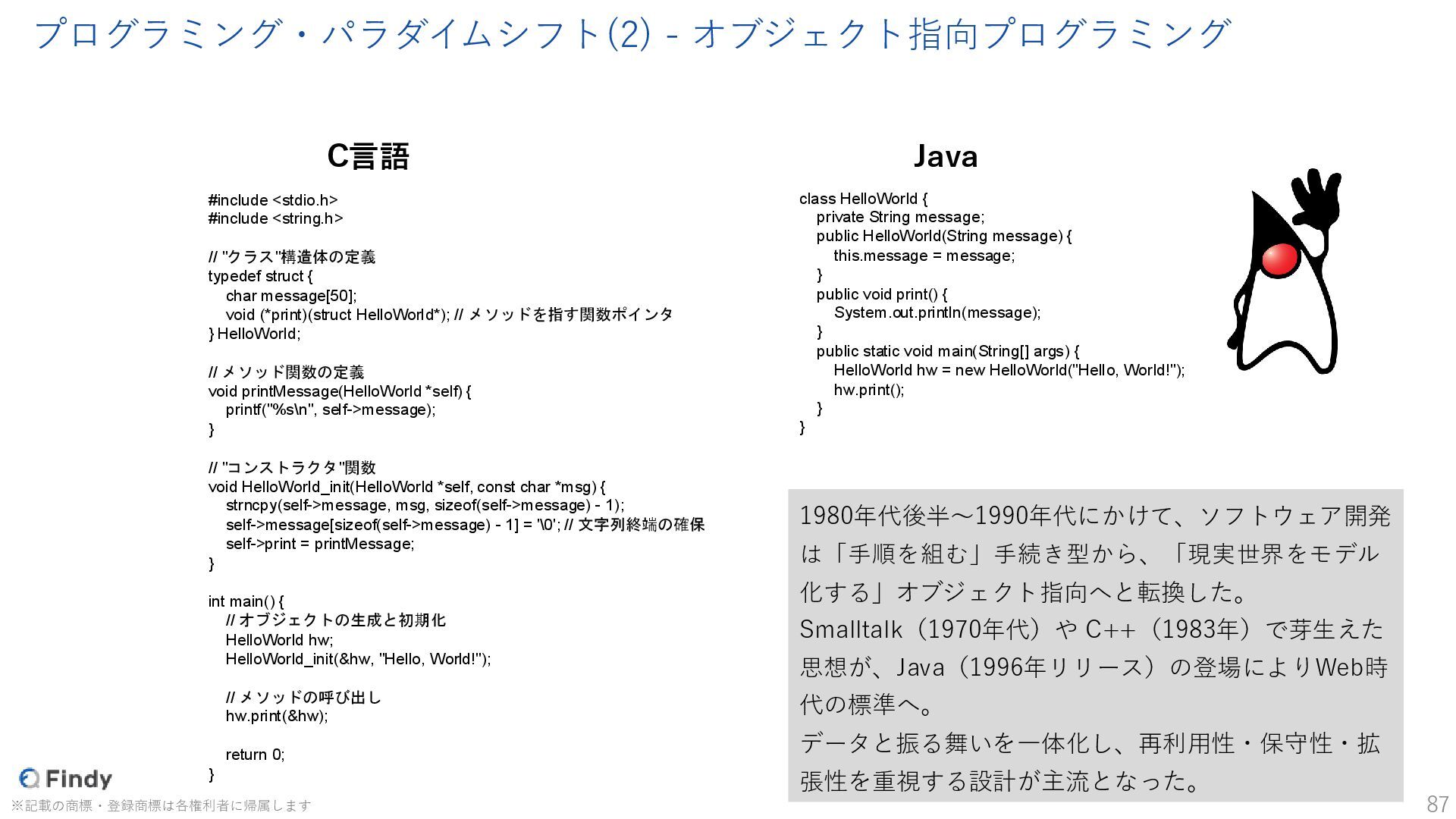"クラス"構造体の定義 typedef struct { char message[50]; void (*print)(struct HelloWorld*); // メソッドを指す関数ポインタ } HelloWorld; // メソッド関数の定義 void printMessage(HelloWorld *self) { printf("%s\n", self->message); } // "コンストラクタ"関数 void HelloWorld_init(HelloWorld *self, const char *msg) { strncpy(self->message, msg, sizeof(self->message) - 1); self->message[sizeof(self->message) - 1] = '\0'; // 文字列終端の確保 self->print = printMessage; } int main() { // オブジェクトの生成と初期化 HelloWorld hw; HelloWorld_init(&hw, "Hello, World!"); // メソッドの呼び出し hw.print(&hw); return 0; } C言語 class HelloWorld { private String message; public HelloWorld(String message) { this.message = message; } public void print() { System.out.println(message); } public static void main(String[] args) { HelloWorld hw = new HelloWorld("Hello, World!"); hw.print(); } } Java 1980年代後半〜1990年代にかけて、ソフトウェア開発 は「手順を組む」手続き型から、「現実世界をモデル 化する」オブジェクト指向へと転換した。 Smalltalk(1970年代)や C++(1983年)で芽生えた 思想が、Java(1996年リリース)の登場によりWeb時 代の標準へ。 データと振る舞いを一体化し、再利用性・保守性・拡 張性を重視する設計が主流となった。