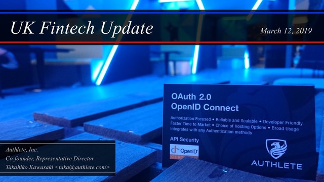 Establishes Authlete, Inc. Sep. 2016 ! Establishes Authlete UK, Ltd. Nov. 2016 ! Joins FINOLAB Feb. 2017 ! Joins OpenID Foundation Mar. 2017 ! Wins FIBC 2017 Grand Prize May 2017 ! Joins Level39 May 2017 ! Fund Raising (seed round) Jul. 2017 ! Gets OpenID Certification Aug. 2017 ! Cyber39 Founding Member Sep. 2017 ! Tech in Asia Tokyo 2017 Finalist Feb. 2018 ! Fund Raising (pre-series A) Apr. 2018 ! Wins IBM Prize at Draper Nexus B2B Summit 2018 Jul. 2018 ! Joins Fintech Association of Japan Jul. 2018 ! Organizes Japan/UK Open Banking and APIs Summit 2018 Jul. 2018 ! Supports Financial-grade API (Authlete 2.0) Aug. 2018 ! Passes Open Banking Security Profile Test Jan. 2019 ! Supervises "OAuth " (book) Feb. 2019 ! Supports CIBA 2 Name Authlete, Inc. Establishment September 18, 2015 Capital 444,710,000 JPY (including the capital reserve) Representative Takahiko Kawasaki Company Profile Offices Tokyo FINOLAB, Otemachi Bldg 4F, Otemachi 1-6-1, Chiyoda-ku, Tokyo, 100-0004, Japan London Level39, One Canada Square, Canary Wharf, London E14 5AB, UK History Team Takahiko Kawasaki – co-founder, software engineer Ali Adnan – co-founder, multilingual serial entrepreneur Joseph Heenan – lead of official OpenID test suite Justin Richer – author of "OAuth 2 in Action" Tatsuo Kudo – digital identity professional and others