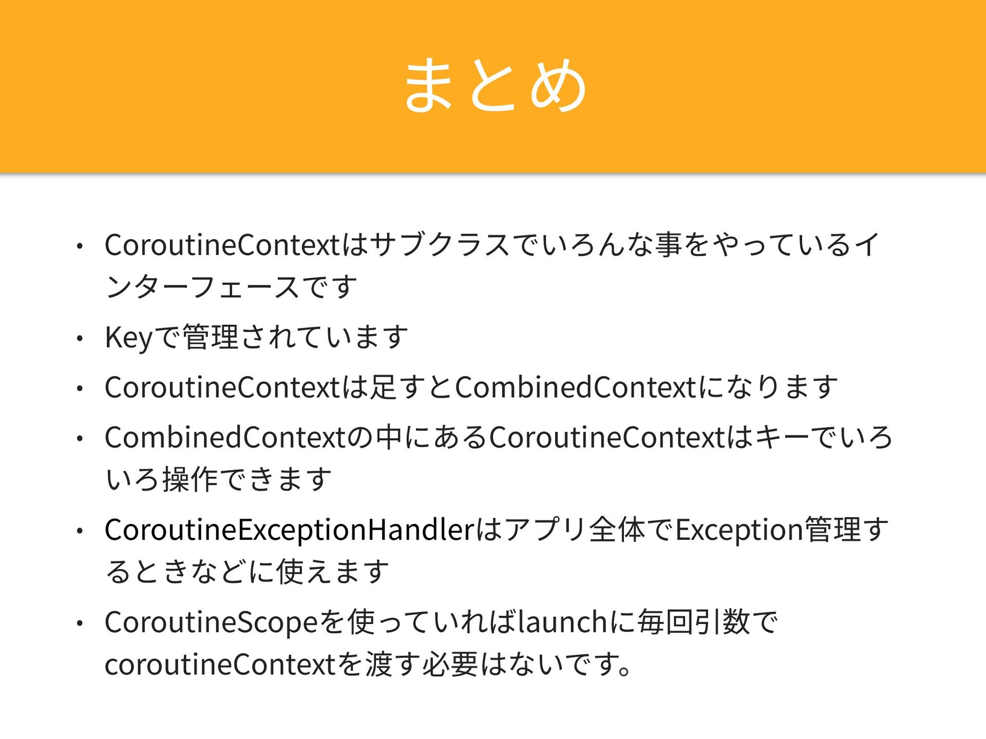 18. まとめ • CoroutineContextはサブクラスでいろんな事をやっているイ ンターフェースです • Keyで管理されています • CoroutineContextは⾜すとCombinedContextになります • CombinedContextの中にあるCoroutineContextはキーでいろ