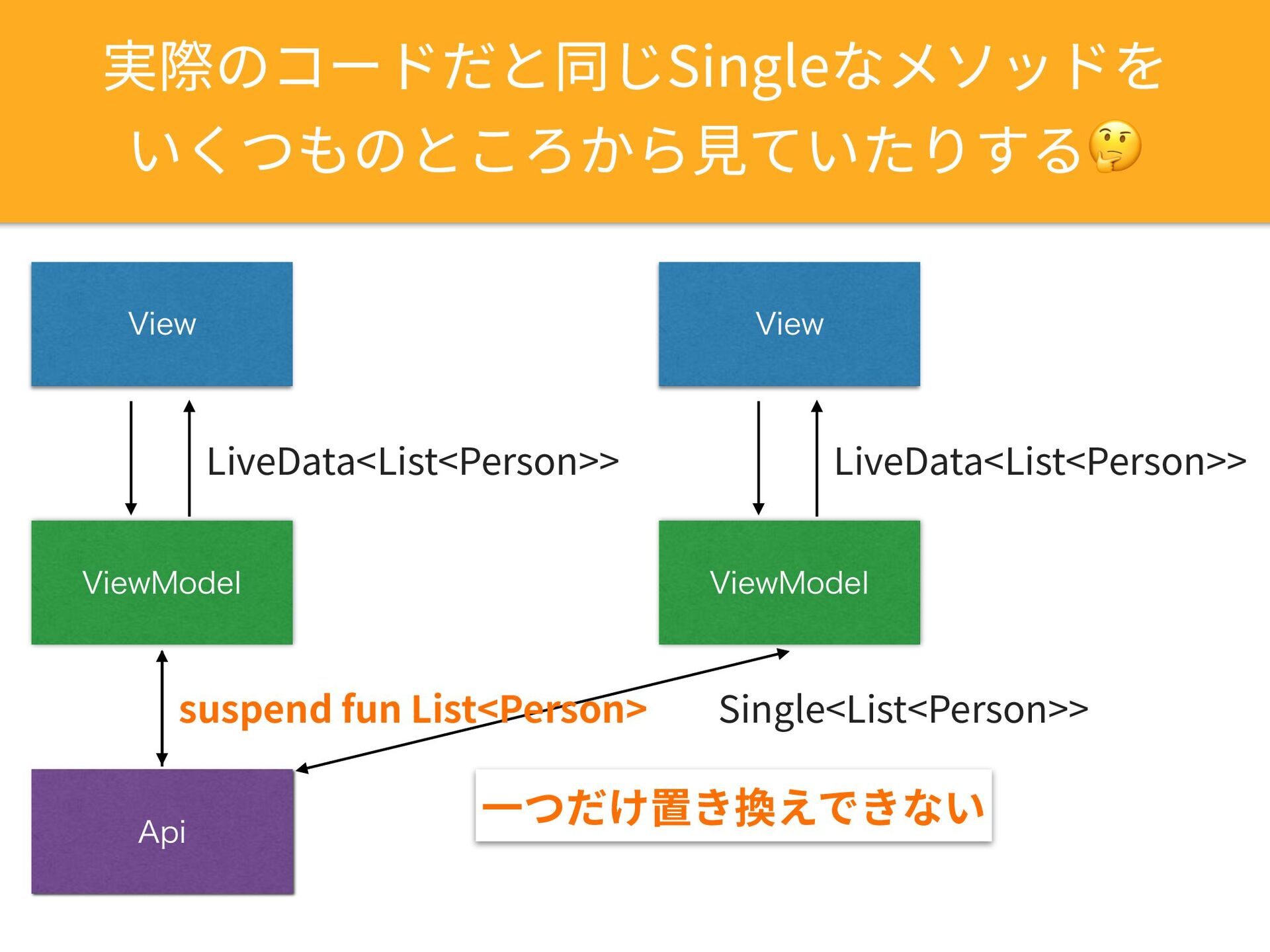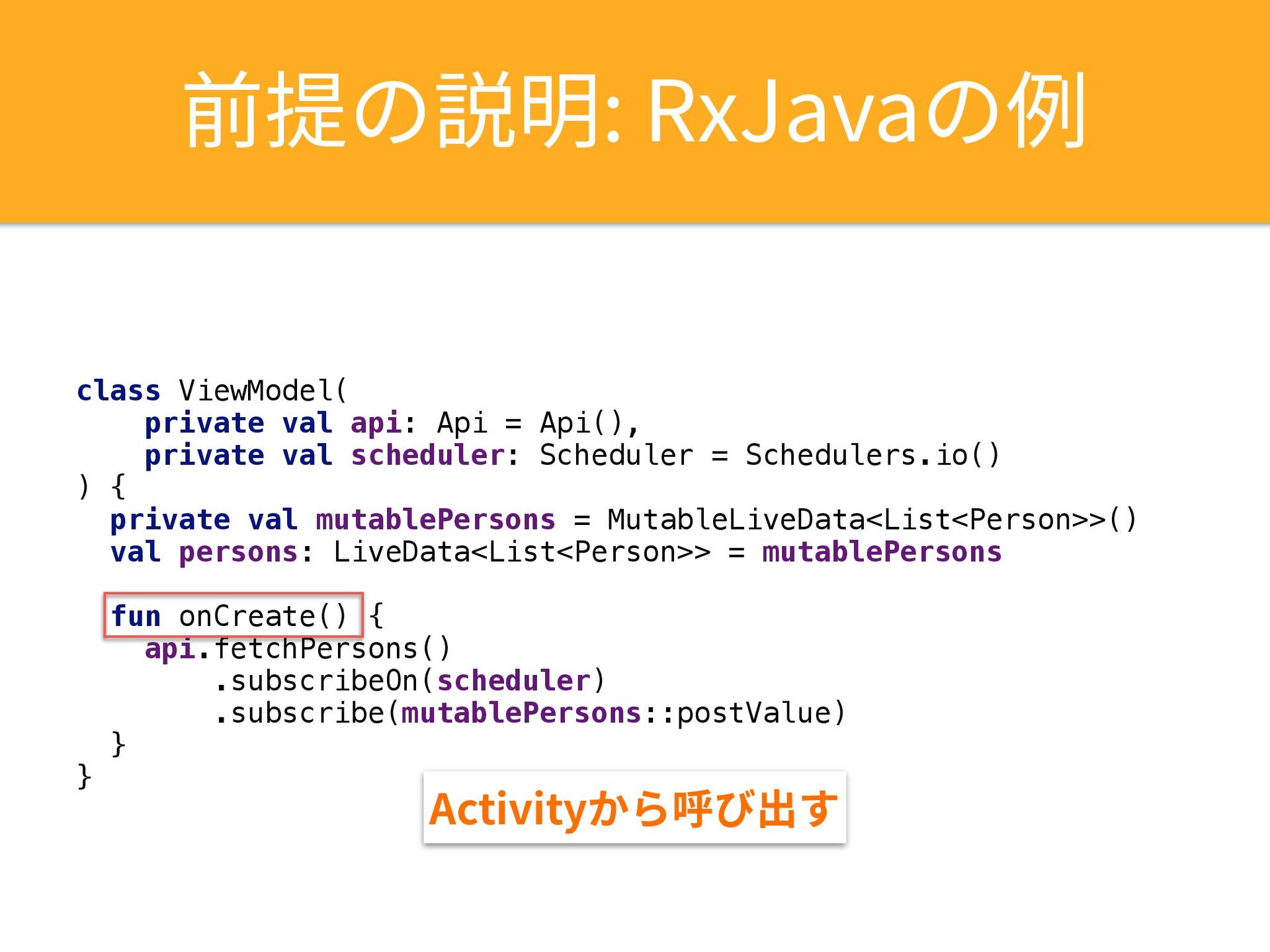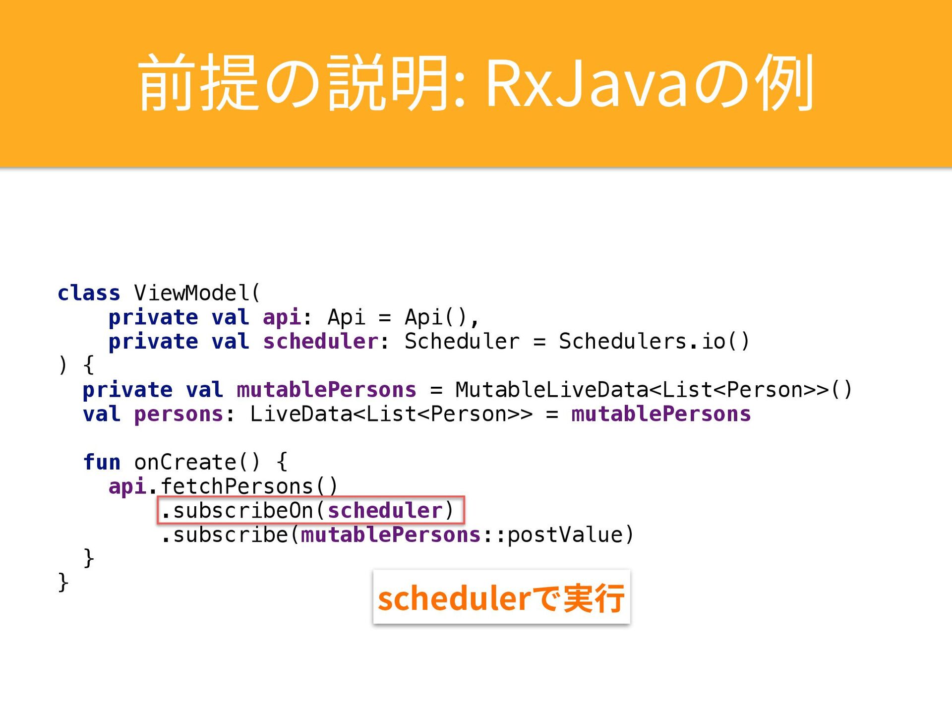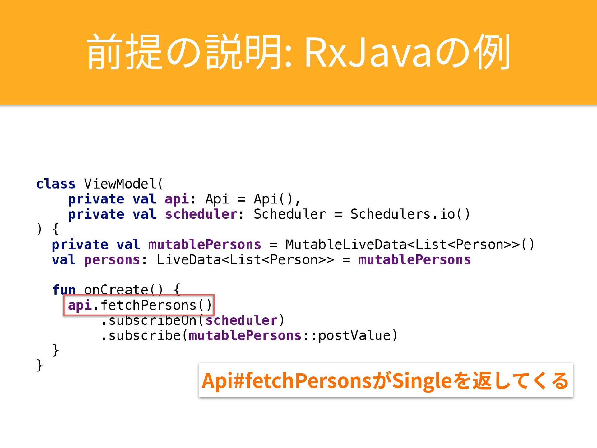 private val scheduler: Scheduler = Schedulers.io() ) { private val mutablePersons = MutableLiveData<List<Person>>() val persons: LiveData<List<Person>> = mutablePersons fun onCreate() { api.fetchPersons() .subscribeOn(scheduler) .subscribe(mutablePersons::postValue) }} }} Api#fetchPersonsがSingleを返してくる