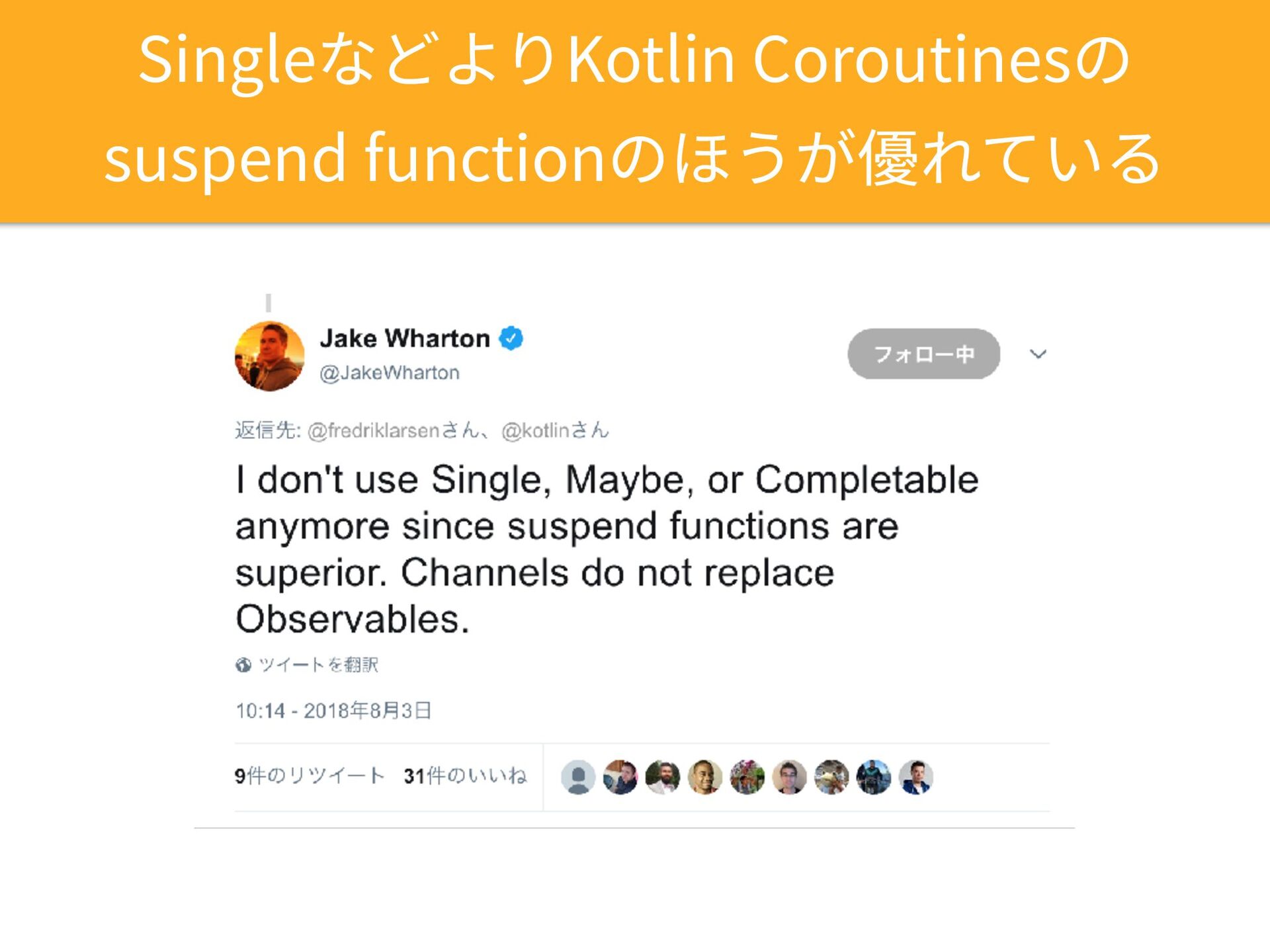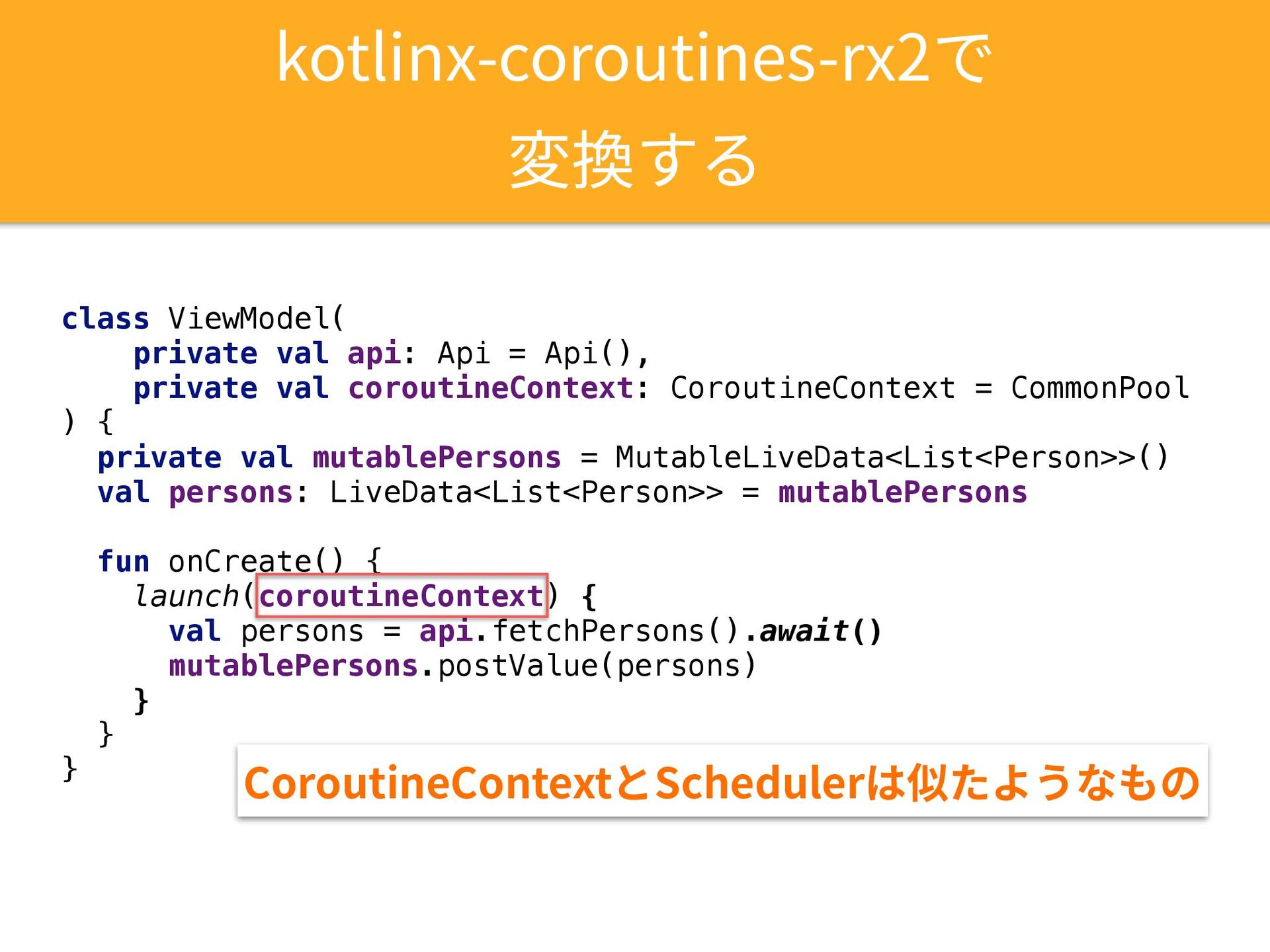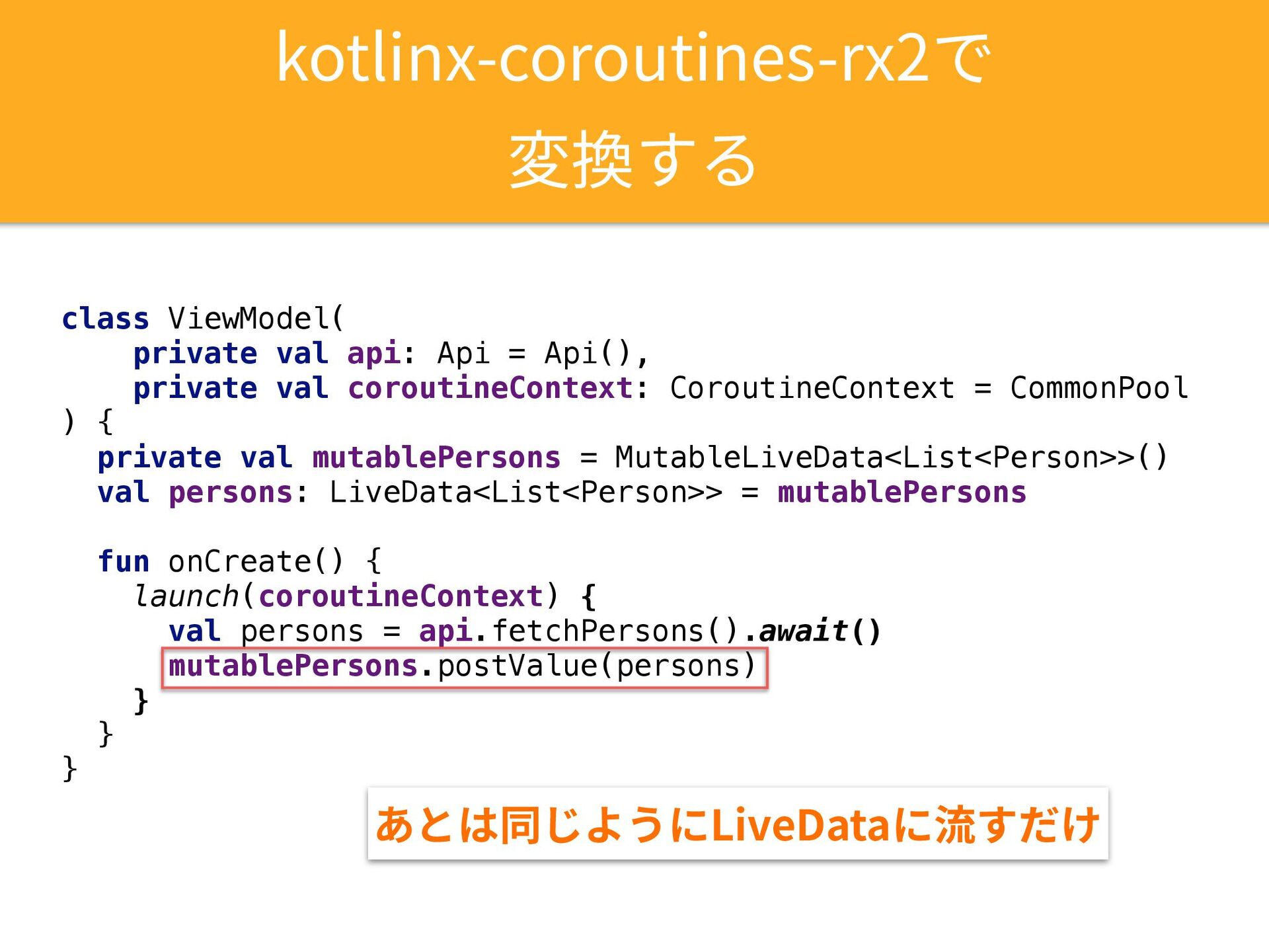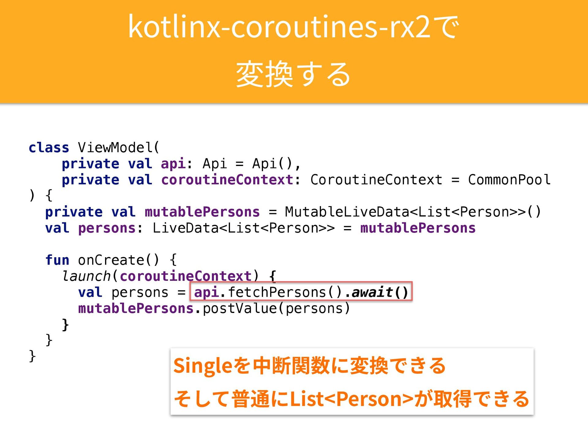 private val scheduler: Scheduler = Schedulers.io() ) { private val mutablePersons = MutableLiveData<List<Person>>() val persons: LiveData<List<Person>> = mutablePersons fun onCreate() { api.fetchPersons() .subscribeOn(scheduler) .subscribe(mutablePersons::postValue) }} }} Api#fetchPersonsがSingleを返してくる