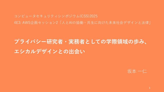 プライバシー研究者・実務者としての学際領域の歩み、 エシカルデザインとの出会い 坂本 一仁 1 コンピュータセキュリティシンポジウム(CSS)2025 4E3: AWS企画セッション2「人とAIの協働・共生に向けた未来社会デザインと法律」