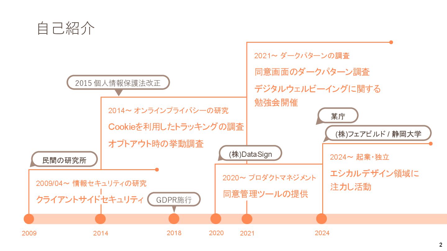 2015 個人情報保護法改正 GDPR施行 2021〜 ダークパターンの調査 同意画面のダークパターン調査 デジタルウェルビーイングに関する 勉強会開催 2020〜 プロダクトマネジメント 同意管理ツールの提供 (株)フェアビルド / 静岡大学 2024〜 起業・独立 エシカルデザイン領域に 注力し活動 (株)DataSign 某庁 2009 2018 2020 2021 2014 2024