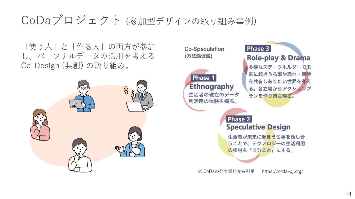 11 CoDaプロジェクト (参加型デザインの取り組み事例) 「使う人」と「作る人」の両方が参加 し、パーソナルデータの活用を考える Co-Design (共創) の取り組み。 ※ CoDaの発表資料から引用
